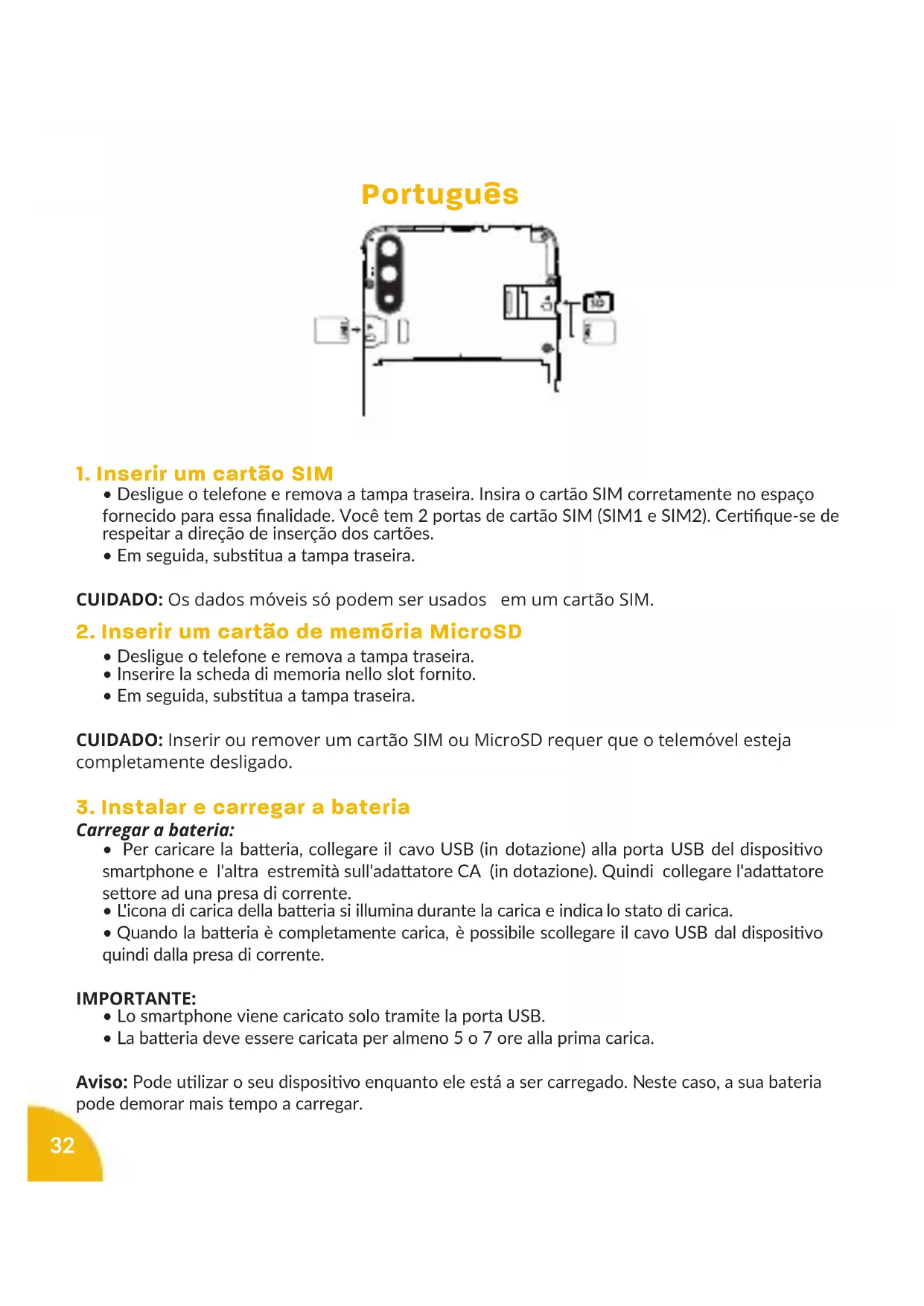 - La baeria deve essere caricata per almeno 5 o 7 ore alla prima carica. Aviso: Pode ulizar o seu disposivo enquanto ele está a ser carregado. Neste caso, a sua bateria pode demorar mais tempo a carregar. Português
