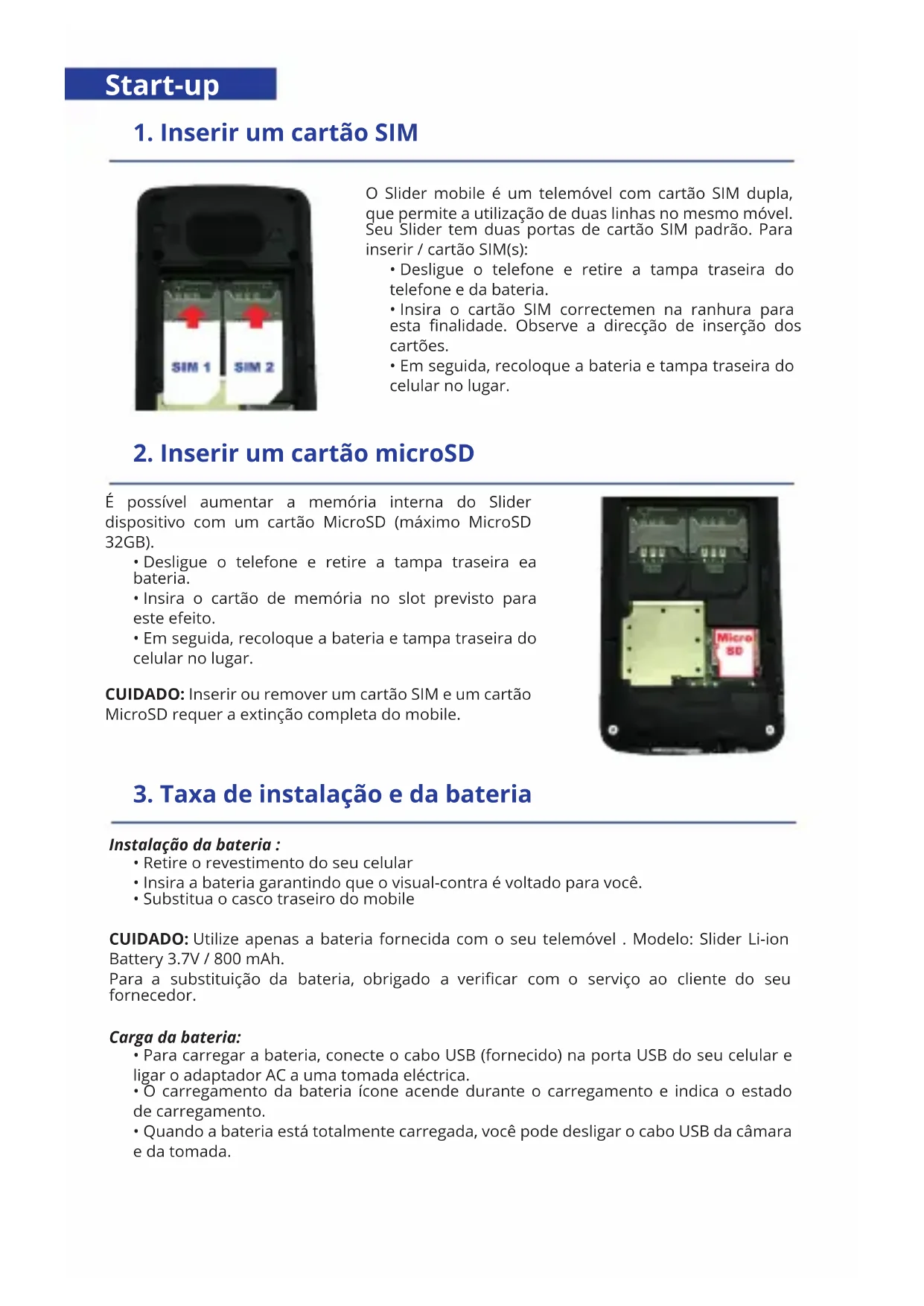 - Substitua o casco traseiro do mobile CUIDADO: Utilize apenas a bateria fornecida com o seu telemóvel . Modelo: Slider Li-ion Battery 3.7V / 800 mAh. Para a substituição da bateria, obrigado a vericar com o serviço ao cliente do seu fornecedor. Carga da bateria: