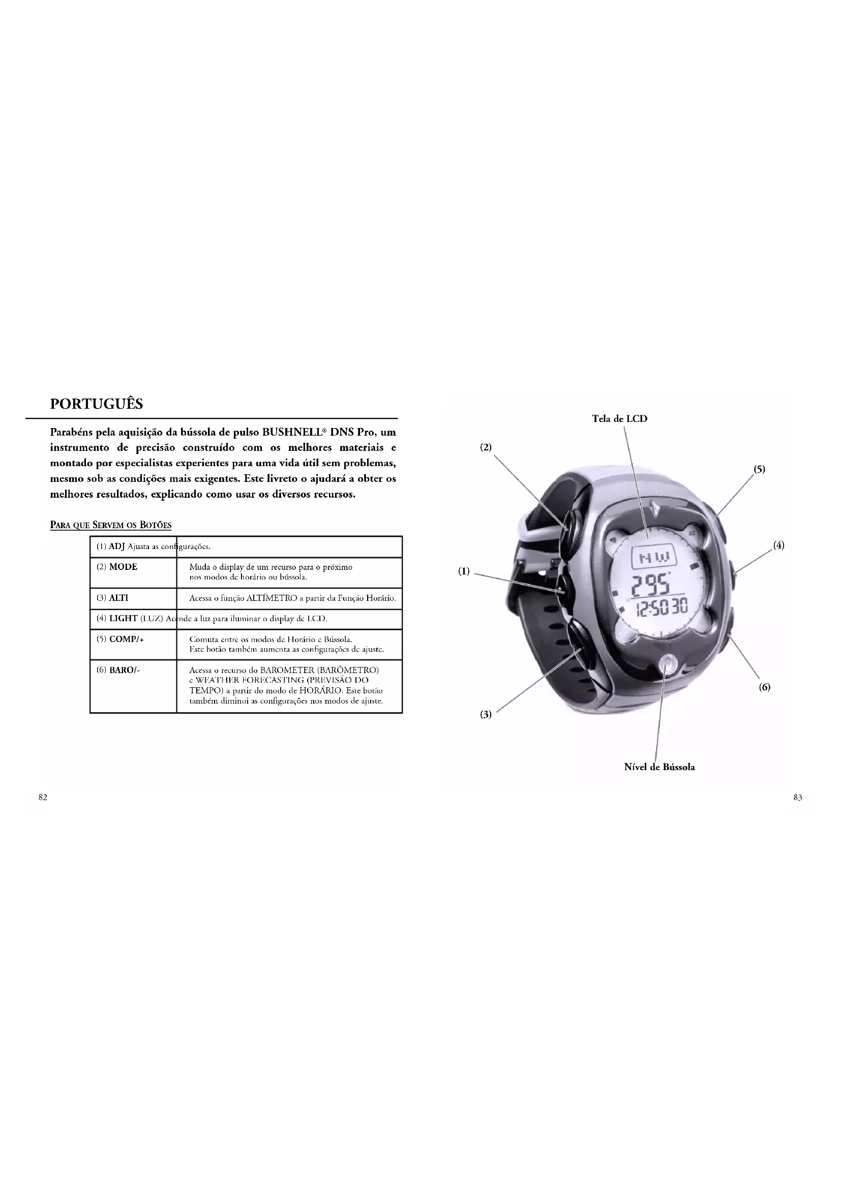 (1) ADJ Ajusta as configurações. (2) MODE Muda o display de um recurso para o próximo nos modos de horário ou bússola. (3) ALTI Acessa o função ALTÍMETRO a partir da Função Horário. (4) LIGHT (LUZ) Acende a luz para iluminar o display de LCD. (5) COMP/+ Comuta entre os modos de Horário e Bússola. Este botão também aumenta as configurações de ajuste. (6) BARO/- Acessa o recurso do BAROMETER (BARÔMETRO) e WEATHER FORECASTING (PREVISÃO DO TEMPO) a partir do modo de HORÁRIO. Este botão também diminui as configurações nos modos de ajuste.