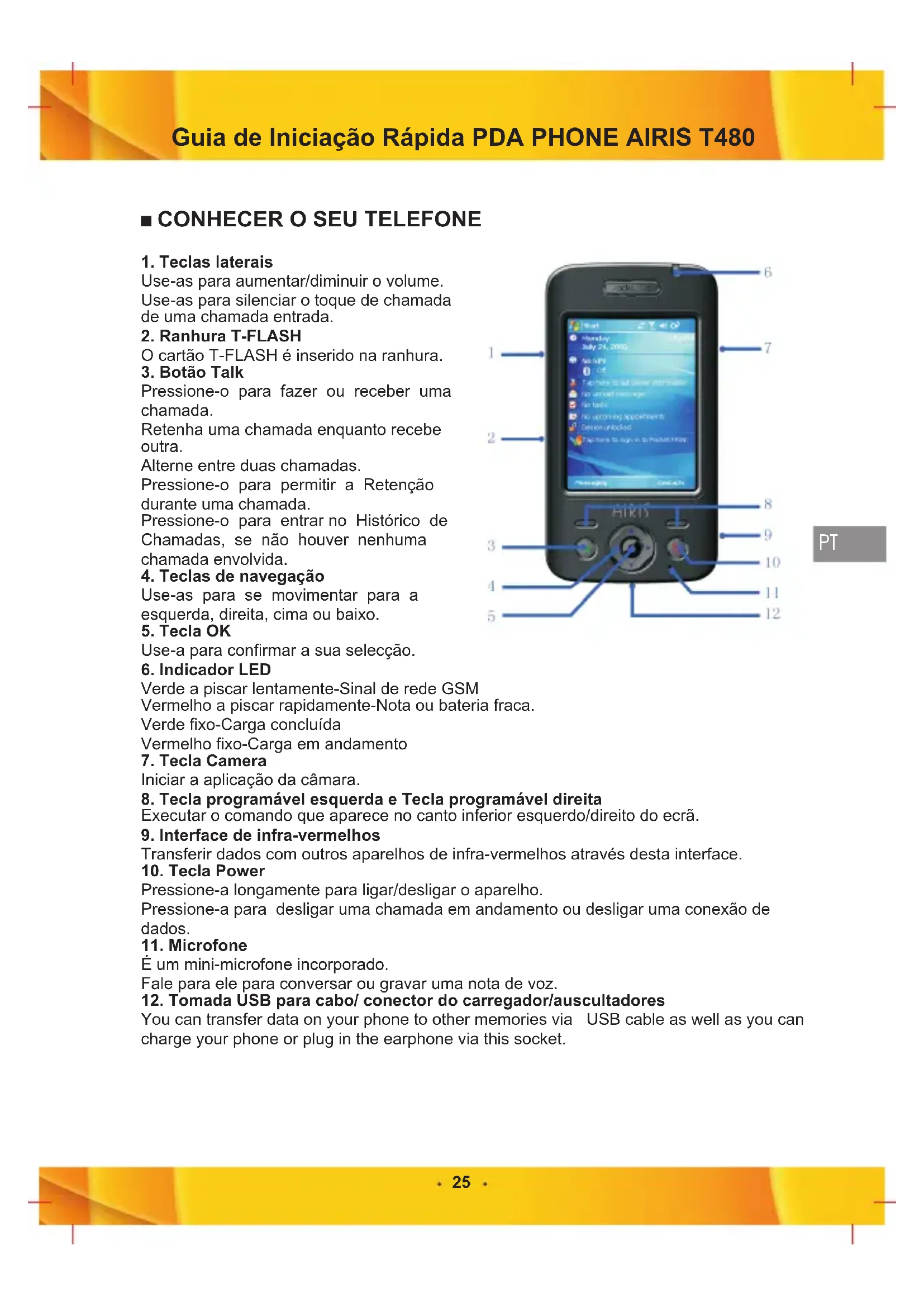 1. Teclas lateraisUse-as para aumentar/diminuir o volume.Use-as para silenciar o toque de chamada de uma chamada entrada.2. Ranhura T-FLASH O cartão T-FLASH é inserido na ranhura.3. Botão Talk Pressione-o para fazer ou receber uma chamada.Retenha uma chamada enquanto recebe outra.Alterne entre duas chamadas.Pressione-o para permitir a Retenção durante uma chamada.Pressione-o para entrar no Histórico de Chamadas, se não houver nenhuma chamada envolvida.4. Teclas de navegaçãoUse-as para se movimentar para a esquerda, direita, cima ou baixo. 5. Tecla OK Use-a para confirmar a sua selecção.6. Indicador LED Verde a piscar lentamente-Sinal de rede GSM Vermelho a piscar rapidamente-Nota ou bateria fraca.Verde fixo-Carga concluídaVermelho fixo-Carga em andamento7. Tecla CameraIniciar a aplicação da câmara.8. Tecla programável esquerda e Tecla programável direitaExecutar o comando que aparece no canto inferior esquerdo/direito do ecrã.9. Interface de infra-vermelhosTransferir dados com outros aparelhos de infra-vermelhos através desta interface.10. Tecla Power Pressione-a longamente para ligar/desligar o aparelho.Pressione-a para desligar uma chamada em andamento ou desligar uma conexão de dados.11. MicrofoneÉ um mini-microfone incorporado.Fale para ele para conversar ou gravar uma nota de voz.12. Tomada USB para cabo/ conector do carregador/auscultadores You can transfer data on your phone to other memories via USB cable as well as you can charge your phone or plug in the earphone via this socket. Guia de Iniciação Rápida PDA PHONE AIRIS T480 PT26