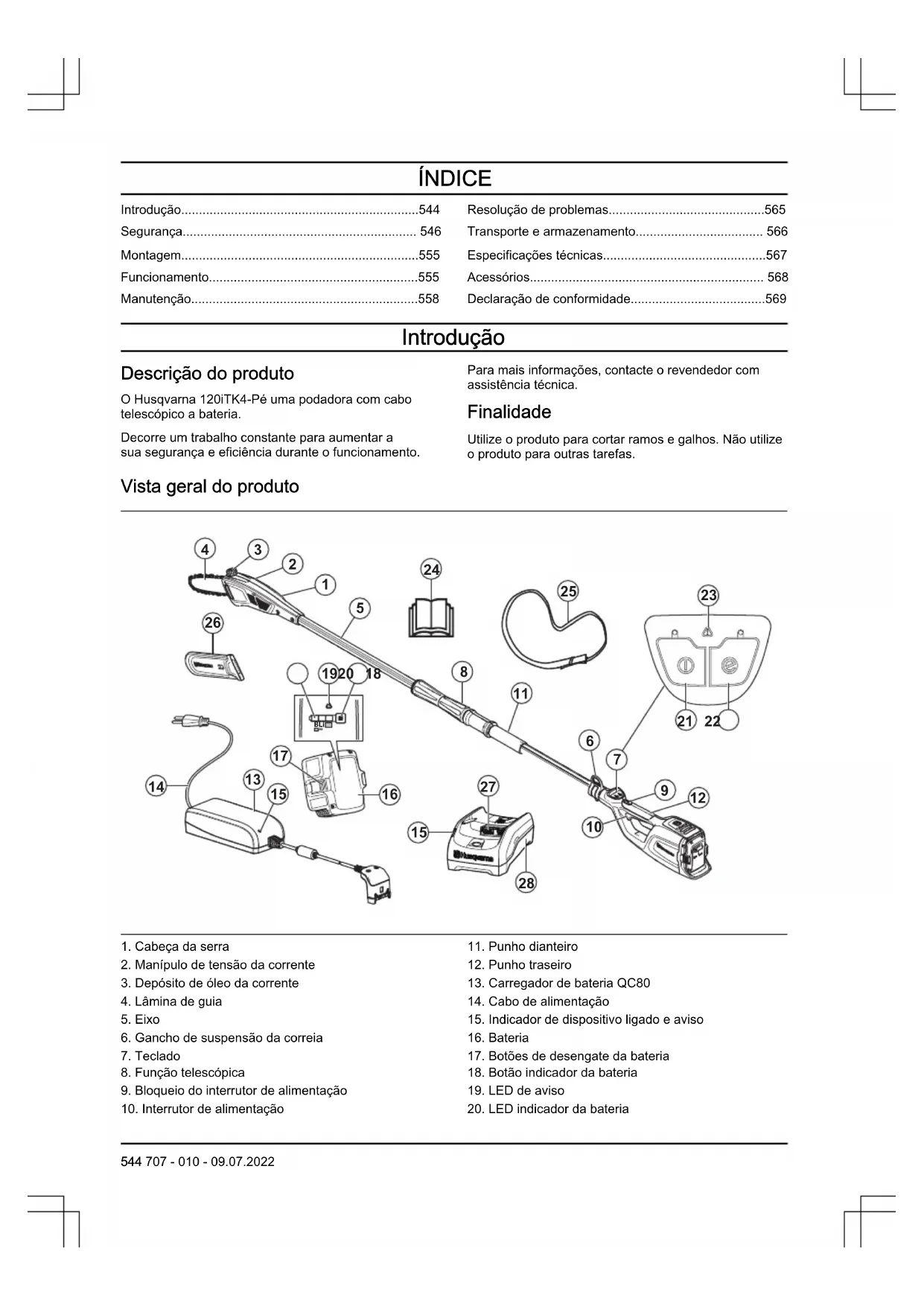 - Declaração de conformidade Introdução Descrição do produto O Husqvarna 120iTK4-Pé uma podadora com cabo telescópico a bateria. Decorre um trabalho constante para aumentar a sua segurança e eficiência durante o funcionamento. Para mais informações, contacte o revendedor com assistência técnica. Finalidade Utilize o produto para cortar ramos e galhos. Não utilize o produto para outras tarefas. Vista geral do produto p. 569