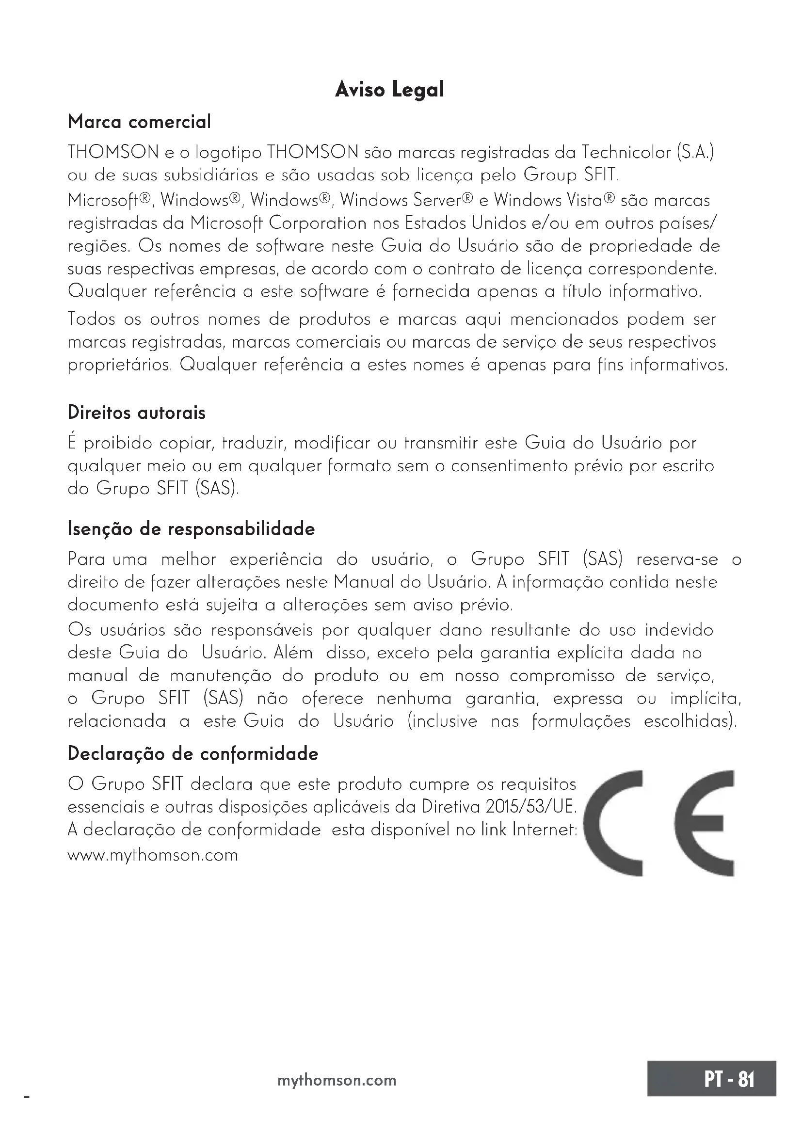 mythomson.com Aviso Legal Marca comercial THOMSON e o logotipo THOMSON são marcas registradas da Technicolor (S.A.) ou de suas subsidiárias e são usadas sob licença pelo Group SFIT. Microsoft®, Windows®, Windows®, Windows Server® e Windows Vista® são marcas registradas da Microsoft Corporation nos Estados Unidos e/ou em outros países/ regiões. Os nomes de software neste Guia do Usuário são de propriedade de suas respectivas empresas, de acordo com o contrato de licença correspondente. Qualquer referência a este software é fornecida apenas a título informativo. Todos os outros nomes de produtos e marcas aqui mencionados podem ser marcas registradas, marcas comerciais ou marcas de serviço de seus respectivos proprietários. Qualquer referência a estes nomes é apenas para ns informativos. Direitos autorais É proibido copiar, traduzir, modicar ou transmitir este Guia do Usuário por qualquer meio ou em qualquer formato sem o consentimento prévio por escrito do Grupo SFIT (SAS). Isenção de responsabilidade Para uma melhor experiência do usuário, o Grupo SFIT (SAS) reserva-se o direito de fazer alterações neste Manual do Usuário. A informação contida neste documento está sujeita a alterações sem aviso prévio. Os usuários são responsáveis por qualquer dano resultante do uso indevido deste Guia do Usuário. Além disso, exceto pela garantia explícita dada no manual de manutenção do produto ou em nosso compromisso de serviço, o Grupo SFIT (SAS) não oferece nenhuma garantia, expressa ou implícita, relacionada a este Guia do Usuário (inclusive nas formulações escolhidas). Declaração de conformidade O Grupo SFIT declara que este produto cumpre os requisitos essenciais e outras disposições aplicáveis da Diretiva 2015/53/UE. A declaração de conformidade esta disponível no link Internet: www.mythomson.com82 - PT Manual do Usuário - Neo360 - 11.6’’ mythomson.com - Instruções de segurança importantes - Esta unidade deve ser utilizada num ambiente com uma temperatura ambiente entre 5°C (41°F) e 35°C (95°F). Não exponha a unidade à chuva ou humidade e mantenha-a afastada de líquidos. Em caso de salpicos de água ou outro líquido na unidade, desligue-a imediatamente e aguarde até que esteja completamente seca antes de a ligar novamente. Não exponha o aparelho diretamente à radiação solar Não utilize solventes fortes, detergentes líquidos ou outros produtos químicos sobre ou perto da superfície da unidade para evitar a corrosão ou deterioração da superfície da unidade. Não exponha a máquina a ambientes poeirentos. Não utilize a unidade durante uma fuga de gás. Não exponha o dispositivo a campos magnéticos ou elétricos fortes. Você pode operar o dispositivo através de detectores de raios X do aeroporto. No entanto, recomenda-se que não passe o seu dispositivo através dos portais de detecção magnética nem o exponha a detetores portáteis. Não coloque quaisquer objetos sobre o dispositivo. Não coloque a unidade sobre uma superfície irregular ou instável. Certique-se de que protege a unidade de quedas ou qualquer outro impacto que a possa danicar. Não deixe o aparelho sobre ou carregado no seu colo ou em qualquer outra parte do seu corpo para evitar qualquer risco de lesões relacionadas com o calor. Desligue o aparelho antes de o transportar ou de o cobrir com um material que não permita uma circulação de ar óptima. Não utilize cabos de alimentação, acessórios ou outros dispositivos danicados com o seu aparelho. Recomendamos a utilização exclusiva dos acessórios (alimentação eléctrica, cabos, etc.) fornecidos com o aparelho.PT - 83 mythomson.com Utilize apenas baterias originais. A substituição da bateria por uma bateria incorreta pode causar risco de explosão. Não desmonte, modique ou repare a unidade por conta própria, pois isso pode anular a garantia. Por favor, faça cópias de segurança do seu conteúdo importante regularmente para evitar a perda de dados. A nossa empresa não aceita qualquer responsabilidade pela perda ou remoção de itens contidos no dispositivo devido à utilização inadequada do hardware ou software, falta de manutenção ou qualquer outro evento acidental. Na potência máxima, o uso prolongado de ouvir o leitor de música pode danicar o ouvido do usuário. Este produto foi concebido para permitir a reciclagem adequada de peças e componentes. O símbolo que representa um caixote do lixo com uma cruz indica que o dispositivo não deve ser eliminado juntamente com o lixo municipal. Consulte os regulamentos locais para descarte de dispositivos eletrônicos. O símbolo que representa um caixote do lixo com uma cruz indica que a bateria não deve ser eliminada juntamente com os resíduos municipais. Consulte os regulamentos locais para a eliminação da bateria.84 - PT Manual do Usuário - Neo360 - 11.6’’ mythomson.com