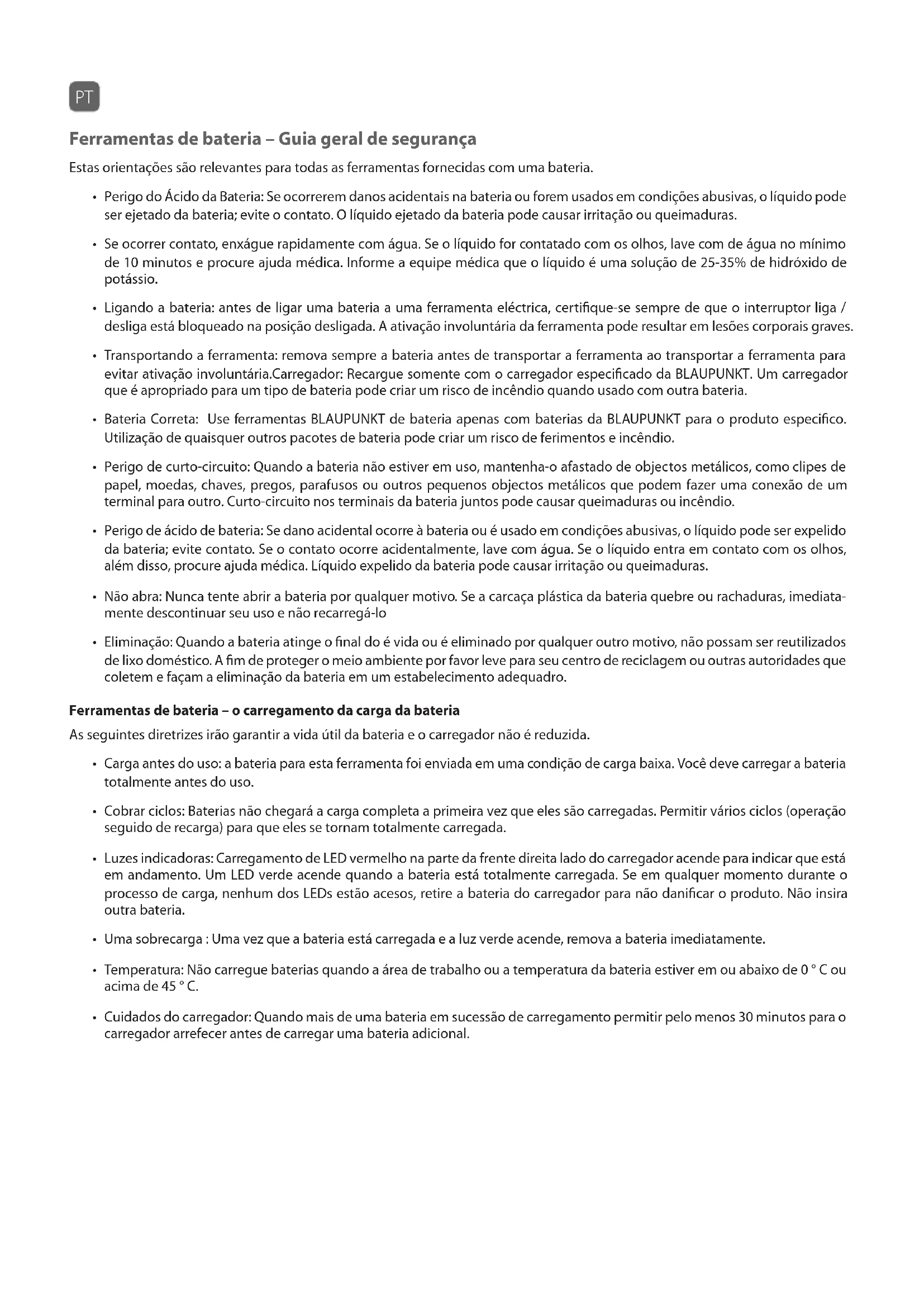 Montagem da bateria Deslize a bateria na posição na ferramenta ou no carregador até ouvir um som ' clic '. Remover a bateria Para remover a bateria, solte-a do botão de bloqueio pressionando a trava e deslize-a. Manutenção As baterias foram projetadas para fornecer sem problemas vida. Entanto como todas as baterias que acabarão por se desgastar. Não tente efectuar manutenção nas baterias e contacte o seu revendedor para aconselhamento. Armazenamento A bateria deve ser armazenada em um local seco, onde a temperatura é superior a 4 ° c e abaixo de 27 ° c. Armazene baterias em uma condição carregada (mínimo de 30-50%) Para carregar a bateria após mais de 6 meses de armazenamento, recomenda-se a descarga da bateria em pelo menos 10-20% (executando-a em uma ferramenta) e carrega-se totalmente depois para maximizar a vida útil da bateria. Especicações do produtoLI-ION Símbolos O manual ou placa de classificação na sua ferramenta pode mostrar símbolos. Estes representam informações importantes sobre o produto ou instruções sobre o seu uso. Você deve ler o manual de instruções Usar calçado de protecção Usar a proteção de ouvido Usar luvas de segurança Usar a roupa protetora Usar máscara de segurança Usar proteção ocular Usar proteção de cabeça Usar proteção respiratória O produto é compatível com as normas de segurança CE O produto é compatível com RoHS segurança padrões Advertência geral Dispor de acordo com as normas de WEEE Contém bateria de Lithium-Ion O produto é isolado dobro Perigo de incêndio Perigo de electrocussãoDisposição Não descarte em lixo geral. Tal como indicado na Directiva Europeia 2012/19/UE para os resíduos de equipamentos eléctricos e electrónicos, este produto deve ser eliminado de uma forma segura para o meio ambiente. Recomendamos levá-lo para uma instalação de reciclagem. Importado e Distribuído por: SKN Europa LDA. Travessa da Trindade 16 - 4B, Chiado, Lisboa, Portugal 1200-469 Email: apoiocliente@bp-tools.pt Internet: www.bp-tools.pt Garantia Este produto possui 3 anos de garantia para defeitos de fabricação. O período de garantia será contado a partir da data de compra do produto, de acordo com a factura de compra. A garantia do produto cobre apenas defeitos de fabricação, defeitos resultantes de uso impróprio, como cair, transporte inadequado, conexão à fonte de alimentação, não em conformidade com a tensão especifi- cada neste manual, inserção de objetos estranhos e desgaste natural de peças, peças de plástico (tampas, botões, alças, fechaduras de trava, cabos de alimentação, etc.) e peças metálicas (fios, motores, etc.). Também não cobertos são os danos devidos a agentes da natureza, raios, alimentos, mar, oxidação, humidade etc.). O produto perderá sua garantia se apresentar defeitos, que após a análise de nossos técnicos, são caracterizados como inadequadamente utilizados, utilizados para uso profissional ou para os fins para os quais não se destina (de acordo com o Manual do Proprietário). Esta garantia será anulada se verificar que o dispositivo foi adulterado, foi reparado por uma pessoa ou serviço não autorizado pela BLAUPUNKT. A garantia é válida somente com o recibo / fatura fornecido na compra. A BLAUPUNKT compromete-se a fornecer os serviços acima mencionados no período de garantia somente em locais onde ele mantenha um serviço autorizado. Os consumidores que não estão localizados perto de um centro de serviço autorizado devem ser responsáveis pelos custos e riscos de transporte para o serviço autorizado de sua escolha. O "desgaste" natural não está coberto pela garantia. Este produto é apenas para uso doméstico. need change to 6 monthsPL Narzędzia akumulatorowe — ogólna instrukcja bezpieczeństwa Instrukcja dotyczy wszystkich narzędzi sprzedawanych z akumulatorami przeznaczonymi do ich zasilania.