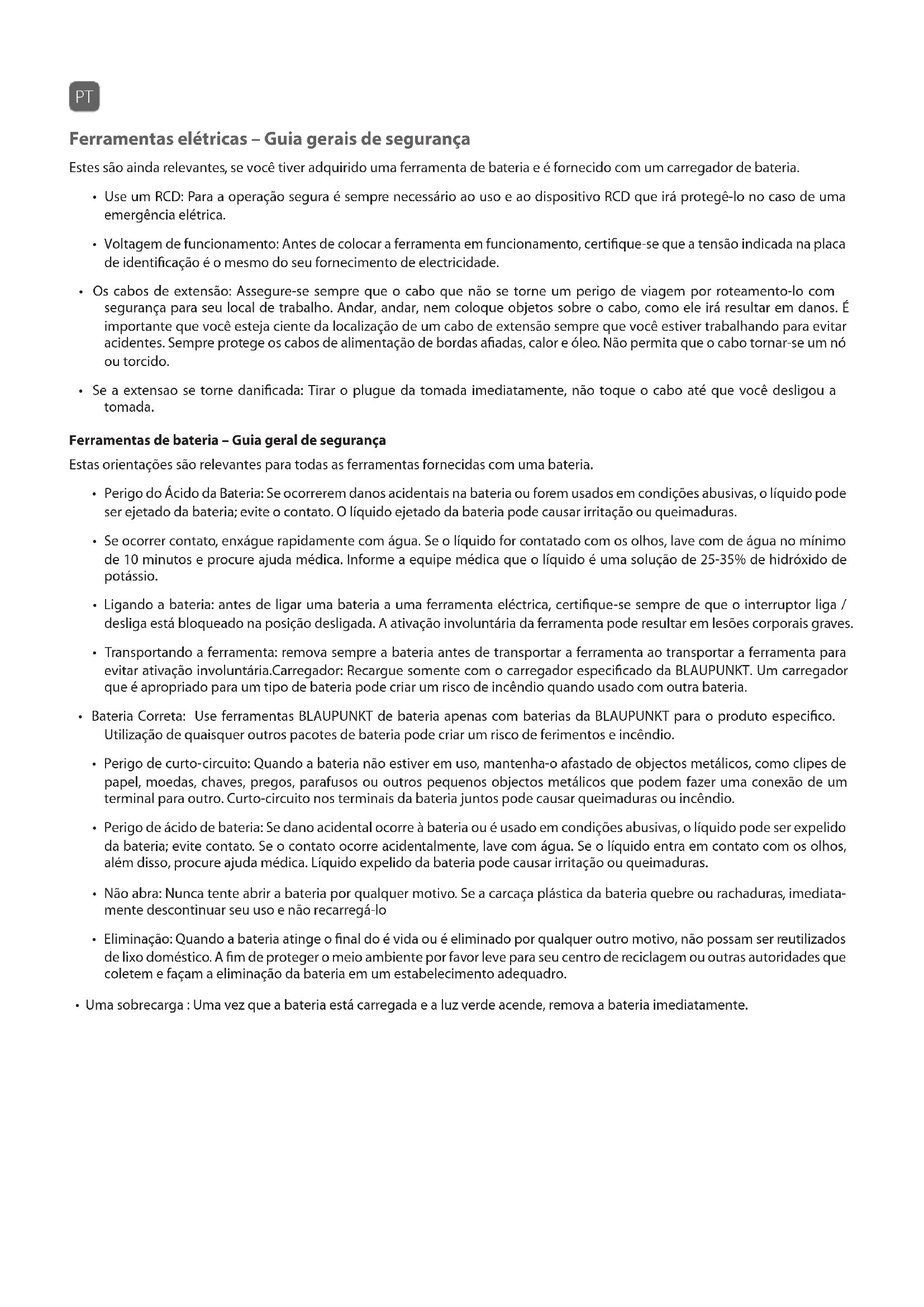 - O status de carregamento será indicado pelas luzes, conforme mostrado na tabela a seguir. Ferramentas com bateria – As luzes indicam o carregamento da bateria A tabela a seguir mostra o status de carregamento indicado pelas luzes LED no carregador. Luz verde 7) Luz vermelha 6) Bateria inserida Status de carregamento Acesa Apagada Não Carregador conectado à fonte de alimentação Apagada Acesa Sim Carregamento da bateria Acesa Apagada Sim Bateria totalmente carregada 1 Carregador 2 Bateria 3 Trava de fechamento/liberação 4 Saída de potência do transformador 5 Transformador 6 LED vermelho 7 LED verde Fig. 1LI-ION Símbolos O manual ou placa de classificação na sua ferramenta pode mostrar símbolos. Estes representam informações importantes sobre o produto ou instruções sobre o seu uso. Você deve ler o manual de instruções Usar calçado de protecção Usar a proteção de ouvido Usar luvas de segurança Usar a roupa protetora Usar máscara de segurança Usar proteção ocular Usar proteção de cabeça Usar proteção respiratória O produto é compatível com as normas de segurança CE O produto é compatível com RoHS segurança padrões Advertência geral Dispor de acordo com as normas de WEEE Contém bateria de Lithium-Ion O produto é isolado dobro Perigo de incêndio Perigo de electrocussãoDisposição Não descarte em lixo geral. Tal como indicado na Directiva Europeia 2012/19/UE para os resíduos de equipamentos eléctricos e electrónicos, este produto deve ser eliminado de uma forma segura para o meio ambiente. Recomendamos levá-lo para uma instalação de reciclagem. Garantia Este produto possui 3 anos de garantia para defeitos de fabricação. O período de garantia será contado a partir da data de compra do produto, de acordo com a factura de compra. A garantia do produto cobre apenas defeitos de fabricação, defeitos resultantes de uso impróprio, como cair, transporte inadequado, conexão à fonte de alimentação, não em conformidade com a tensão especifi- cada neste manual, inserção de objetos estranhos e desgaste natural de peças, peças de plástico (tampas, botões, alças, fechaduras de trava, cabos de alimentação, etc.) e peças metálicas (fios, motores, etc.). Também não cobertos são os danos devidos a agentes da natureza, raios, alimentos, mar, oxidação, humidade etc.). O produto perderá sua garantia se apresentar defeitos, que após a análise de nossos técnicos, são caracterizados como inadequadamente utilizados, utilizados para uso profissional ou para os fins para os quais não se destina (de acordo com o Manual do Proprietário). Esta garantia será anulada se verificar que o dispositivo foi adulterado, foi reparado por uma pessoa ou serviço não autorizado pela BLAUPUNKT. A garantia é válida somente com o recibo / fatura fornecido na compra. A BLAUPUNKT compromete-se a fornecer os serviços acima mencionados no período de garantia somente em locais onde ele mantenha um serviço autorizado. Os consumidores que não estão localizados perto de um centro de serviço autorizado devem ser responsáveis pelos custos e riscos de transporte para o serviço autorizado de sua escolha. O "desgaste" natural não está coberto pela garantia. Este produto é apenas para uso doméstico. Importado e Distribuído por: SKN Europa LDA. Travessa da Trindade 16 - 4B, Chiado, Lisboa, Portugal 1200-469 Email: apoiocliente@bp-tools.pt Internet: www.bp-tools.ptPL Narzędzia zasilane z sieci elektrycznej — ogólna instrukcja bezpieczeństwa Instrukcja ta dotyczy również narzędzi akumulatorowych, sprzedawanych z zasilanymi sieciowo ładowarkami akumulatorów w komplecie.