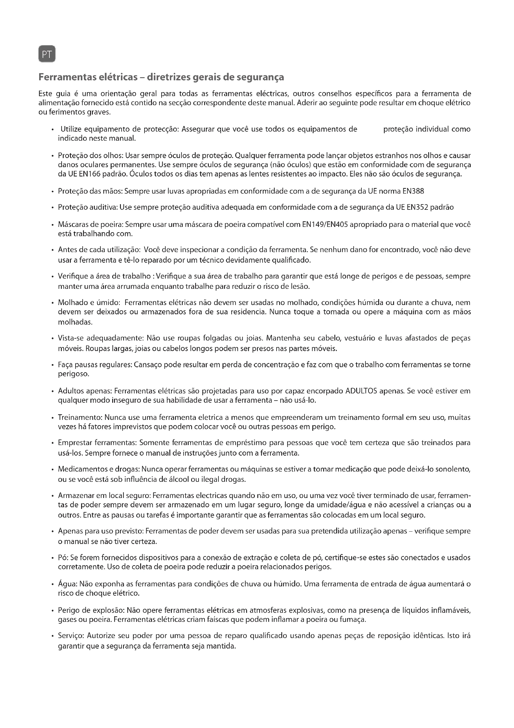 - Apenas para uso previsto: Ferramentas de poder devem ser usadas para sua pretendida utilização apenas – verifique sempre o manual se não tiver certeza.