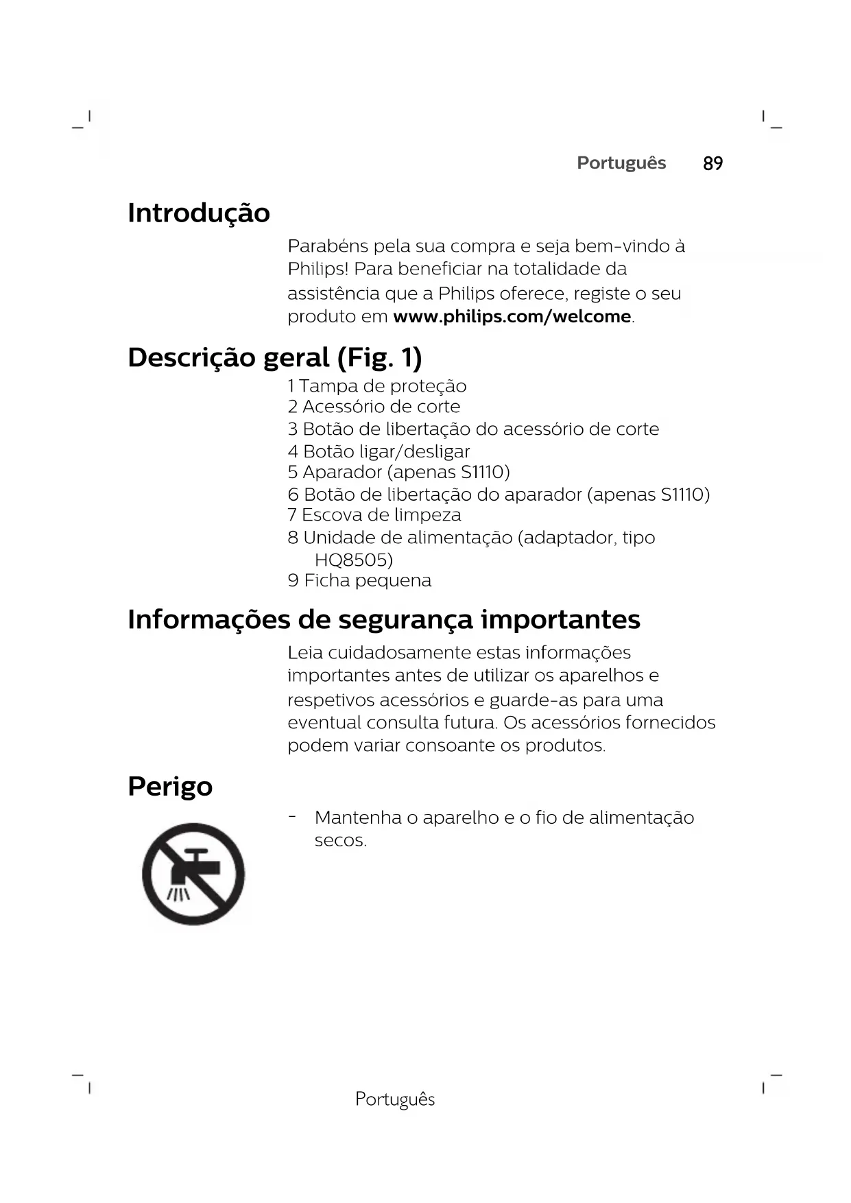 NorskPortuguês Introdução Parabéns pela sua compra e seja bem-vindo à Philips! Para beneficiar na totalidade da assistência que a Philips oferece, registe o seu produto em www.philips.com/welcome. Descrição geral (Fig. 1) 1 Tampa de proteção 2 Acessório de corte 3 Botão de libertação do acessório de corte 4 Botão ligar/desligar 5 Aparador (apenas S1110) 6 Botão de libertação do aparador (apenas S1110) 7 Escova de limpeza 8 Unidade de alimentação (adaptador, tipo HQ8505) 9 Ficha pequena Informações de segurança importantes Leia cuidadosamente estas informações importantes antes de utilizar os aparelhos e respetivos acessórios e guarde-as para uma eventual consulta futura. Os acessórios fornecidos podem variar consoante os produtos. Perigo