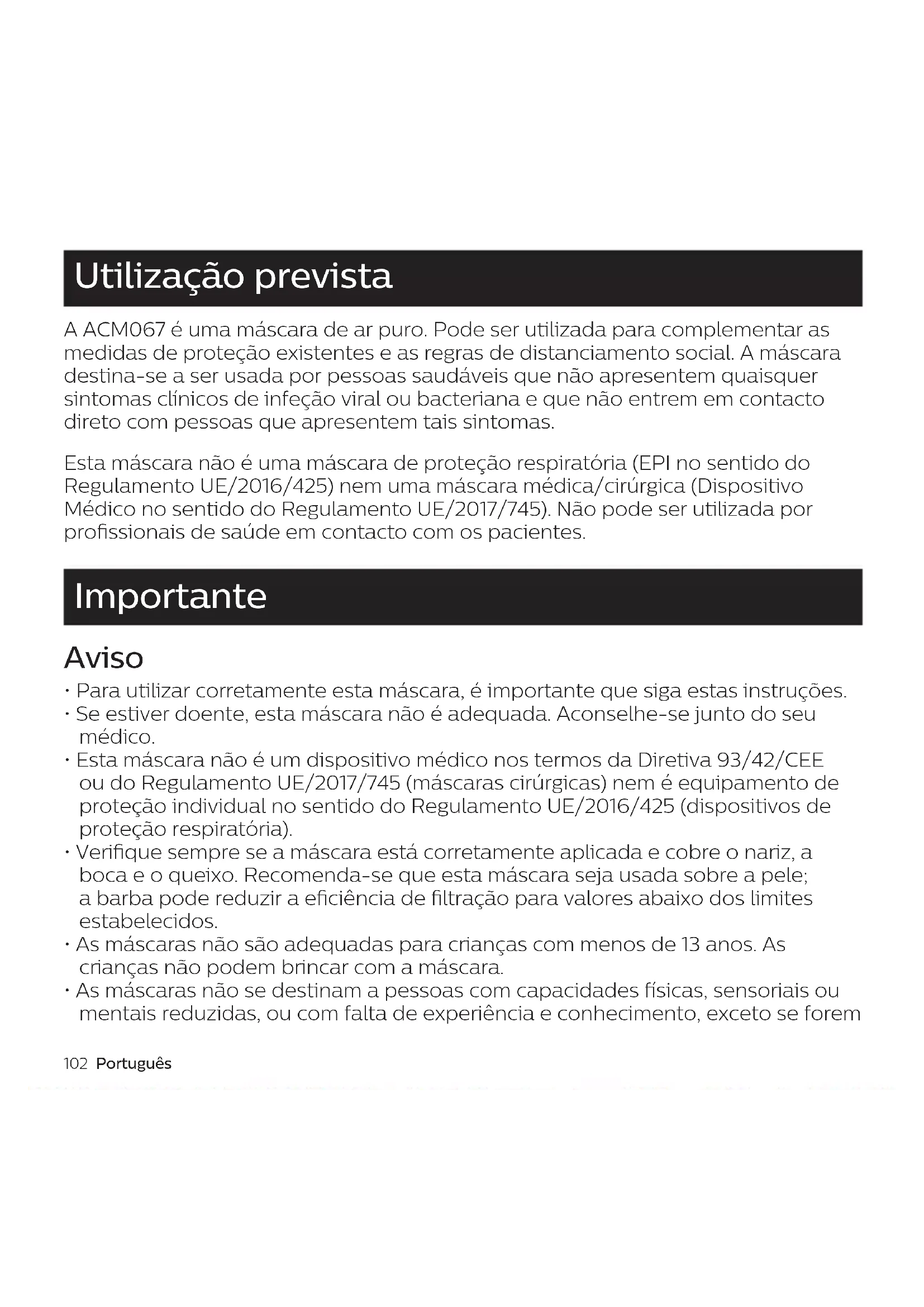 - Utilize o cabo USB original para carregar a ventoinha elétrica. O adaptador/ carregador não está incluído. A ventoinha elétrica só deve ser carregada com um adaptador/carregador USB de 5 V aprovado pelas suas autoridades locais ou governamentais. AMC067-AirMasks_3000.062.5277.2_BOOKLET_120x120mm_BW.indd 102AMC067-AirMasks_3000.062.5277.2_BOOKLET_120x120mm_BW.indd 102 01-03-21 11:2601-03-21 11:26Português 103 Utilização prevista A ACM067 é uma máscara de ar puro. Pode ser utilizada para complementar as medidas de proteção existentes e as regras de distanciamento social. A máscara destina-se a ser usada por pessoas saudáveis que não apresentem quaisquer sintomas clínicos de infeção viral ou bacteriana e que não entrem em contacto direto com pessoas que apresentem tais sintomas. Esta máscara não é uma máscara de proteção respiratória (EPI no sentido do Regulamento UE/2016/425) nem uma máscara médica/cirúrgica (Dispositivo Médico no sentido do Regulamento UE/2017/745). Não pode ser utilizada por prossionais de saúde em contacto com os pacientes. Importante Aviso