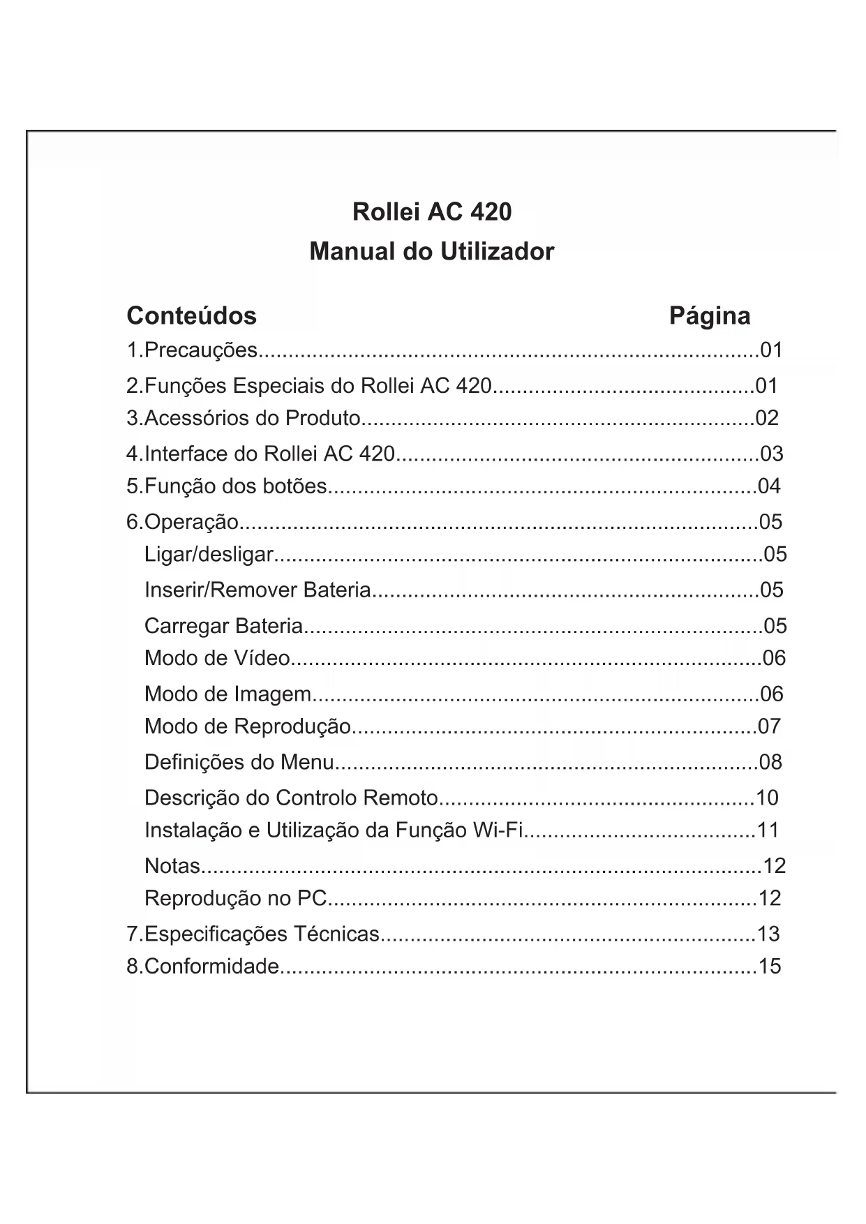 - 4GB a 32GB (Para 4K 10fps, utilize Cartão Micro SD Classe 10) Microfone / coluna incorporados Interface USB 2.0 de alta velocidade para carregamento e transferência de dados HD 2”TFT 960x480 Opção de 1/3/5 minutos-14- Saída HDMI Equilíbrio de brancos Compensação de exposição Captura Contínuo Lapso de Tempo Inversão de Imagem Câmara Lenta Frequência WiFi Sistema de telefone com suporte de WiFi Função WiFi Distância WiFi Transmissão Wireless Prova de Água Frequência do controlo remoto Prova de Água do Controlo Remoto Transmissão em tempo real Suportado Suportado Suportado por DVR e controlo remoto Suportado Suportado Suportado Suportado 2.4GHz-2.4835GHz IOS6.1 e acima, Android 4.0 e acima Transmissão de imagem, controlo remoto, sincronização de definições e partilha de álbuns 15m IEEE 802.11b/g/n Lítio-ion trocável (1180 mAh) 40 metros 2.4GHz IP65 Capacidade de bateria-15- Distância do controlo remoto Idiomas 10m em espaços abertos Alemão, Inglês, Francês, Italiano, Espanhol, Português, Holandês, Grego, Polaco, Checo, Eslovaco, Dinamarquês, Sueco, Norueguês, Finlandês, Húngaro 8.Conformidade O Fabricante declara que a marca CE foi aplicada no Rollei AC 420 de acordo com os requisitos básicos e outras provisões relevantes das seguintes Directivas CE: Directiva RoHs 2011/65/EC Directiva de Voltagem Baixa 2004/108/EC Directiva R&TTE 1999/5/EG Directiva LVD 2006/95/EEC Directiva EuP 2009/125/EG Directiva WEEE 2002/96/EG A Declaração de Conformidade EC pode ser requisitada no endereço especificado no Cartão de Garantia.Inhoudsopgave Pagina Rollei AC 420 Gebruikershandleiding 1.Voorzorgsmaatregelen p. 1