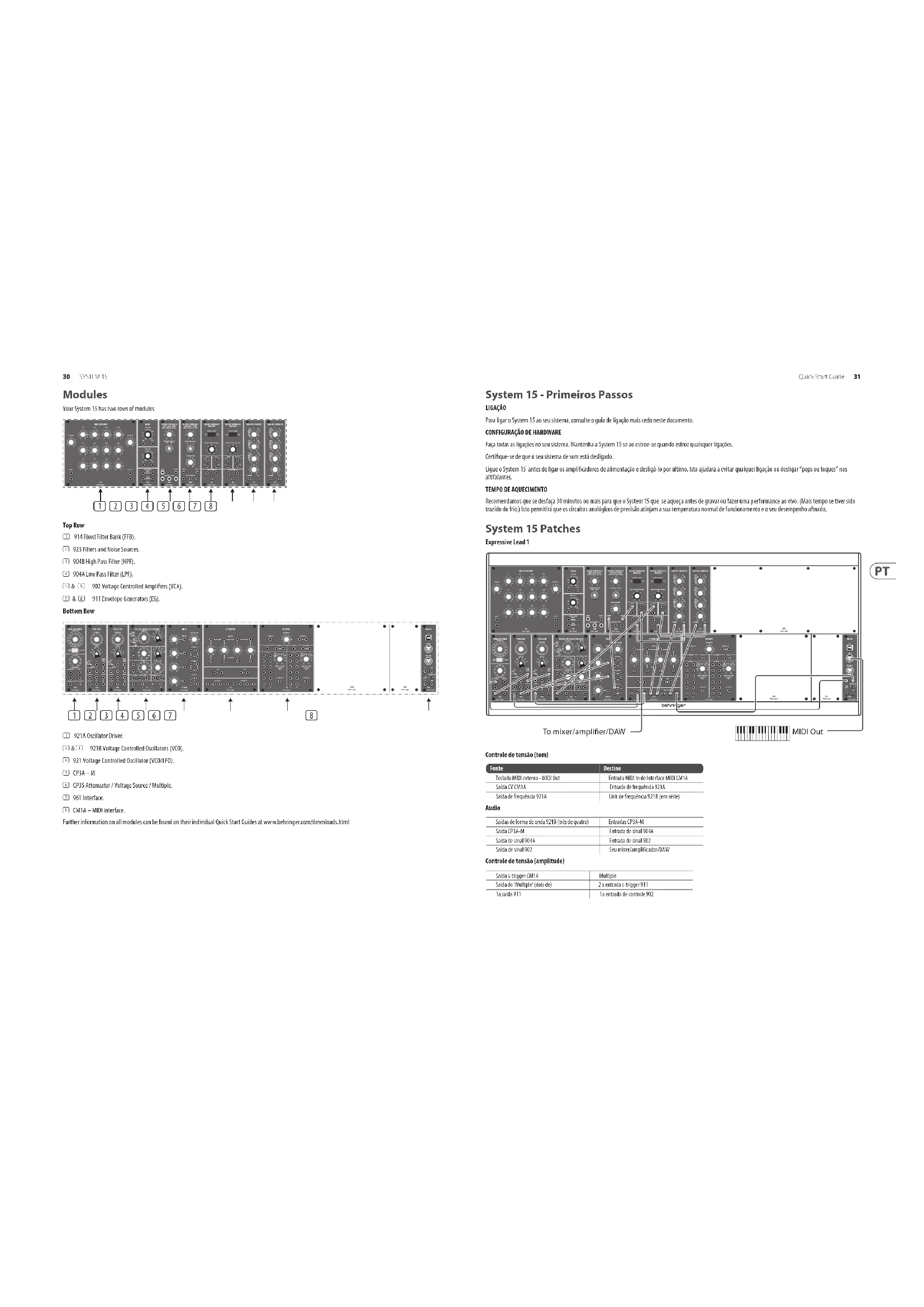 Recomendamos que se desfaça 30 minutos ou mais para que o System 15 que se aqueça antes de gravar ou fazer uma performance ao vivo. (Mais tempo se tiver sido trazido do frio.) Isto permitirá que os circuitos analógicos de precisão atinjam a sua temperatura normal de funcionamento e o seu desempenho anado. System 15 Patches Expressive Lead 1 Controle de tensão (tom) Fonte DestinoTeclado MIDI externo - MIDI Out Entrada MIDI In de Interface MIDI CM1ASaída CV CM1A Entrada de frequência 921ASaída de frequência 921A Link de frequência 921B (em série) Audio Saídas de forma de onda 921B (três de quatro) Entradas CP3A-MSaída CP3A-M Entrada de sinal 904ASaída de sinal 904A Entrada de sinal 902Saída de sinal 902 Seu mixer/amplicador/DAW Controle de tensão (amplitude) Saída s-trigger CM1A MultipleSaída do ‘Multiple’ (dois de) 2 x entrada s-trigger 9111a saída 911 1a entrada de controle 902 MIDI OutTo mixer/amplier/DAW32 SYSTEM 15 Quick Start Guide 33 Controle de tensão (modulação) Saída Aux Sine 921 2a entrada de sinal 902 2a saída de sinal 902 Entradas Mod 921B DC via ‘Multiple’ 2a saída 911 2a entrada de controle 902 Este patch permite que um efeito vibrato atrasado apareça gradualmente quando uma nota é pressionada. O teclado externo controla o tom e o acionamento das notas pela interface CM1A MIDI. Como isso pode ser comutado entre o v-trigger e o s-trigger, o s-trigger deve ser selecionado e a interface 961 não precisa ser usada. O CV de tom, Pitch, é alimentado para um dos 921As, que faz uma ligação em cadeia com os VCOs 921B. A forma de onda selecionada de cada oscilador é alimentada a um dos mixers CP3A-M; que então alimenta o ltro passa-baixa (LPF) 904A. Os s-triggers são alimentados a um conector 'multiple’, e depois às entradas s-trigger 911. A saída do LPF 904A é alimentada a um dos VCAs 902, que alimenta seu mixer, amplicador ou DAW. Este VCA é controlado pelo primeiro EG 911. O segundo EG 911 controla o segundo VCA 902. A segunda entrada de sinal VCA 902 é alimentada do LFO 921. Sua saída é alimentada a um dos conectores multiple CP35, cujas saídas alimentam as entradas DC Modulation dos VCOs 921B. O segundo 911 deve ter um tempo de ataque longo e sustentação total. Contanto que o primeiro 911 tenha tempo de sustentação longo, quando uma nota for apertada o efeito vibrato surgirá gradualmente. Quando as notas tocam legato há pouco ou nenhum vibrato. Space Rock Este patch cria dois sons clássicos do tipo ‘space rock’, e permite que eles sejam mixados. Fonte Destino Saída de onda senoidal 921 Entrada de controle 904A Saída de frequência 921A 2 links de frequência 921B (em série) 1a saída de onda senoidal 921B Entrada de controle 904A 2a saída de onda senoidal 921B Entrada de controle 904B Saída de ruído rosa 923 Entrada de sinal 904B Saída de sinal 904A Entrada 1 do CP3A-M Saída de sinal 904B Entrada 2 do CP3A-M Saída CP3A-M Seu mixer, amplicador, DAW As congurações de controle são muito importantes para este patch. A regeneração do 904A deve ser ajustada em 9 ou 10 para forçar o ltro a fazer auto-oscilação O 921A deve ter Octave (oitava) selecionada e o controle de frequência ajustado em -6 Os 921Bs devem estar ajustados em ‘Lo’ – esses osciladores proporcionam sweep para os ltros To mixer/amplier/DAW O 921 deve ser ajustado em ‘Sub’ – esta é a modulação principal do ltro de auto-oscilação e a alteração manual do controle de frequência, Frequency, ajuda a produção de um som clássico. O ruído rosa alimentando o ltro 904B produz um efeito ‘swept wind’ que pode ser alterado pela tensão de controle xa, Fixed Control Voltage. Alterar a tensão de controle xa do 904A também produz efeitos interessantes O CP3A-M faz o balanço de dois sinais, alternativamente, alimenta as saídas dos dois ltros diretamente a dois canais de amplicadores ou mixers. Ambos os sons têm o benefício de obter bastante eco! Expressive Lead #2 Este som usa a modulação de amplitude pulso (Pulse Width Modulation) para um par de osciladores, um dos quais deve ser ligeiramente desanado para deixar o som mais encorpado. Controle de tensão (tom) Fonte Destino Teclado MIDI externo - MIDI Out Entrada MIDI In de Interface MIDI CM1A Saída de frequência 921A Link de frequência de oscilador 921B (em série) Saída de amplitude 921A Link de amplitude de oscilador 921B (em série) Audio 2 x saída de onda senoidal 921B Entradas 1& 2 do CP3A-M Saída CP3AM Entrada de sinal 904A Saída de sinal 904A Entrada de sinal 902 Saída de sinal 902 Seu mixer/amplicador/DAW Controle de tensão (amplitude) Saída s-trigger CM1A via Multiple 2 x entrada s-trigger 911 1a Saída 911 1a entrada de controle 902 Controle de tensão (modulação) Saída de onda senoidal 921 Entrada de amplitude 921A Link de amplitude 921A 2 links de amplitude 921B (em série) 2a 911 Entrada de controle 904A Os VCOS 921B desanados proporcionam um som encorpado, cujo timbre muda constantemente na velocidade da onda senoidal 921– o 921 deve estar no modo Sub, a velocidade pode ser ajustada para se adequar. O som vem do LPF 904A, cuja tensão de controle xa e regeneração podem ser ajustadas em qualquer valor que seja apropriado a seus objetivos, além da modulação do segundo EG 911. MIDI OutTo mixer/amplier/DAW34 SYSTEM 15 Quick Start Guide 35 Congurações EG podem ser ajustadas para se adequarem à parte principal do som, embora níveis médios a altos de T2 (decaimento), T3 (repouso) e E sus(tentação) sejam recomendados. O segundo EG deve ter um T1 de comprimento médio (ataque), T2 médio (decaimento) e T3 mínimo (repouso) e E sus(tentação). Percussive Lead Um som condutor simples de dois osciladores com frente rígida e desenvolvimento tímbrico que também é adequado para sequenciamento melódico Controle de tensão (tom) Fonte DestinoTeclado MIDI externo - MIDI Out Entrada MIDI In de Interface MIDI CM1ASaída CM1A CV Out via Multiple