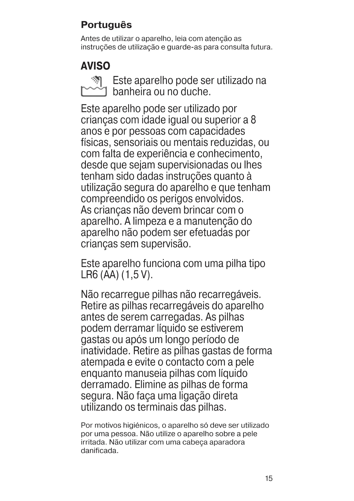 91050339_Body_Styler_BS_1000_EURO.indd 1491050339_Body_Styler_BS_1000_EURO.indd 14 19.02.20 13:0919.02.20 13:0915 Português Antes de utilizar o aparelho, leia com atenção as instruções de utilização e guarde-as para consulta futura. AVISO Este aparelho pode ser utilizado na banheira ou no duche. Este aparelho pode ser utilizado por crianças com idade igual ou superior a 8 anos e por pessoas com capacidades físicas, sensoriais ou mentais reduzidas, ou com falta de experiência e conhecimento, desde que sejam supervisionadas ou lhes tenham sido dadas instruções quanto à utilização segura do aparelho e que tenham compreendido os perigos envolvidos. As crianças não devem brincar com o aparelho. A limpeza e a manutenção do aparelho não podem ser efetuadas por crianças sem supervisão. Este aparelho funciona com uma pilha tipo LR6 (AA) (1,5 V). Não recarregue pilhas não recarregáveis. Retire as pilhas recarregáveis do aparelho antes de serem carregadas. As pilhas podem derramar líquido se estiverem gastas ou após um longo período de inatividade. Retire as pilhas gastas de forma atempada e evite o contacto com a pele enquanto manuseia pilhas com líquido derramado. Elimine as pilhas de forma segura. Não faça uma ligação direta utilizando os terminais das pilhas. Por motivos higiénicos, o aparelho só deve ser utilizado por uma pessoa. Não utilize o aparelho sobre a pele irritada. Não utilizar com uma cabeça aparadora danificada. 91050339_Body_Styler_BS_1000_EURO.indd 1591050339_Body_Styler_BS_1000_EURO.indd 15 19.02.20 13:0919.02.20 13:0916 A Como utilizar Rode a tampa do interruptor (3) para a posição... “I” para ligar. “O” para desligar. B Para aparar, segure na posição vertical e mova o aparelho contra a direção do crescimento do pelo. Pode fixar o pente de aparar (1) para cortar os pelos até 4 mm de comprimento. C Para fazer os contornos, mantenha o aparelho na horizontal. D Limpeza e manutenção Utilize a escova de limpeza (4) para limpar os pelos restantes. Ligue o aparelho para enxaguar a cabeça do aparador (2) com água corrente. Para um enxaguado minucioso do interior, desligue e abra a cabeça aparadora puxando firmemente. Para ajudar a manter o desempenho superior do aparelho, lubrifique o aparador após a limpeza ou utilização com água: Aplique uma gota de óleo lubrificante no aparador e, em seguida, ligue-o por breves instantes para garantir que o óleo é distribuído uniformemente. E Substituição da pilha Rode a tampa do interruptor (3) para a posição ▼ e abra o compartimento da pilha. Substitua a pilha respeitando a polaridade correta. Feche a tampa do interruptor conforme ilustrado e bloqueie-a, rodando-a de volta para a posição “O”. Eliminação Este produto contém uma pilha e/ou resíduos elétricos recicláveis. A fim de proteger o meio ambiente, não elimine o produto juntamente com o lixo doméstico. No final da sua vida útil, coloque-o num dos pontos de recolha para reciclagem. Sujeito a alterações sem aviso prévio. Garantia Braun concede a este produto 2 anos de garantia a partir da data de compra. Dentro do período de garantia qualquer defeito do aparelho, devido aos materiais ou ao seu fabrico, será reparado, substituindo peças ou trocando por um aparelho novo segundo o nosso critério, sem qualquer custo. 91050339_Body_Styler_BS_1000_EURO.indd 1691050339_Body_Styler_BS_1000_EURO.indd 16 19.02.20 13:0919.02.20 13:0917 Dependendo da disponibilidade, a substituição poderá resultar de uma cor diferente ou de um modelo equivalente. A garantia não cobre avarias por utilização indevida, funcionamento a voltagem diferente da indicada, ligação a uma tomada de corrente elétrica incorreta, rutura, utilização ou desgaste normal (p. ex.: rede e bloco de lâminas), defeitos com um efeito insignificante no valor ou no funcionamento do produto. A garantia perderá o seu efeito no caso de serem efetuadas reparações por pessoas não autorizadas ou se não forem utilizados acessórios originais Braun. A garantia só é válida se a data de compra fôr confirmada pela apresentação da fatura ou documento de compra correspondente. Esta garantia é válida para todos os países onde este produto seja distribuído por Braun ou por um distribuidor Braun autorizado. No caso de reclamação ao abrigo de garantia, dirija-se ao Serviço de Assistência Técnica Oficial Braun mais próximo: www.service.braun.com. Só para Portugal Apoio ao consumidor: Para localizar o seu Serviço Braun mais próximo o no caso de surgir alguma dúvida relativamente ao funcionamiento deste produto, contacte por favor este serviço pelo telefone