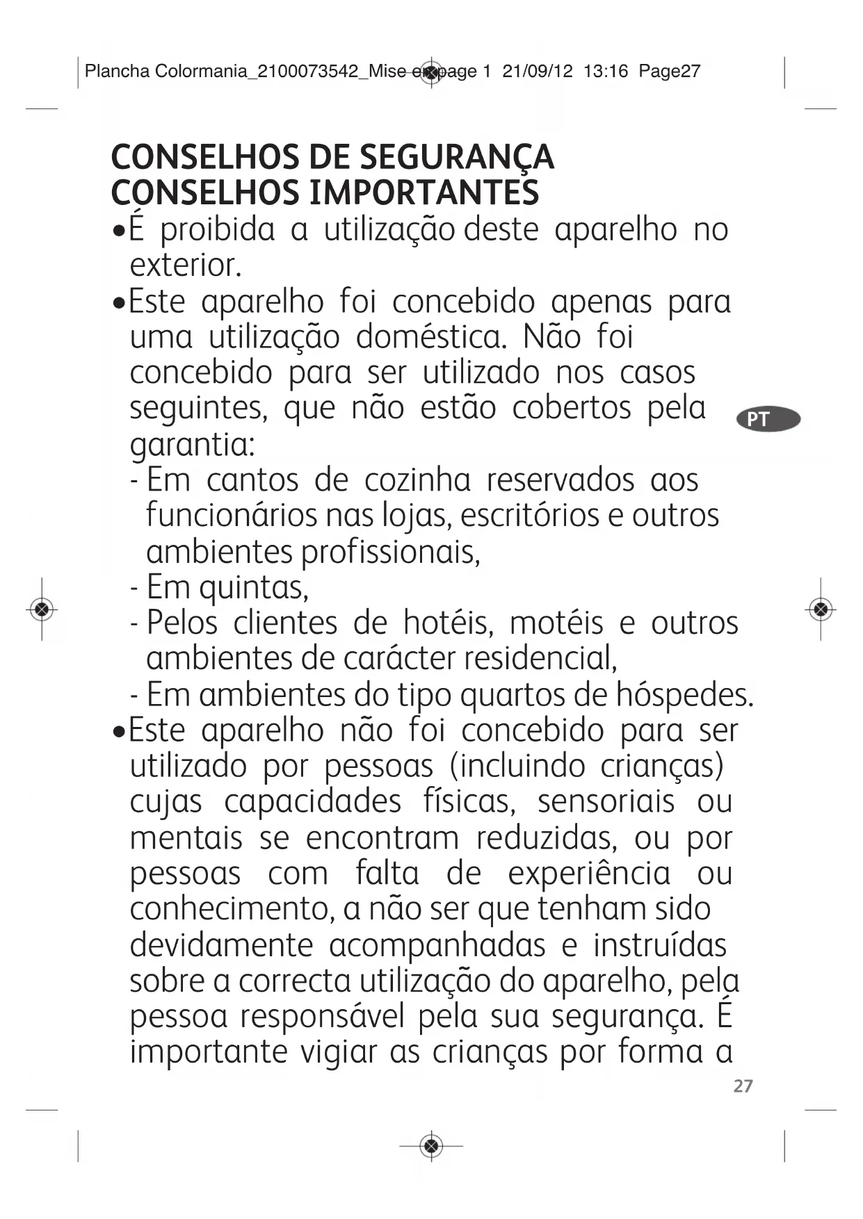 - Este aparelho não foi concebido para ser utilizado por pessoas (incluindo crianças) cujas capacidades físicas, sensoriais ou mentais se encontram reduzidas, ou por pessoas com falta de experiência ou conhecimento, a não ser que tenham sido devidamente acompanhadas e instruídas sobre a correcta utilização do aparelho, pela pessoa responsável pela sua segurança. É importante vigiar as crianças por forma a Plancha Colormania_2100073542_Mise en page 1 21/09/12 13:16 Page2728 garantir que as mesmas não brinquem com o aparelho.