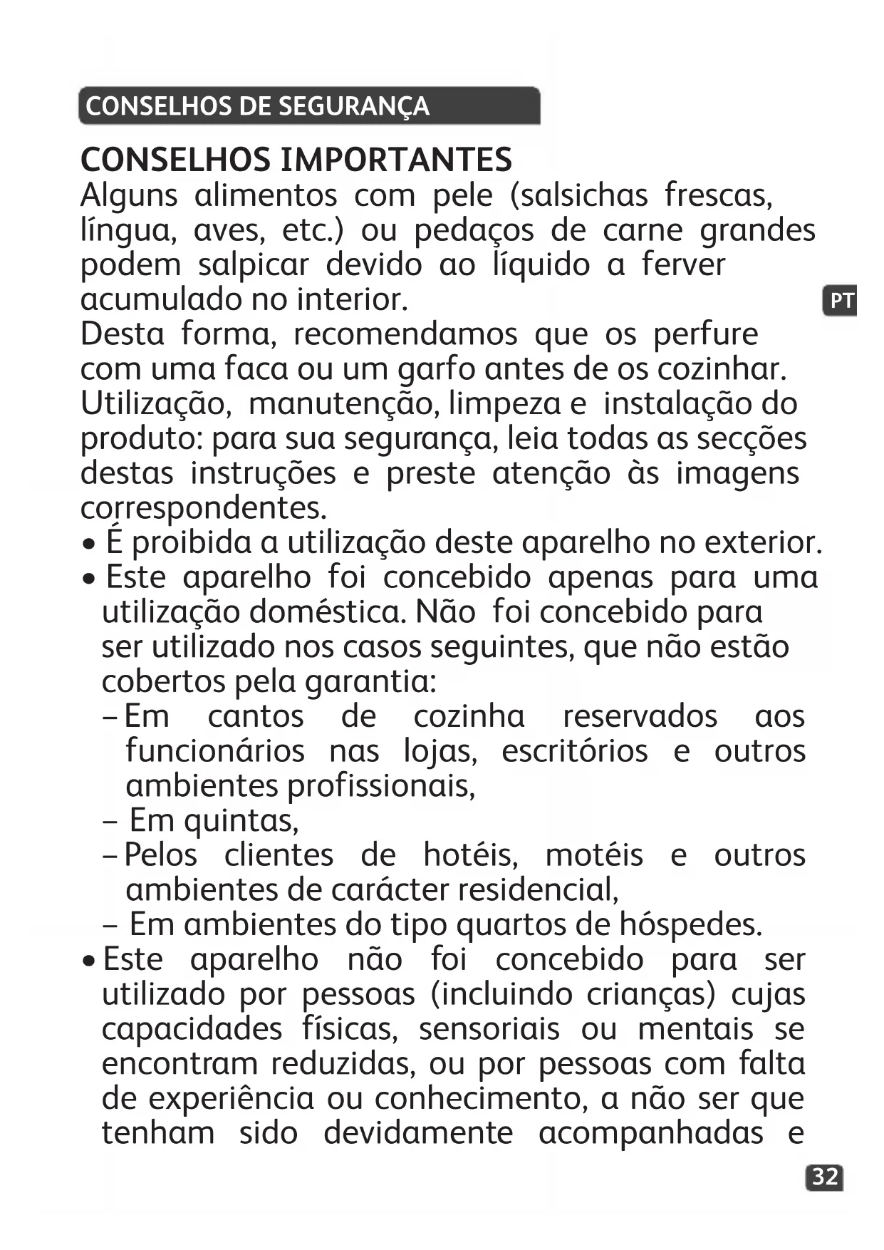 CONSELHOS IMPORTANTES Alguns alimentos com pele (salsichas frescas, língua, aves, etc.) ou pedaços de carne grandes podem salpicar devido ao líquido a ferver acumulado no interior. Desta forma, recomendamos que os perfure com uma faca ou um garfo antes de os cozinhar. Utilização, manutenção, limpeza e instalação do produto: para sua segurança, leia todas as secções destas instruções e preste atenção às imagens correspondentes.