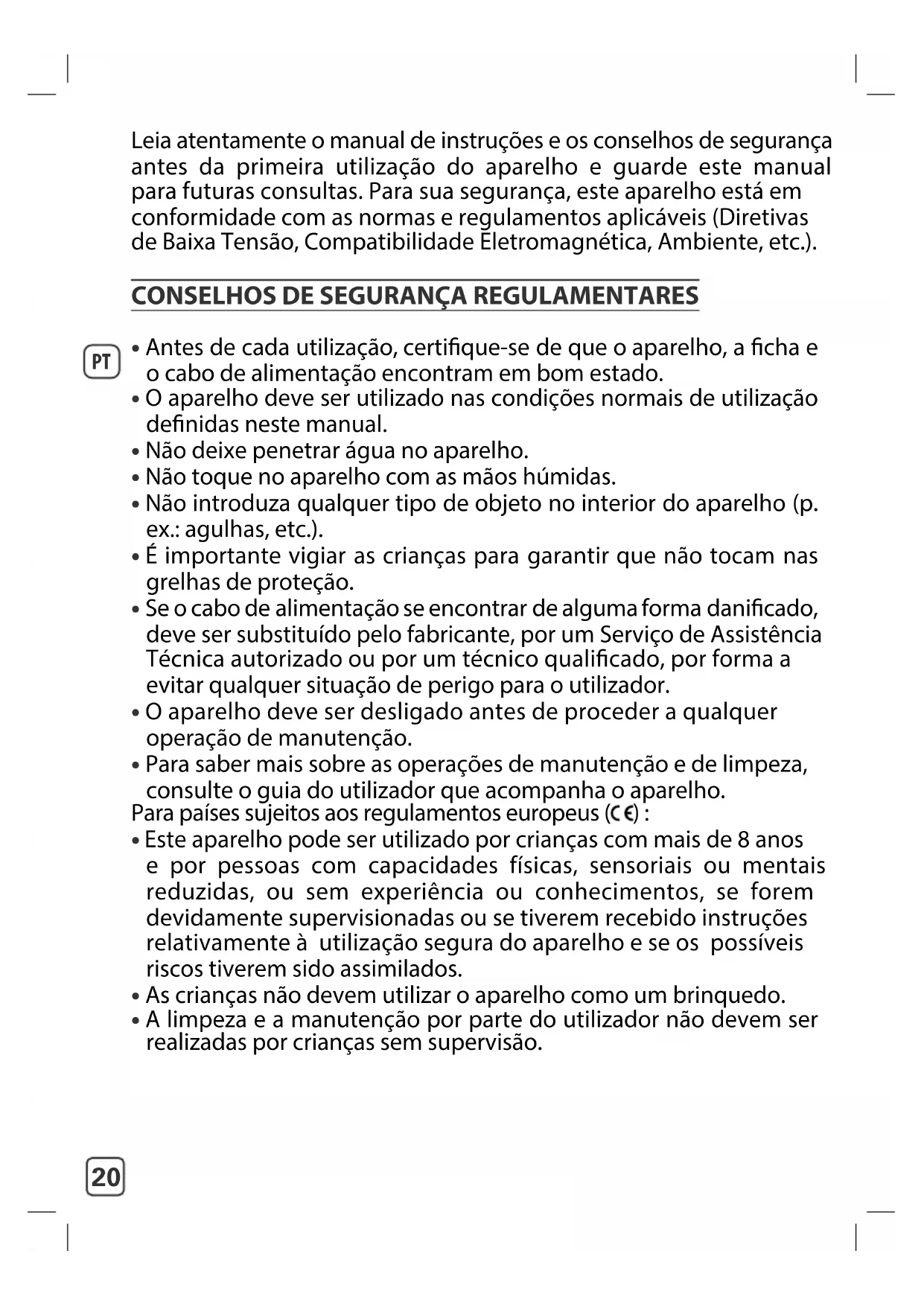 Leia atentamente o manual de instruções e os conselhos de segurança antes da primeira utilização do aparelho e guarde este manual para futuras consultas. Para sua segurança, este aparelho está em conformidade com as normas e regulamentos aplicáveis (Diretivas de Baixa Tensão, Compatibilidade Eletromagnética, Ambiente, etc.).