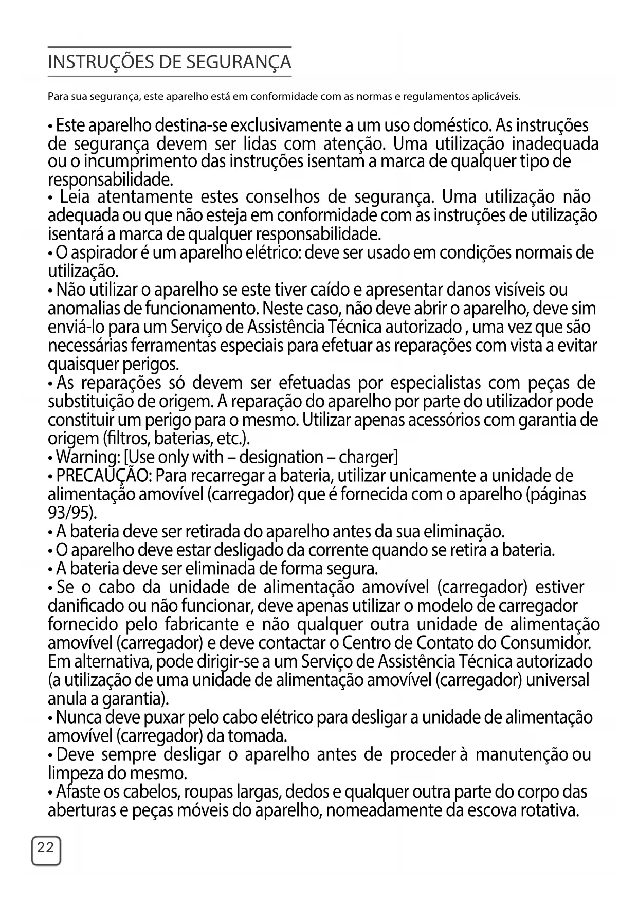 - O aspirador é um aparelho elétrico: deve ser usado em condições normais de utilização.