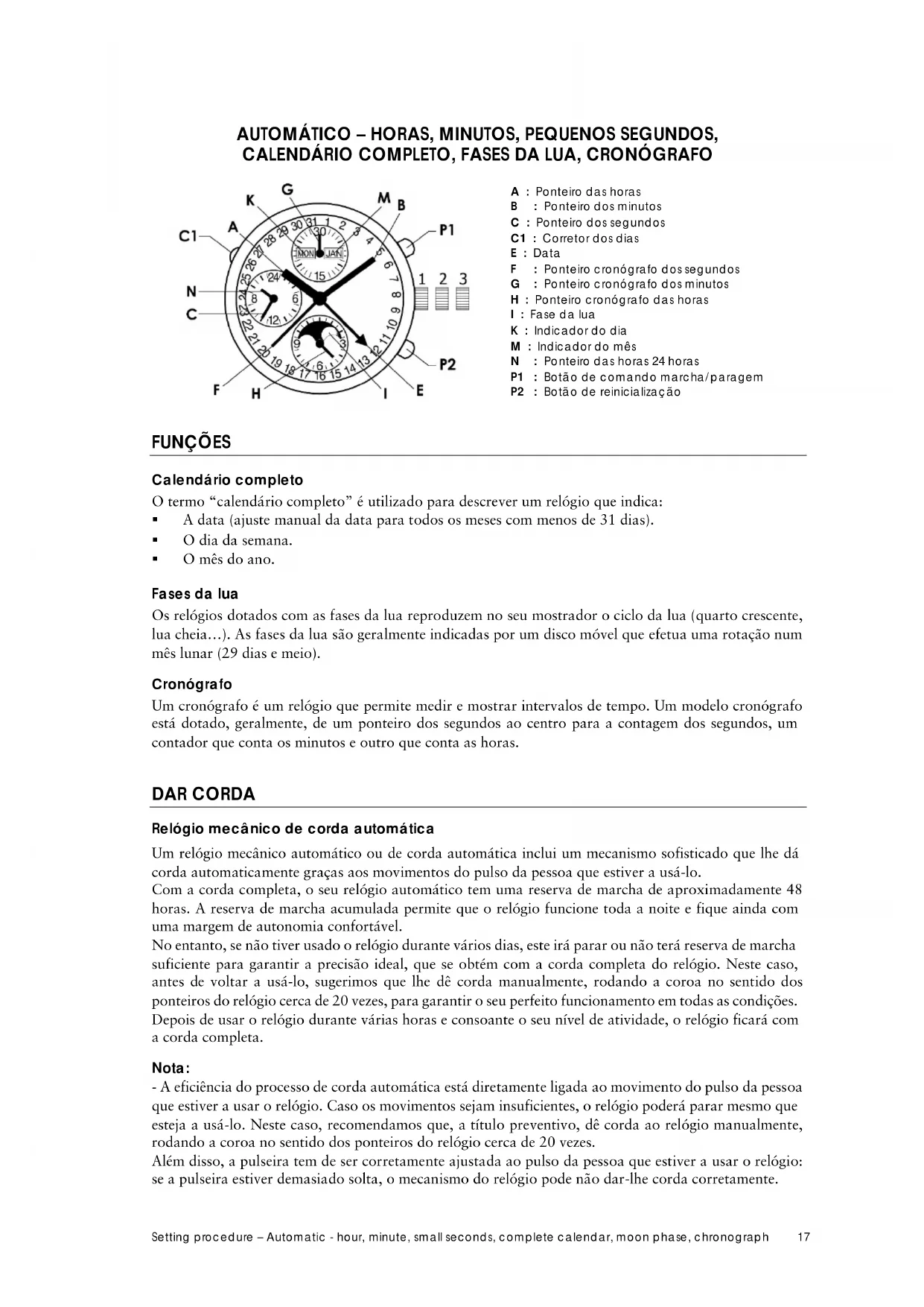 FUNÇÕES Calendário completo O termo “calendário completo” é utilizado para descrever um relógio que indica: A data (ajuste manual da data para todos os meses com menos de 31 dias). O dia da semana. O mês do ano. Fases da lua Os relógios dotados com as fases da lua reproduzem no seu mostrador o ciclo da lua (quarto crescente, lua cheia…). As fases da lua são geralmente indicadas por um disco móvel que efetua uma rotação num mês lunar (29 dias e meio). Cronógrafo Um cronógrafo é um relógio que permite medir e mostrar intervalos de tempo. Um modelo cronógrafo está dotado, geralmente, de um ponteiro dos segundos ao centro para a contagem dos segundos, um contador que conta os minutos e outro que conta as horas. DAR CORDA Relógio mecânico de corda automática Um relógio mecânico automático ou de corda automática inclui um mecanismo sofisticado que lhe dá corda automaticamente graças aos movimentos do pulso da pessoa que estiver a usá-lo. Com a corda completa, o seu relógio automático tem uma reserva de marcha de aproximadamente 48 horas. A reserva de marcha acumulada permite que o relógio funcione toda a noite e fique ainda com uma margem de autonomia confortável. No entanto, se não tiver usado o relógio durante vários dias, este irá parar ou não terá reserva de marcha suficiente para garantir a precisão ideal, que se obtém com a corda completa do relógio. Neste caso, antes de voltar a usá-lo, sugerimos que lhe dê corda manualmente, rodando a coroa no sentido dos ponteiros do relógio cerca de 20 vezes, para garantir o seu perfeito funcionamento em todas as condições. Depois de usar o relógio durante várias horas e consoante o seu nível de atividade, o relógio ficará com a corda completa. Nota: - A eficiência do processo de corda automática está diretamente ligada ao movimento do pulso da pessoa que estiver a usar o relógio. Caso os movimentos sejam insuficientes, o relógio poderá parar mesmo que esteja a usá-lo. Neste caso, recomendamos que, a título preventivo, dê corda ao relógio manualmente, rodando a coroa no sentido dos ponteiros do relógio cerca de 20 vezes. Além disso, a pulseira tem de ser corretamente ajustada ao pulso da pessoa que estiver a usar o relógio: se a pulseira estiver demasiado solta, o mecanismo do relógio pode não dar-lhe corda corretamente.Setting procedure – Automatic - hour, minute, small seconds, complete calendar, moon phase, chronograph 18 - Deve tirar o relógio do pulso antes de lhe dar corda. Deste modo, garante que a tige da coroa fica totalmente direita durante o processo de dar corda e evita o risco de danos na coroa ou no movimento. - Não agite deliberadamente um relógio de corda automática para lhe dar corda. Não produz efeito e pode danificar o movimento. - Mesmo que não use o relógio durante vários meses, aconselhamo-lo a dar-lhe corda manualmente com regularidade. Deste modo, impede os óleos de solidificar ou de invadir os veios do movimento.