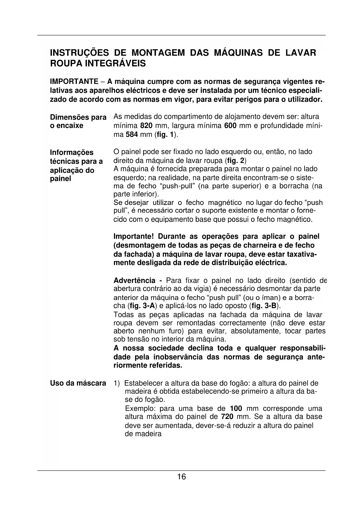 As medidas do compartimento de alojamento devem ser: altura mínima 820 mm, largura mínima 600 mm e profundidade míni- ma 584 mm (fig. 1).