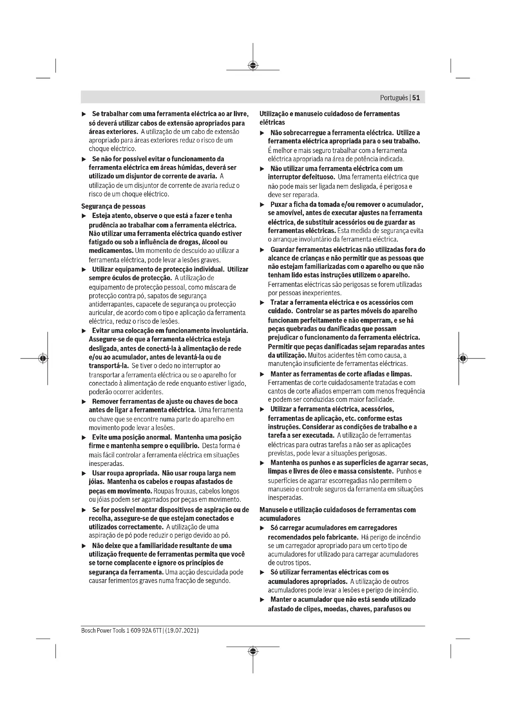 Service après-vente et conseil utilisateurs Notre Service après-vente répond à vos questions concer- nant la réparation et l’entretien de votre produit et les pièces de rechange. Vous trouverez des vues éclatées et des infor- mations sur les pièces de rechange sur le site : www.bosch-pt.com L’équipe de conseil utilisateurs Bosch se tient à votre dispo- Bosch Power Tools 1 609 92A 6TT | (19.07.2021)50 | Português sition pour répondre à vos questions concernant nos pro- duits et leurs accessoires. Pour toute demande de renseignement ou toute commande de pièces de rechange, précisez impérativement la réfé- rence à 10chiffres figurant sur l’étiquette signalétique du produit. Maroc Robert Bosch Morocco SARL 53, Rue Lieutenant Mahroud Mohamed 20300 Casablanca Tel.: +212529314327 E-Mail : sav.outillage@ma.bosch.com Vous trouverez d'autres adresses du service après-vente sous: www.bosch-pt.com/serviceaddresses Transport Les accus Lithium-ion sont soumis à la réglementation rela- tive au transport de matières dangereuses. Pour le transport par voie routière, aucune mesure supplémentaire n’a besoin d’être prise. Lors d’une expédition par un tiers (parex.transport aérien ou entreprise de transport), des mesures spécifiques doivent être prises concernant l’emballage et le marquage. Pour la préparation de l’envoi, faites-vous conseiller par un expert en transport de matières dangereuses. N’expédiez que des accus dont le boîtier n’est pas endom- magé. Recouvrez les contacts non protégés et emballez l’ac- cu de manière à ce qu’il ne puisse pas se déplacer dans l’em- ballage. Veuillez également respecter les réglementations supplémentaires éventuellement en vigueur. Élimination des déchets Les outils électroportatifs, les accus ainsi que leurs accessoires et emballages doivent être rapportés dans un centre de recyclage respec- tueux de l’environnement. Ne jetez pas les outils électroportatifs et les ac- cus/piles avec les ordures ménagères! Accus/piles : Li-Ion : Veuillez respecter les indications se trouvant dans le cha- pitre Transport (voir «Transport», Page50). Português Instruções de segurança Indicações gerais de advertência para ferramentas elétricas AVISO Devem ser lidas todas as indicações de segurança, instruções, ilustrações e especificações desta ferramenta eléctrica. O desrespeito das instruções apresentadas abaixo poderá resultar em choque eléctrico, incêndio e/ou ferimentos graves. Guarde bem todas as advertências e instruções para futura referência. O termo "ferramenta eléctrica" utilizado a seguir nas indicações de advertência, refere‑se a ferramentas eléctricas operadas com corrente de rede (com cabo de rede) e a ferramentas eléctricas operadas com acumulador (sem cabo de rede). Segurança da área de trabalho u Mantenha a sua área de trabalho sempre limpa e bem iluminada. Desordem ou áreas de trabalho insuficientemente iluminadas podem levar a acidentes. u Não trabalhar com a ferramenta eléctrica em áreas com risco de explosão, nas quais se encontrem líquidos, gases ou pós inflamáveis. Ferramentas eléctricas produzem faíscas, que podem inflamar pós ou vapores. u Manter crianças e outras pessoas afastadas da ferramenta eléctrica durante a utilização. No caso de distracção é possível que perca o controlo sobre o aparelho. Segurança elétrica u A ficha de conexão da ferramenta eléctrica deve caber na tomada. A ficha não deve ser modificada de maneira alguma. Não utilizar uma ficha de adaptação junto com ferramentas eléctricas protegidas por ligação à terra. Fichas não modificadas e tomadas apropriadas reduzem o risco de um choque eléctrico. u Evitar que o corpo possa entrar em contacto com superfícies ligadas à terra, como tubos, aquecimentos, fogões e frigoríficos. Há um risco elevado devido a choque eléctrico, se o corpo estiver ligado à terra. u Manter o aparelho afastado de chuva ou humidade. A infiltração de água numa ferramenta eléctrica aumenta o risco de choque eléctrico. u Não deverá utilizar o cabo para outras finalidades. Nunca utilizar o cabo para transportar a ferramenta eléctrica, para pendurá‑la, nem para puxar a ficha da tomada. Manter o cabo afastado do calor, do óleo, de arestas afiadas ou de peças em movimento. Cabos danificados ou emaranhados aumentam o risco de um choque eléctrico. 1 609 92A 6TT | (19.07.2021) Bosch Power ToolsPortuguês | 51 u Se trabalhar com uma ferramenta eléctrica ao ar livre, só deverá utilizar cabos de extensão apropriados para áreas exteriores. A utilização de um cabo de extensão apropriado para áreas exteriores reduz o risco de um choque eléctrico. u Se não for possível evitar o funcionamento da ferramenta eléctrica em áreas húmidas, deverá ser utilizado um disjuntor de corrente de avaria. A utilização de um disjuntor de corrente de avaria reduz o risco de um choque eléctrico. Segurança de pessoas u Esteja atento, observe o que está a fazer e tenha prudência ao trabalhar com a ferramenta eléctrica. Não utilizar uma ferramenta eléctrica quando estiver fatigado ou sob a influência de drogas, álcool ou medicamentos. Um momento de descuido ao utilizar a ferramenta eléctrica, pode levar a lesões graves. u Utilizar equipamento de protecção individual. Utilizar sempre óculos de protecção. A utilização de equipamento de protecção pessoal, como máscara de protecção contra pó, sapatos de segurança antiderrapantes, capacete de segurança ou protecção auricular, de acordo com o tipo e aplicação da ferramenta eléctrica, reduz o risco de lesões. u Evitar uma colocação em funcionamento involuntária. Assegure‑se de que a ferramenta eléctrica esteja desligada, antes de conectá‑la à alimentação de rede e/ou ao acumulador, antes de levantá‑la ou de transportá‑la. Se tiver o dedo no interruptor ao transportar a ferramenta el