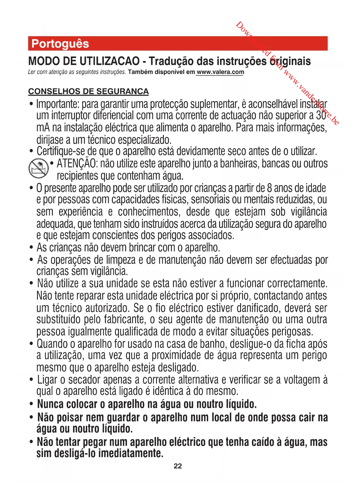 Tradução: SECADOR DE CABELO PORTÁTIL PARA USO PROFISSIONAL Downloaded from www.vandenborre.be24 que o ar quente que sai do mesmo encha o cabelo a partir da base, conferindo-lhe mais volume. ATENÇÃO: com o difusor, o aparelho deve ser utilizado apenas na velocidade/temperatura baixa. Filtro (para modelos com este acessório) No secador de cabelos, encontra-se um filtro amomível sob a grelha de entrada de ar que filtra partículas de pó e cabelos que são aspirados pelo ventilador. O filtro pode ser limpo sob água corrente. Para fazer sair o filtro, retirar a grelha de entrada de ar e, em seguida, o filtro. Após a limpeza, verificar se o filtro está completamente seco antes de remontá-lo no secador de cabelos. Em seguida, recolocar a grade deentrada de ar. Comutador de tensão (para modelos com este acessório) Se o secador de cabelos estiver provido com este equipamento, deve regular-se a tensão de 110-125 V ou 220-240 V - dependendo da tensão de rede - antes da sua utilização. Pode regular-se o comutador de tensão através de uma pequena chave de fendas ou de um instrumento parecido. Ionic Wellness (para os secadores dotados desta função) Esta função está associada a um gerador que produz milhões de iões negativos purificantes. O que são os iões? Os iões são partículas com carga electrostática presentes na natureza. Os iões com cargas negativas ajudam a purificar o ar neutralizando os iões com cargas positivas que, pelo contrário, contribuem para a sua deterioração, mantendo na atmosfera grande parte dos agentes poluentes. Podem encontrar-se grandes concentrações de iões com cargas negativas após uma tempestade, ou junto ao mar, ou na montanha, perto de cascatas e cursos de água, onde há uma sensação de bem-estar porque se está perante um ar mais puro, natural e revitalizante. Melhor hidratação do cabelo Os iões com carga electrostática negativa ajudam a conservar a correcta hidratação do cabelo. Micronizam as partículas de água presentes no cabelo recém lavado, permitindo uma maior absorção das mesmas no interior da haste, restabelecendo o equilíbrio da humidade natural do cabelo. Efeito bálsamo no cabelo Uma melhor hidratação favorece o condicionamento do cabelo, tem um efeito regenerante e torna-o mais macio e fácil de pentear, com mais volume e brilho. Sem carga electrostática ou “fly away” Os iões com cargas negativas ajudam a reduzir a electricidade estática e o efeito “fly away” do cabelo (cabelos encaracolados) e o frisado. Efeito purificante Os iões com cargas negativas emitidos pelo secador fazem com que as partículas poluentes do ar (com cargas positivas ou negativas) sejam atraídas umas às outras, se tornem pesadas e caiam ao chão devido à gravidade, purificando, deste modo, o ar. VALERA é marca registrada da Ligo Electric S.A. - Suíça