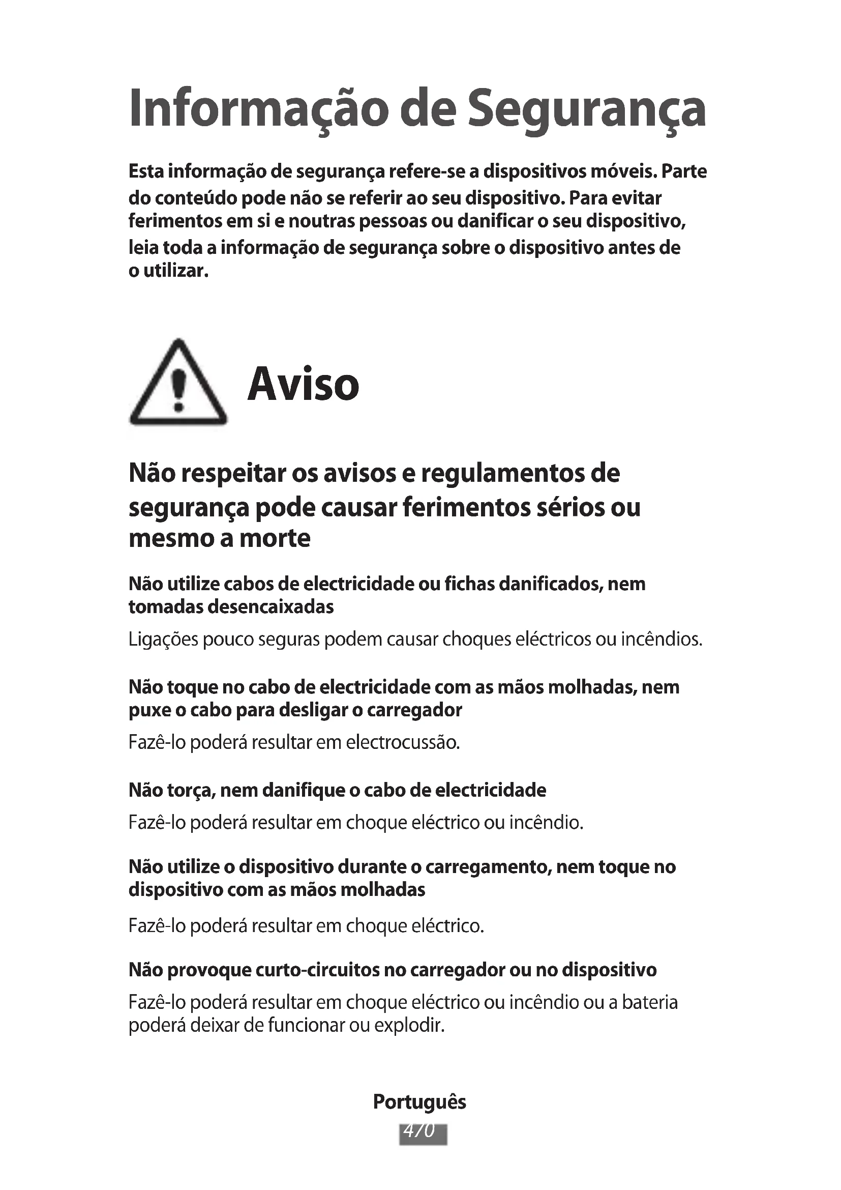 Informação de Segurança Esta informação de segurança refere-se a dispositivos móveis. Parte do conteúdo pode não se referir ao seu dispositivo. Para evitar ferimentos em si e noutras pessoas ou danificar o seu dispositivo, leia toda a informação de segurança sobre o dispositivo antes de o utilizar. Aviso Não respeitar os avisos e regulamentos de segurança pode causar ferimentos sérios ou mesmo a morte Não utilize cabos de electricidade ou fichas danificados, nem tomadas desencaixadas Ligações pouco seguras podem causar choques eléctricos ou incêndios. Não toque no cabo de electricidade com as mãos molhadas, nem puxe o cabo para desligar o carregador Fazê-lo poderá resultar em electrocussão. Não torça, nem danifique o cabo de electricidade Fazê-lo poderá resultar em choque eléctrico ou incêndio. Não utilize o dispositivo durante o carregamento, nem toque no dispositivo com as mãos molhadas Fazê-lo poderá resultar em choque eléctrico. Não provoque curto-circuitos no carregador ou no dispositivo Fazê-lo poderá resultar em choque eléctrico ou incêndio ou a bateria poderá deixar de funcionar ou explodir.Português