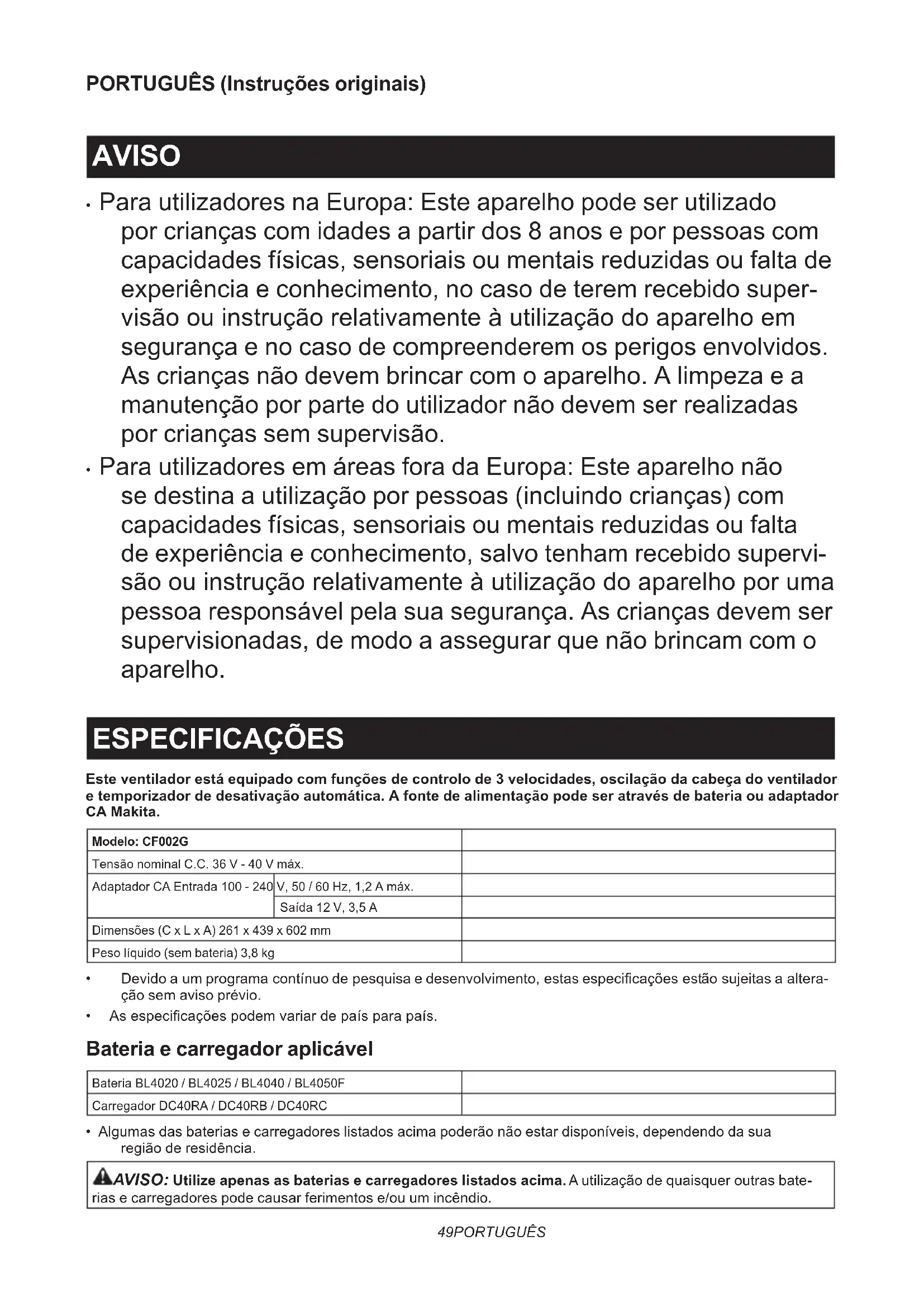 - Para utilizadores em áreas fora da Europa: Este aparelho não se destina a utilização por pessoas (incluindo crianças) com capacidades físicas, sensoriais ou mentais reduzidas ou falta de experiência e conhecimento, salvo tenham recebido supervi- sãoouinstruçãorelativamenteàutilizaçãodoaparelhoporuma pessoa responsável pela sua segurança. As crianças devem ser supervisionadas, de modo a assegurar que não brincam com o aparelho. ESPECIFICAÇÕES Este ventilador está equipado com funções de controlo de 3 velocidades, oscilação da cabeça do ventilador e temporizador de desativação automática. A fonte de alimentação pode ser através de bateria ou adaptador CA Makita. Modelo: CF002GTensão nominal C.C. 36 V - 40 V máx.Adaptador CA Entrada 100 - 240 V, 50 / 60 Hz, 1,2 A máx.Saída 12 V, 3,5 ADimensões (C x L x A) 261 x 439 x 602 mmPeso líquido (sem bateria) 3,8 kg