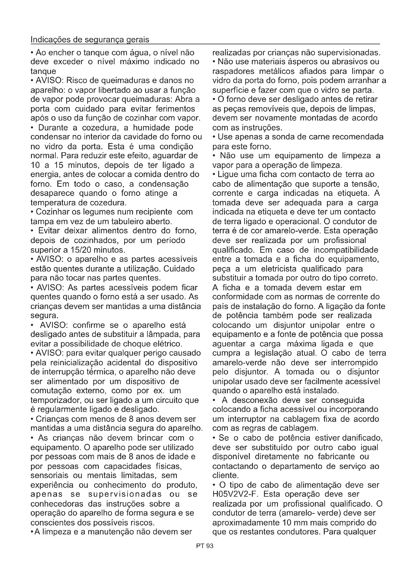 - O tipo de cabo de alimentação deve ser H05V2V2-F. Esta operação deve ser realizada por um profissional qualificado. O condutor de terra (amarelo- verde) deve ser aproximadamente 10 mm mais comprido do que os restantes condutores. Para qualquer PT 93reparação, consulte apenas o Departamento de Serviço ao Cliente e solicite o uso de peças originais.