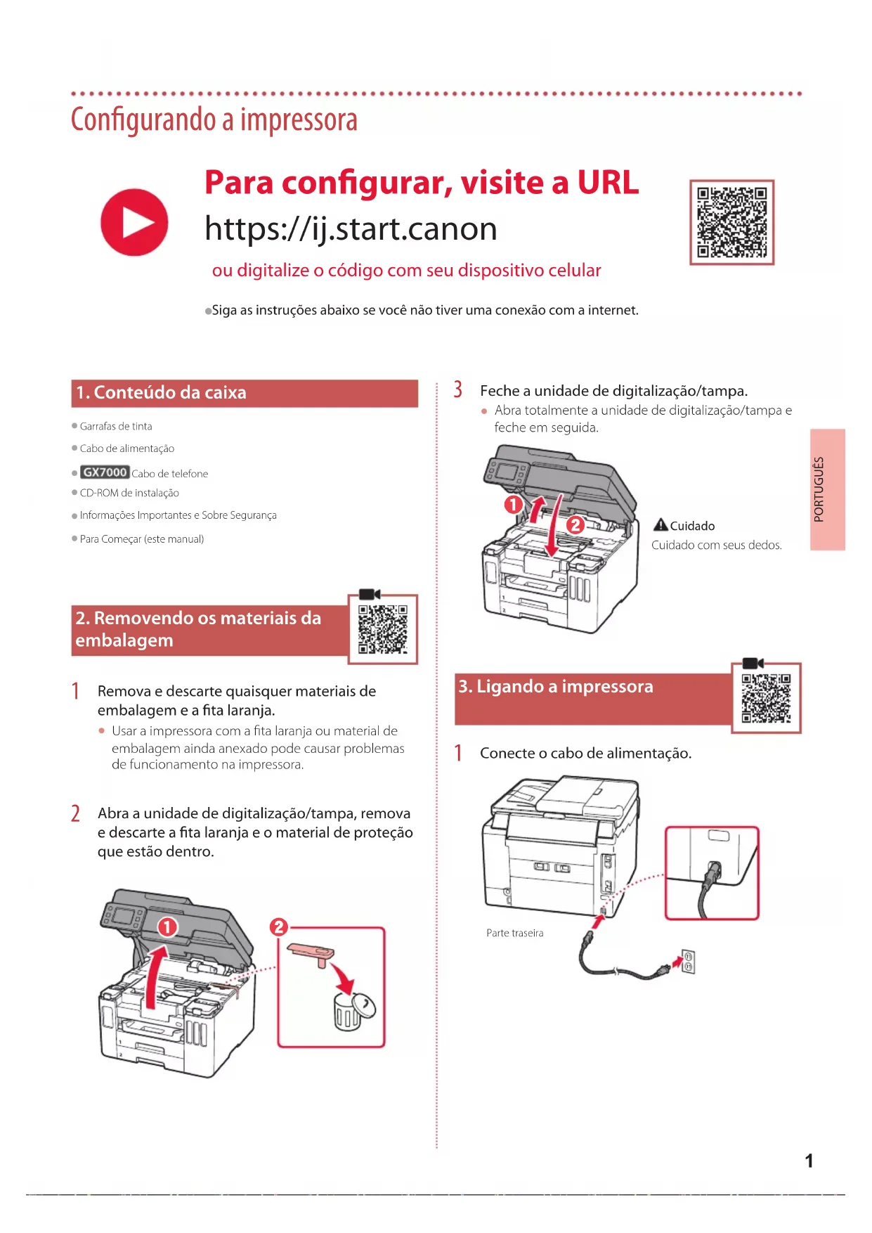 Conecte o cabo de alimentação. Parte traseira Para configurar, visite a URL https://ij.start.canon ou digitalize o código com seu dispositivo celular