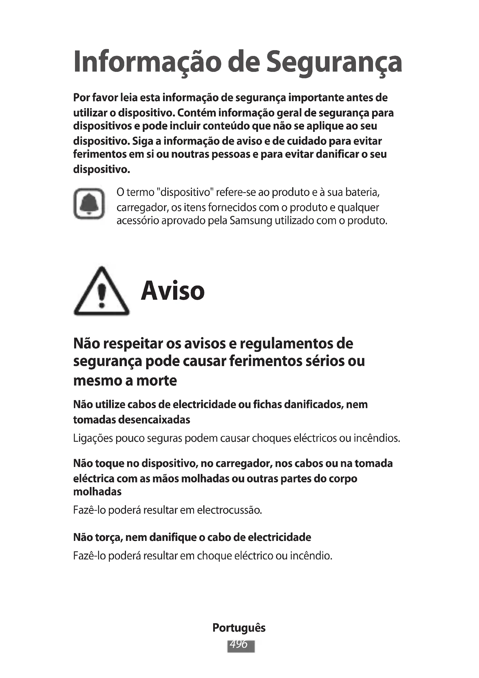 Informação de Segurança Por favor leia esta informação de segurança importante antes de utilizar o dispositivo. Contém informação geral de segurança para dispositivos e pode incluir conteúdo que não se aplique ao seu dispositivo. Siga a informação de aviso e de cuidado para evitar ferimentos em si ou noutras pessoas e para evitar danificar o seu dispositivo. O termo "dispositivo" refere-se ao produto e à sua bateria, carregador, os itens fornecidos com o produto e qualquer acessório aprovado pela Samsung utilizado com o produto. Aviso Não respeitar os avisos e regulamentos de segurança pode causar ferimentos sérios ou mesmo a morte Não utilize cabos de electricidade ou fichas danificados, nem tomadas desencaixadas Ligações pouco seguras podem causar choques eléctricos ou incêndios. Não toque no dispositivo, no carregador, nos cabos ou na tomada eléctrica com as mãos molhadas ou outras partes do corpo molhadas Fazê-lo poderá resultar em electrocussão. Não torça, nem danifique o cabo de electricidade Fazê-lo poderá resultar em choque eléctrico ou incêndio.Português