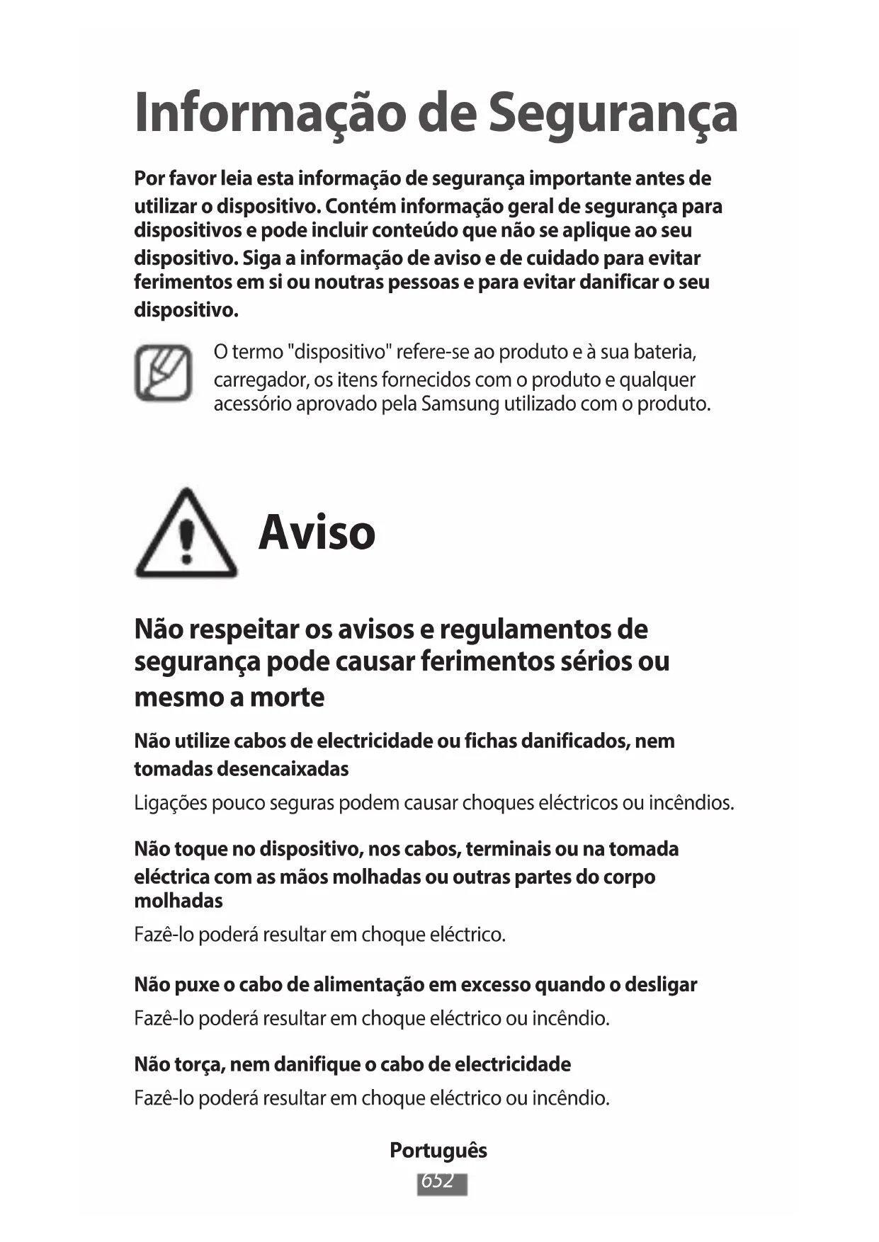 Informação de Segurança Por favor leia esta informação de segurança importante antes de utilizar o dispositivo. Contém informação geral de segurança para dispositivos e pode incluir conteúdo que não se aplique ao seu dispositivo. Siga a informação de aviso e de cuidado para evitar ferimentos em si ou noutras pessoas e para evitar danificar o seu dispositivo. O termo "dispositivo" refere-se ao produto e à sua bateria, carregador, os itens fornecidos com o produto e qualquer acessório aprovado pela Samsung utilizado com o produto. Aviso Não respeitar os avisos e regulamentos de segurança pode causar ferimentos sérios ou mesmo a morte Não utilize cabos de electricidade ou fichas danificados, nem tomadas desencaixadas Ligações pouco seguras podem causar choques eléctricos ou incêndios. Não toque no dispositivo, nos cabos, terminais ou na tomada eléctrica com as mãos molhadas ou outras partes do corpo molhadas Fazê-lo poderá resultar em choque eléctrico. Não puxe o cabo de alimentação em excesso quando o desligar Fazê-lo poderá resultar em choque eléctrico ou incêndio. Não torça, nem danifique o cabo de electricidade Fazê-lo poderá resultar em choque eléctrico ou incêndio.Português