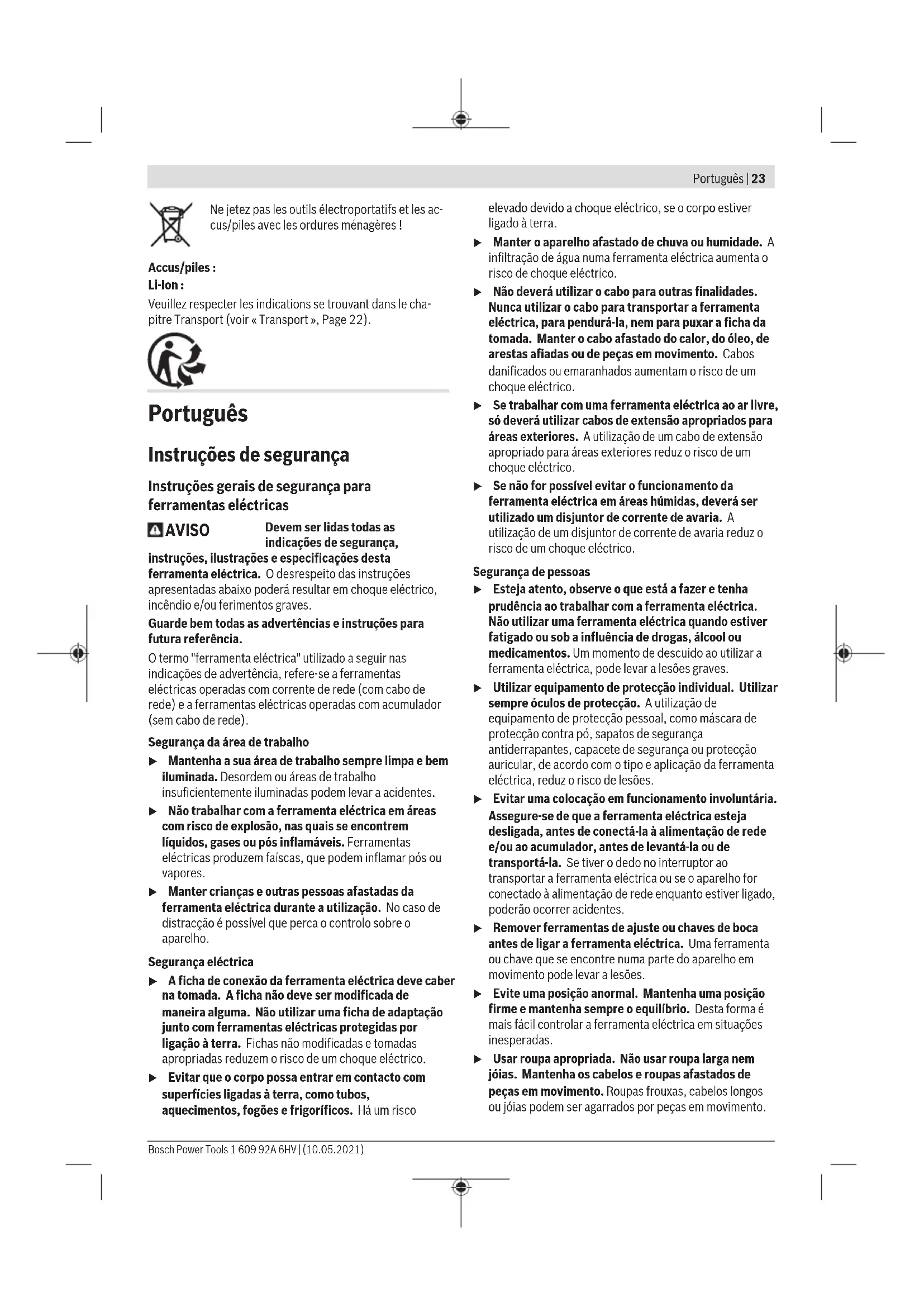 1,5 13,5 1,5 13,5 1,5 O nível de vibrações indicado nestas instruções e o valor de emissões sonoras foram medidos de acordo com um processo de medição normalizado e podem ser utilizados para a comparação de ferramentas elétricas. Também são adequados para uma avaliação provisória das emissões sonoras e de vibrações. O nível de vibrações indicado e o valor de emissões sonoras representam as aplicações principais da ferramenta elétrica. Se a ferramenta elétrica for utilizada para outras aplicações, com outras ferramentas de trabalho ou com manutenção insuficiente, é possível que o nível de vibrações e de emissões sonoras seja diferente. Isto pode aumentar sensivelmente a emissão sonora e de vibrações para o período completo de trabalho. Para uma estimação exata da emissão sonora e de vibrações, também deveriam ser considerados os períodos nos quais o aparelho está desligado ou funciona, mas não está sendo utilizado. Isto pode reduzir a emissão sonora e de vibrações durante o completo período de trabalho. Além disso também deverão ser estipuladas medidas de segurança para proteger o operador contra o efeito de vibrações, como por exemplo: manutenção de ferramentas elétricas e acessórios, manter as mãos quentes e organização dos processos de trabalho. Montagem u A bateria deverá ser retirada antes de todos os trabalhos na ferramenta elétrica (p. ex. manutenção, troca de ferramenta etc.) e antes de transportar ou de armazenar a mesma. Há perigo de ferimentos se o interruptor de ligar/desligar for acionado involuntariamente. Carregar a bateria u Utilize apenas os carregadores listados nos dados técnicos. Só estes carregadores são apropriados para as baterias de lítio utilizadas na sua ferramenta elétrica. Nota: A bateria é fornecida parcialmente carregada. Para assegurar a completa potência da bateria, a bateria deverá ser carregada completamente no carregador antes da primeira utilização. A bateria de lítio pode ser carregada a qualquer altura, sem que a sua vida útil seja reduzida. Uma interrupção do processo de carga não danifica a bateria. O acumulador de iões de lítio está protegido contra descarga completa pelo sistema "Electronic Cell Protection (ECP)". A ferramenta elétrica é desligada através de um disjuntor de proteção, logo que o acumulador estiver descarregado. A ferramenta de trabalho não se movimenta mais. u Não continuar a premir o interruptor de ligar/desligar após o desligamento automático da ferramenta elétrica. A bateria pode ser danificada. Observe as indicações sobre a eliminação de forma ecológica. Retirar a bateria A bateria (5) possui dois níveis de travamento, que devem evitar, que a bateria caia, caso a tecla de desbloqueio (6) seja premida por acaso. Enquanto a bateria estiver dentro da ferramenta elétrica, ela é mantido em posição por uma mola. Para retirar a bateria (5) pressione a tecla de desbloqueio (6) e puxe a bateria para a retirar da ferramenta elétrica. Não empregar força. Indicador do nível de carga da bateria Os LEDs verdes do indicador do nível de carga da bateria indicam o nível de carga da bateria. Por motivos de segurança, a consulta do nível de carga só é possível com a ferramenta elétrica parada. Prima a tecla para o indicador do nível de carga da bateria ou para visualizar o nível de carga. Isto também é possível com a bateria removida. Se, depois de premir a tecla para o indicador do nível de carga da bateria, não se acender qualquer LED, a bateria tem defeito e tem de ser substituída. Bosch Power Tools 1 609 92A 6HV | (10.05.2021)28 | Português Tipo de bateria GBA 18V... LEDs Capacidade Luz permanente 3× verde 60–100% Luz permanente 2× verde 30–60% Luz permanente 1× verde 5–30% Luz intermitente 1× verde 0–5% Tipo de bateria ProCORE18V... LEDs Capacidade Luz permanente 5× verde 80−100% Luz permanente 4× verde 60−80% Luz permanente 3× verde 40−60% Luz permanente 2× verde 20−40% Luz permanente 1× verde 5−20% Luz intermitente 1× verde 0−5% Usar Bluetooth® Low Energy Module GCY42 (acessório) Para informações acerca do Bluetooth® Low Energy Module GCY42 leia as respetivas instruções de utilização. Troca de ferramenta (ver figuras A–B) u A bateria deverá ser retirada antes de todos os trabalhos na ferramenta elétrica (p. ex. manutenção, troca de ferramenta etc.) e antes de transportar ou de armazenar a mesma. Há perigo de ferimentos se o interruptor de ligar/desligar for acionado involuntariamente. u Ao introduzir o acessório, deverá assegurar‑se de que este esteja bem seguro no encabadouro . Se o acessório não estiver seguramente unido com o encabadouro, é possível que possa se soltar durante o aparafusamento. Introduza o acessório (10) no quadrado do encabadouro (1). Funcionamento Tipo de funcionamento A fixação da ferramenta (1) com a ferramenta de trabalho, é acionada por um motor elétrico através de uma engrenagem e um mecanismo de percussão. O processo de trabalho é estruturado em duas fases: aparafusar e apertar (mecanismo de percussão em ação). O mecanismo de percussão entra em ação assim que a união aparafusada se imobilizar e sobrecarregar motor. O mecanismo de percussão transforma a força do motor em golpes giratórios uniformes. Este processo é invertido ao aparafusar parafusos ou porcas. Colocação em funcionamento u Pouse a ferramenta elétrica sempre de lado e não sobre a bateria. Consoante a ferramenta de trabalho e a bateria, a ferramenta elétrica pode tombar. Colocar a bateria Nota: A utilização de baterias não indicadas para a sua ferramenta elétrica pode causar falhas de funcionamento ou danos na ferramenta elétrica. Introduza a bateria (5) carregada na base da ferramenta elétrica, até a bateria estar travada com firmeza. Ajustar o sentido de rotação (ver imagem E) Com o comutador de sentido de rotação (2) é possível 