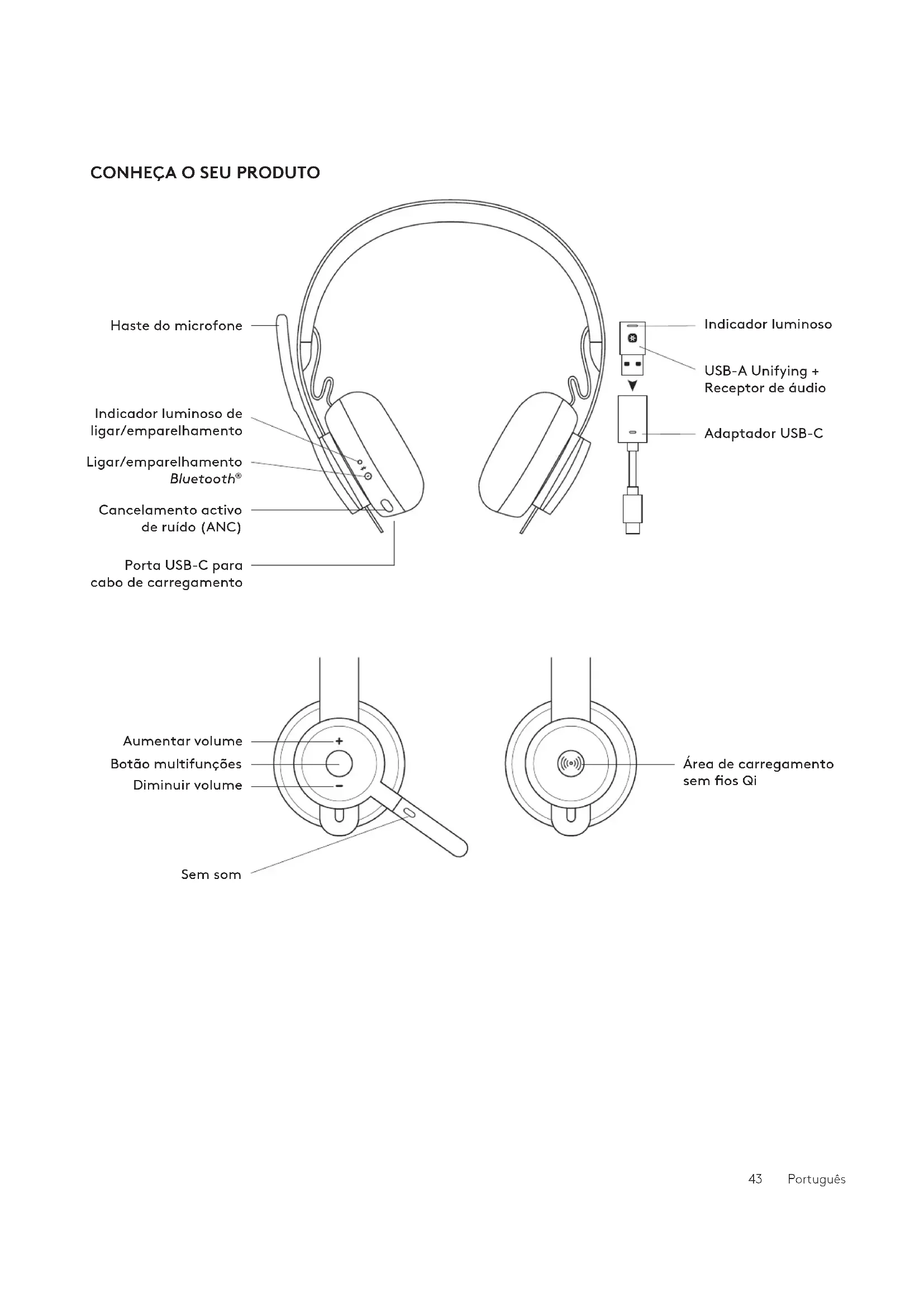 Porta USB-C para cabo de carregamento Adaptador USB-C Indicador luminoso USB-A Unifying + Receptor de áudio Aumentar volume Diminuir volume Sem som Botão multifunções Área de carregamento sem os Qi 43 PortuguêsUSB-A USB-C ADAPTER USB-A | USB-C Logi Zone