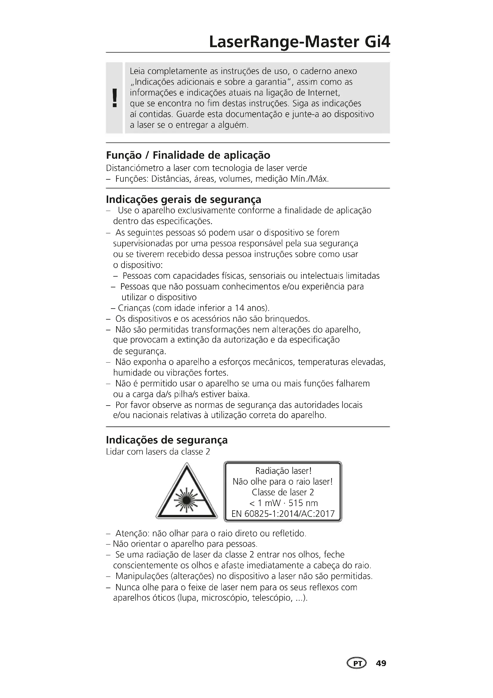 – Atenção: não olhar para o raio direto ou reetido. – Não orientar o aparelho para pessoas. – Se uma radiação de laser da classe 2 entrar nos olhos, feche conscientemente os olhos e afaste imediatamente a cabeça do raio. – Manipulações (alterações) no dispositivo a laser não são permitidas. – Nunca olhe para o feixe de laser nem para os seus reexos com aparelhos óticos (lupa, microscópio, telescópio, ...). Radiação laser! Não olhe para o raio laser! Classe de laser 2 < 1 mW · 515 nm EN 60825-1:2014/AC:2017 Indicações de segurança Lidar com lasers da classe 2 Indicações gerais de segurança – Use o aparelho exclusivamente conforme a nalidade de aplicação dentro das especicações. – As seguintes pessoas só podem usar o dispositivo se forem supervisionadas por uma pessoa responsável pela sua segurança ou se tiverem recebido dessa pessoa instruções sobre como usar o dispositivo: – Pessoas com capacidades físicas, sensoriais ou intelectuais limitadas – Pessoas que não possuam conhecimentos e/ou experiência para utilizar o dispositivo – Crianças (com idade inferior a 14 anos). – Os dispositivos e os acessórios não são brinquedos. – Não são permitidas transformações nem alterações do aparelho, que provocam a extinção da autorização e da especicação de segurança. – Não exponha o aparelho a esforços mecânicos, temperaturas elevadas, humidade ou vibrações fortes. – Não é permitido usar o aparelho se uma ou mais funções falharem ou a carga da/s pilha/s estiver baixa. – Por favor observe as normas de segurança das autoridades locais e/ou nacionais relativas à utilização correta do aparelho. Distanciómetro a laser com tecnologia de laser verde – Funções: Distâncias, áreas, volumes, medição Mín./Máx. Função / Finalidade de aplicação Leia completamente as instruções de uso, o caderno anexo „Indicações adicionais e sobre a garantia“, assim como as informações e indicações atuais na ligação de Internet, que se encontra no fim destas instruções. Siga as indicações aí contidas. Guarde esta documentação e junte-a ao dispositivo a laser se o entregar a alguém. !50 Abra o compartimento de pilhas e insira as pilhas (2 x tipo AAA) de acordo com os símbolos de instalação. Observe a polaridade correta. Colocar as pilhas