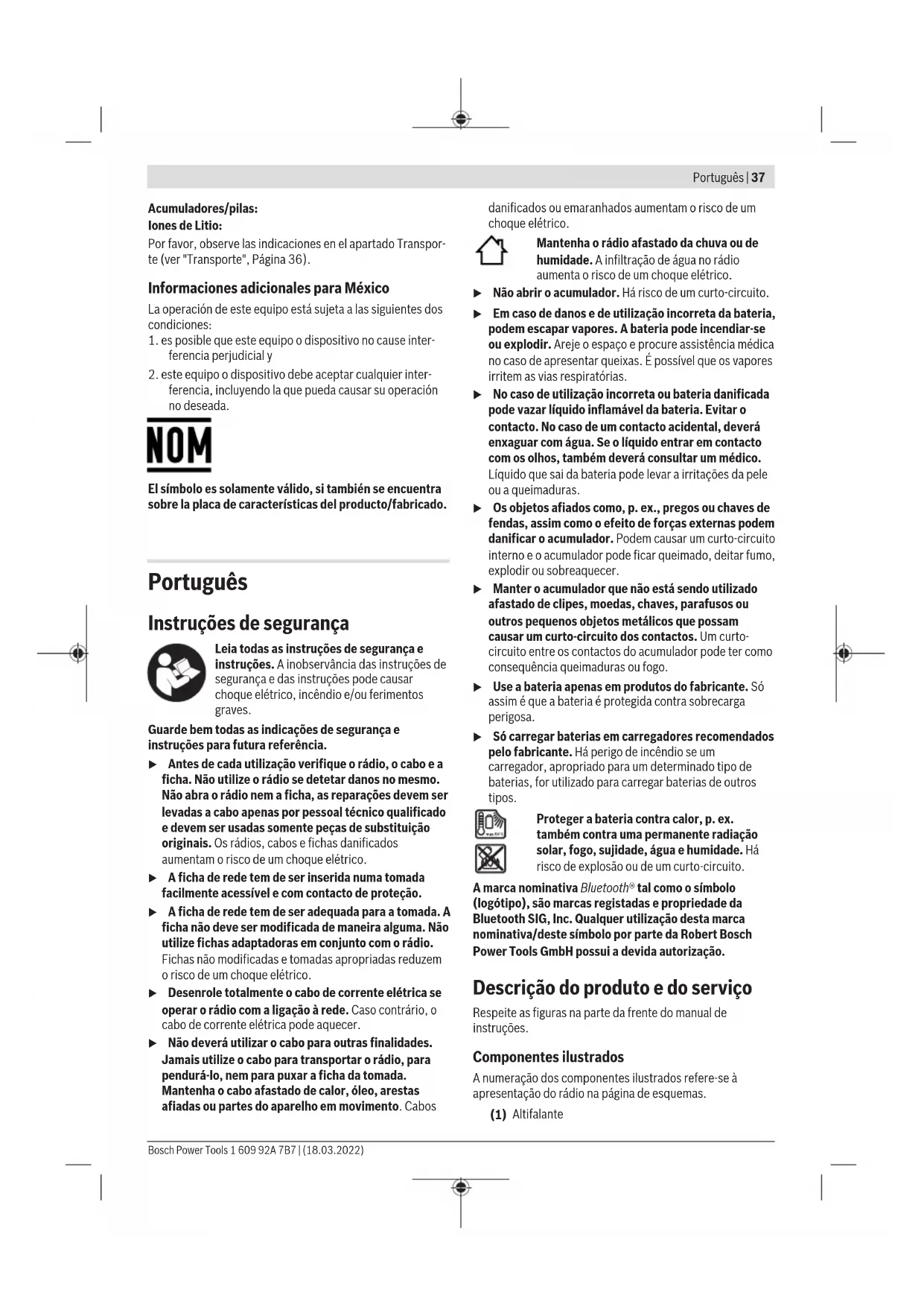 ferencia, incluyendo la que pueda causar su operación no deseada. El símbolo es solamente válido, si también se encuentra sobre la placa de características del producto/fabricado. Português Instruções de segurança Leia todas as instruções de segurança e instruções. A inobservância das instruções de segurança e das instruções pode causar choque elétrico, incêndio e/ou ferimentos graves. Guarde bem todas as indicações de segurança e instruções para futura referência. u Antes de cada utilização verifique o rádio, o cabo e a ficha. Não utilize o rádio se detetar danos no mesmo. Não abra o rádio nem a ficha, as reparações devem ser levadas a cabo apenas por pessoal técnico qualificado e devem ser usadas somente peças de substituição originais. Os rádios, cabos e fichas danificados aumentam o risco de um choque elétrico. u A ficha de rede tem de ser inserida numa tomada facilmente acessível e com contacto de proteção. u A ficha de rede tem de ser adequada para a tomada. A ficha não deve ser modificada de maneira alguma. Não utilize fichas adaptadoras em conjunto com o rádio. Fichas não modificadas e tomadas apropriadas reduzem o risco de um choque elétrico. u Desenrole totalmente o cabo de corrente elétrica se operar o rádio com a ligação à rede. Caso contrário, o cabo de corrente elétrica pode aquecer. u Não deverá utilizar o cabo para outras finalidades. Jamais utilize o cabo para transportar o rádio, para pendurá-lo, nem para puxar a ficha da tomada. Mantenha o cabo afastado de calor, óleo, arestas afiadas ou partes do aparelho em movimento. Cabos danificados ou emaranhados aumentam o risco de um choque elétrico. Mantenha o rádio afastado da chuva ou de humidade. A infiltração de água no rádio aumenta o risco de um choque elétrico. u Não abrir o acumulador. Há risco de um curto-circuito.u Em caso de danos e de utilização incorreta da bateria, podem escapar vapores. A bateria pode incendiar-se ou explodir. Areje o espaço e procure assistência médica no caso de apresentar queixas. É possível que os vapores irritem as vias respiratórias. u No caso de utilização incorreta ou bateria danificada pode vazar líquido inflamável da bateria. Evitar o contacto. No caso de um contacto acidental, deverá enxaguar com água. Se o líquido entrar em contacto com os olhos, também deverá consultar um médico. Líquido que sai da bateria pode levar a irritações da pele ou a queimaduras. u Os objetos afiados como, p.ex., pregos ou chaves de fendas, assim como o efeito de forças externas podem danificar o acumulador. Podem causar um curto-circuito interno e o acumulador pode ficar queimado, deitar fumo, explodir ou sobreaquecer. u Manter o acumulador que não está sendo utilizado afastado de clipes, moedas, chaves, parafusos ou outros pequenos objetos metálicos que possam causar um curto-circuito dos contactos. Um curto- circuito entre os contactos do acumulador pode ter como consequência queimaduras ou fogo. u Use a bateria apenas em produtos do fabricante. Só assim é que a bateria é protegida contra sobrecarga perigosa. u Só carregar baterias em carregadores recomendados pelo fabricante. Há perigo de incêndio se um carregador, apropriado para um determinado tipo de baterias, for utilizado para carregar baterias de outros tipos. Proteger a bateria contra calor, p.ex. também contra uma permanente radiação solar, fogo, sujidade, água e humidade. Há risco de explosão ou de um curto-circuito. A marca nominativa Bluetooth® tal como o símbolo (logótipo), são marcas registadas e propriedade da Bluetooth SIG, Inc. Qualquer utilização desta marca nominativa/deste símbolo por parte da Robert Bosch Power Tools GmbH possui a devida autorização. Descrição do produto e do serviço Respeite as figuras na parte da frente do manual de instruções. Componentes ilustrados A numeração dos componentes ilustrados refere‑se à apresentação do rádio na página de esquemas. (1) Altifalante Bosch Power Tools 1 609 92A 7B7 | (18.03.2022)38 | Português (2) Pega de transporte (3) Luz de controlo da ligação de corrente alternada (4) Tampa de cobertura da ligação de corrente alternada (5) Tomada da ligação de corrente alternada(Power Outlets) (6) Compartimento de arrumação (7) Tampa do compartimento do suporte de dados(Digital Media Bay) (8) Alavanca de travamento da tampa do compartimento do suporte de dados (9) Cabo AUX (10) Tomada AUX‑IN (11) Tomada de carregamento USB (12) Tecla Mute (13) Tecla de procura para baixo (14) Botão Clock (GPB18V‑5C) (15) Tecla de ligar/desligar (16) Mostrador (17) Teclas para memorizar programas (18) Botão Source (19) Tecla de procura para cima (20) Tecla Equalizer (21) Tecla Bluetooth® (22) Botão Menu (GPB18V‑5SC) (23) Sistema de retenção da cobertura do compartimento da bateria (24) Tampa do compartimento da bateria (baterias de reserva) (25) Tecla de desbloqueio da bateria