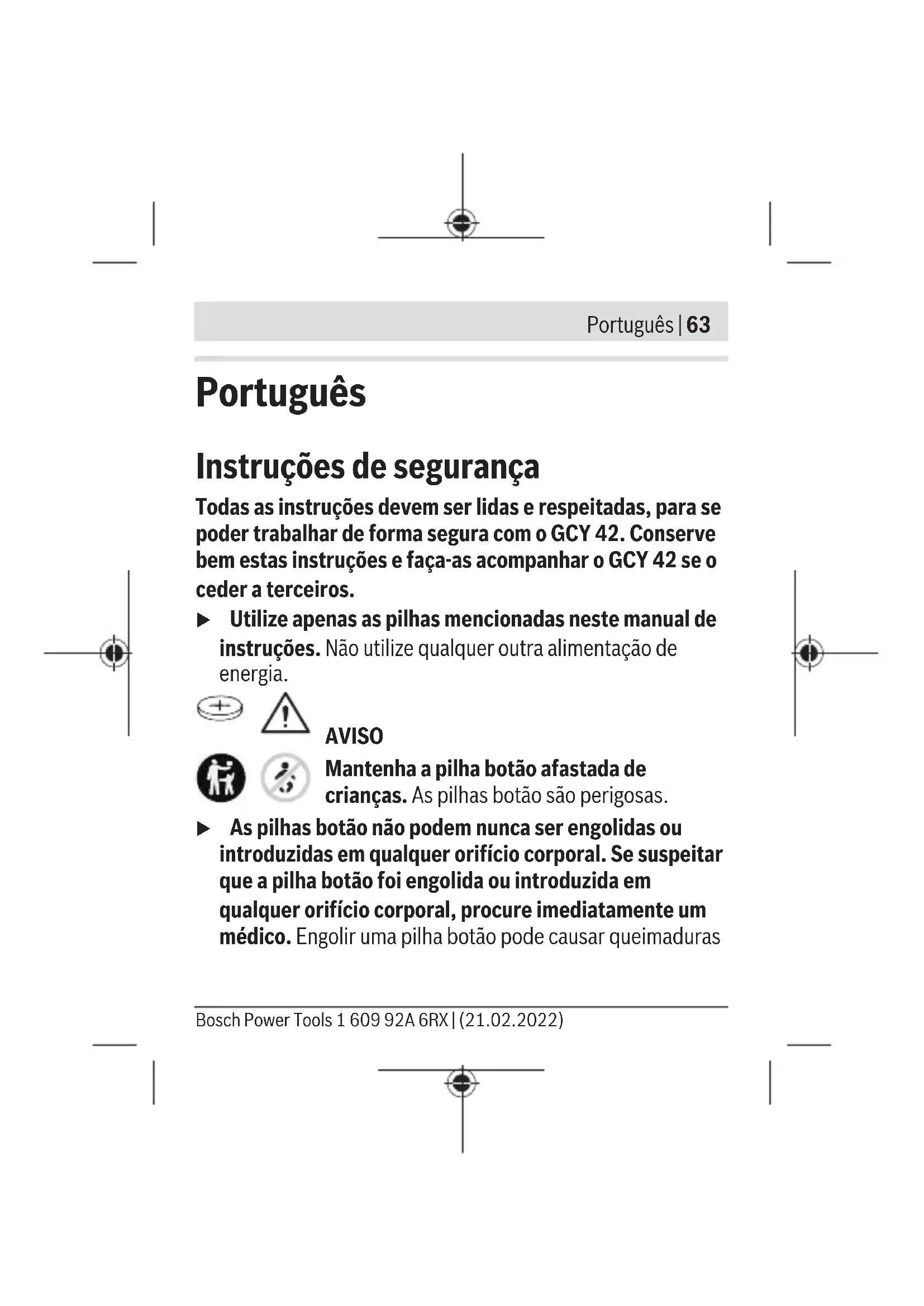 rencia, incluyendo la que pueda causar su operación no deseada. 1 609 92A 6RX | (21.02.2022) Bosch Power ToolsPortuguês | 63 Português Instruções de segurança Todas as instruções devem ser lidas e respeitadas, para se poder trabalhar de forma segura com oGCY42. Conserve bem estas instruções e faça-as acompanhar oGCY42 se o ceder a terceiros. u Utilize apenas as pilhas mencionadas neste manual de instruções. Não utilize qualquer outra alimentação de energia. AVISO Mantenha a pilha botão afastada de crianças. As pilhas botão são perigosas. u As pilhas botão não podem nunca ser engolidas ou introduzidas em qualquer orifício corporal. Se suspeitar que a pilha botão foi engolida ou introduzida em qualquer orifício corporal, procure imediatamente um médico. Engolir uma pilha botão pode causar queimaduras Bosch Power Tools 1 609 92A 6RX | (21.02.2022)64 | Português químicas internas graves num espaço de 2 horas e causar a morte. u Ao substituir a pilha botão, certifique-se de que procede corretamente. Há risco de explosão. u Utilize apenas as pilhas botão mencionadas neste manual de instruções. Não utilize outras pilhas botão ou outra alimentação de energia. u Não tente recarregar pilhas botão e não curte-circuite a pilha botão. A pilha botão pode perder a estanqueidade, explodir, queimar e ferir pessoas. u Elimine as pilhas botão descarregadas de forma correta. As pilhas botão podem perder a estanqueidade e, consequentemente, danificar o produto ou ferir pessoas. u Não sobreaqueça a pilha botão e não a mande para o fogo. A pilha botão pode perder a estanqueidade, explodir, queimar e ferir pessoas. u Não danifique a pilha botão e não a desmonte. A pilha botão pode perder a estanqueidade, explodir, queimar e ferir pessoas. u Não deixe uma pilha botão danificada entrar em contacto com água. O lítio que sai da pilha pode formar 1 609 92A 6RX | (21.02.2022) Bosch Power ToolsPortuguês | 65 hidrogénio em contacto com a água e causar incêndio, explosão ou ferimentos em pessoas. A marca nominativa Bluetooth® tal como o símbolo (logótipo), são marcas registadas e propriedade da Bluetooth SIG, Inc. Qualquer utilização desta marca nominativa/deste símbolo por parte da Robert Bosch Power Tools GmbH possui a devida autorização. u Não use mais o módulo Bluetooth® se não conseguir fechar a cobertura, retire a pilha botão e mande-o reparar. Descrição do produto e do serviço Utilização adequada O Bluetooth® Low Energy Module GCY42 permite a personalização e a verificação de estado de uma ferramenta elétrica, assim como a transmissão de definições e ajustes com base na tecnologia de radiotransmissão Bluetooth®. A transferência de dados tem de ser aprovada pelo utilizador. As informações acerca das funções Connectivity podem ser consultadas na aplicação (App) Bosch Toolbox ou nas instruções de utilização da ferramenta elétrica usada. Bosch Power Tools 1 609 92A 6RX | (21.02.2022)66 | Português Componentes ilustrados A numeração dos componentes exibidos diz respeito às representações existentes nas páginas dos gráficos. (1) Pilha botão (2) Bluetooth® Low Energy Module GCY 42 (3) Espaçador