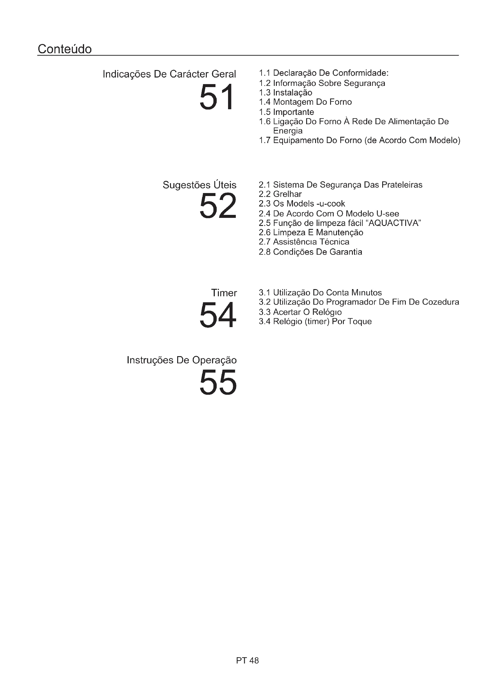 O tabuleiro buleiro de recolha de sucos serve para aparar o suco dos grelhados. Pode ser colocado por cima da grelha ou introduzido nas calhas. Só se utiliza com o Grel hador, o Espeto ou o Turbogrelhador. Nos outros modos de cozedura deve ser retirado do forno. Nunca utilizar este tabuleiro como recipiente para assar, pois causaria salpicos de gordura e fumos, e rapidamente sujaria o forno. PT 51 Obrigado por ter optado por um dos nossos produtos. Para tirar o maior proveito possível do seu forno, recomendamos que: Leia atentamente este manual de instruções de utilização; ele contém instruções importantes sobre a instalação, a utilização e a manutenção seguras deste forno. Mantenha este manual de instruções à mão, num local seguro, para o poder consultar sempre que necessário. Quando o forno for ligado pela primeira vez, ele poderá emitir fumo com um cheiro acre. Isto fica a dever-se ao facto de o agente aglutinante dos painéis de isolamento existentes à volta do forno ter sido aquecido pela primeira vez. Trata-se de um facto absolutamente normal; se ele ocorrer, terá apenas de esperar que o fumo se dissipe antes de introduzir os alimentos no forno. Devido à sua natureza, um forno aquece muito, em especial a sua porta de vidro.