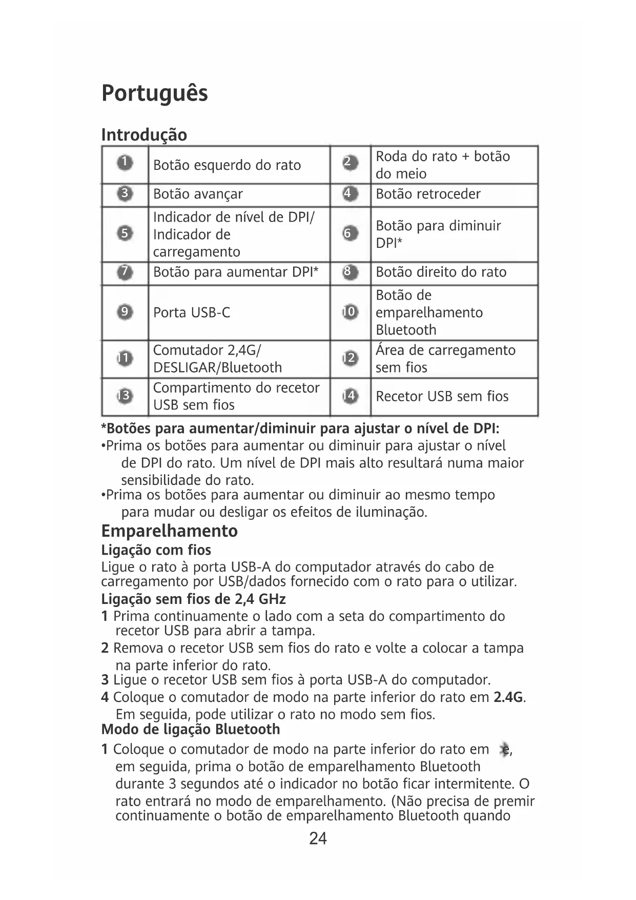 - Prima os botões para aumentar ou diminuir ao mesmo tempo para mudar ou desligar os efeitos de iluminação. Emparelhamento Ligação com os Ligue o rato à porta USB-A do computador através do cabo de carregamento por USB/dados fornecido com o rato para o utilizar. Ligação sem os de 2,4 GHz 1 Prima continuamente o lado com a seta do compartimento do recetor USB para abrir a tampa. 2 Remova o recetor USB sem os do rato e volte a colocar a tampa na parte inferior do rato. 3 Ligue o recetor USB sem os à porta USB-A do computador. 4 Coloque o comutador de modo na parte inferior do rato em 2.4G. Em seguida, pode utilizar o rato no modo sem os. Modo de ligação Bluetooth 1 Coloque o comutador de modo na parte inferior do rato em e, em seguida, prima o botão de emparelhamento Bluetooth durante 3 segundos até o indicador no botão car intermitente. O rato entrará no modo de emparelhamento. (Não precisa de premir continuamente o botão de emparelhamento Bluetooth quando 24emparelhar pela primeira vez. Depois de colocar o comutador de modo em , o indicador no botão de emparelhamento ca intermitente e o rato entra automaticamente no modo de emparelhamento Bluetooth.) 2 Inicie o emparelhamento Bluetooth no dispositivo Bluetooth. Depois de emparelhar, pode utilizar o modo de ligação Bluetooth. O rato apenas funciona com dispositivos com Windows 7 ou mais recente, Android 5.0 ou mais recente e macOS 10.10 ou mais recente. Certos modelos Android e macOS poderão não ser compatíveis com o rato por Bluetooth. Carregamento O rato contém uma bateria recarregável incorporada (não removível) que suporta o carregamento com e sem os. Carregamento com os Para carregar o rato, ligue-o à porta USB-A do computador ou a um adaptador de energia através do cabo de carregamento por USB/ dados fornecido com o rato para o utilizar. Carregamento sem os O rato é compatível com a norma de carregamento sem os Qi. O rato pode ser carregado colocando o mesmo no painel de carregamento sem os e alinhando a área de carregamento sem os na parte inferior do rato com a área de carregamento sem os no painel de carregamento sem os. o painel de carregamento sem os precisa de ser adquirido separadamente. Mais funções Visite https://consumer.huawei.com/en/support/ , procure o nome do seu dispositivo e, em seguida, transra e instale o controlador do rato para começar a explorar mais funções do rato. Informações de segurança