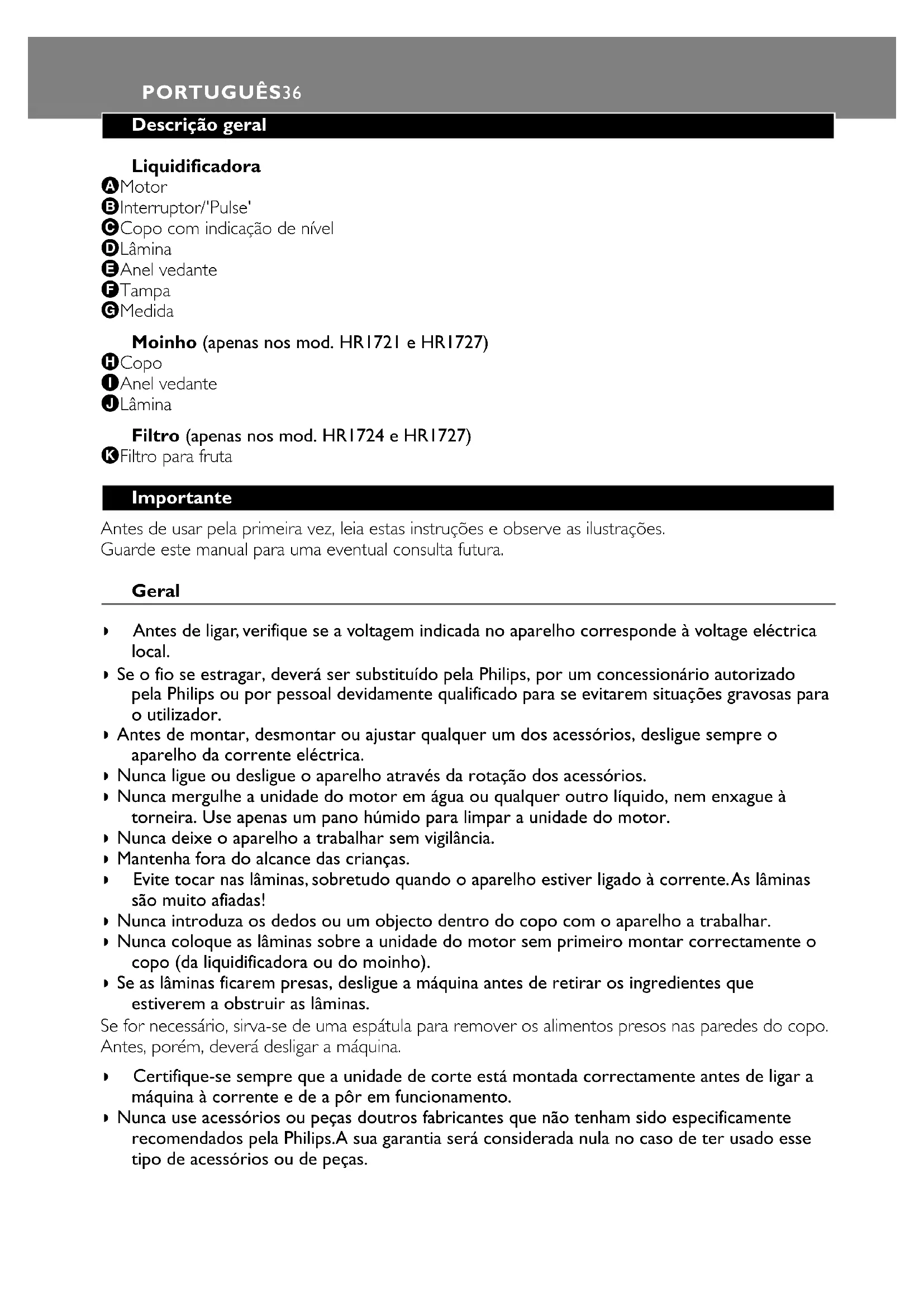 Servite caldo o freddo. Tritatutto Solo modelli HR1721 e HR1727 Come usare il tritatutto 1 Mettete gli ingredienti nel vaso del frullatore (H) (fig. 9), Potete usare ingredienti secchi e bagnati. 2 Non riempite il vaso oltre l'indicazione "MAX". ITALIANO343 Tenendo il tritatutto capovolto, avitatelo sul gruppo motore (A) ruotando in senso orario fino a quando un “click” (fig. 10). Controllate che la guarnizione in gomma sia stata inserita correttamente. 4 Avvitate il gruppo lame sul vaso del frullatore, ruotando in senso orario (fig. 11). 5 Capovolgete il tritatutto e avvitatelo sul gruppo motore (A) ruotando in senso orario fino a quando sentirete un "click" (fig. 12). 6 Controllate che l'apparecchio sia collegato alla presa di corrente. 7 Accendete l'apparecchio e lasciatelo in funzione fino a quando gli ingredienti sono tritati finemente. Ci vorranno circa 10-30 secondi. Come smontare il tritatutto 1 Togliete la spina dalla presa. 2 Se il tritatutto è ancora inserito sul gruppo motore e toglietelo dal gruppo motore ruotando in senso antiorario. 3 Capovolgetel il tritatutto e togliete il gruppo lame dal vaso del frullatore ruotando in senso antiorario. 4 Lavate sempre le parti staccabili subito dopo l'uso. Pulizia Vi consigliamo di lavare le parti staccabili immediatamente dopo l'uso. Prima di pulire l'apparecchio, togliete sempre la spina dalla presa. ◗ Non lavate in lavastoviglie il gruppo motore, il gruppo lame, il filtro e le guarnizioni. ◗ Smontate sempre le parti staccabili prima di pulirle. Non dimenticate di togliere le guarnizioni dal gruppo lame (frullatore e tritatutto). ◗ Evitate di toccare le lame, che sono molto taglienti! Il vaso del frullatore e del tritatutto (senza gruppo lame), il coperchio e il misurino possono essere lavati in lavastoviglie. Gruppo motore ◗ Pulite il gruppo motore con un panno umido. Non risciacquate il gruppo motore sotto l'acqua corrente. Non usate sostanze abrasive, pagliette, alcool ecc. Come riporre l'apparecchio. Avvolgere il cavo in eccesso attorno alla base dell'apparecchio. Ambiente ◗ A fine vita non gettare questo apparecchio nella normale raccolta dei rifiuti, ma portalo presso uno dei punti di raccolta autorizzati. In questo modo contribuirai a preservare l'ambiente ( 13). Garanzia & Assistenza Se avete bisogno di ulteriori informazioni o in caso di problemi, vi preghiamo di visitare il sito Philips www.philips.com oppure contattate il Centro Assistenza Philips del vostro Paese (per conoscere il numero di telefono, consultate l'opuscolo della garanzia.) Qualora nel vostro Paese non ci sia un Centro Assistenza Clienti, contattate il vostro rivenditore di fiducia oppure il Service Department of Philips Domestic Appliances and Personal Care BV. ITALIANO 35Descrição geral Liquidificadora A Motor B Interruptor/'Pulse' C Copo com indicação de nível D Lâmina E Anel vedante F Tampa G Medida Moinho (apenas nos mod. HR1721 e HR1727) H Copo I Anel vedante J Lâmina Filtro (apenas nos mod. HR1724 e HR1727) K Filtro para fruta Importante Antes de usar pela primeira vez, leia estas instruções e observe as ilustrações. Guarde este manual para uma eventual consulta futura. Geral ◗ Antes de ligar, verifique se a voltagem indicada no aparelho corresponde à voltage eléctrica local. ◗ Se o fio se estragar, deverá ser substituído pela Philips, por um concessionário autorizado pela Philips ou por pessoal devidamente qualificado para se evitarem situações gravosas para o utilizador. ◗ Antes de montar, desmontar ou ajustar qualquer um dos acessórios, desligue sempre o aparelho da corrente eléctrica. ◗ Nunca ligue ou desligue o aparelho através da rotação dos acessórios. ◗ Nunca mergulhe a unidade do motor em água ou qualquer outro líquido, nem enxague à torneira. Use apenas um pano húmido para limpar a unidade do motor. ◗ Nunca deixe o aparelho a trabalhar sem vigilância. ◗ Mantenha fora do alcance das crianças. ◗ Evite tocar nas lâminas, sobretudo quando o aparelho estiver ligado à corrente.As lâminas são muito afiadas! ◗ Nunca introduza os dedos ou um objecto dentro do copo com o aparelho a trabalhar. ◗ Nunca coloque as lâminas sobre a unidade do motor sem primeiro montar correctamente o copo (da liquidificadora ou do moinho). ◗ Se as lâminas ficarem presas, desligue a máquina antes de retirar os ingredientes que estiverem a obstruir as lâminas. Se for necessário, sirva-se de uma espátula para remover os alimentos presos nas paredes do copo. Antes, porém, deverá desligar a máquina. ◗ Certifique-se sempre que a unidade de corte está montada correctamente antes de ligar a máquina à corrente e de a pôr em funcionamento. ◗ Nunca use acessórios ou peças doutros fabricantes que não tenham sido especificamente recomendados pela Philips.A sua garantia será considerada nula no caso de ter usado esse tipo de acessórios ou de peças. PORTUGUÊS36Liquidificadora ◗ Nunca encha o copo com ingredientes que estejam mais quentes do que 80 cC. ◗ Para evitar salpicos, não deite mais que 1.25 litros de líquido no copo, sobretudo se estiver a trabalhar na velocidade mais elevada. Não deite mais do que 1 litro no copo se estiver a processar líquidos quentes ou a preparar receitas que formem grande quantidade de espuma. ◗ Nunca se esqueça de colocar o anel vedante na unidade de corte antes de colocar o copo. Caso contrário, haverá fugas. ◗ Verifique sempre se a tampa está bem fechada e se a medida foi colocada correctamente antes de ligar o aparelho. Moinho ◗ Nunca use o moinho durante mais de 30 segundos seguidos, sem interrupção. Deixe o moinho arrefecer durante pelo menos 1 minuto entre os vários ciclos de processamento. ◗ Nunca se esqueça de colocar o anel vedante sobre a unidade de corte antes de montar o copo; caso contrário, haverá derrames para fora. ◗ Os alhos, a flor de anis e afins devem ser sempre trabalhados juntamente com outros ingredientes. Se os 