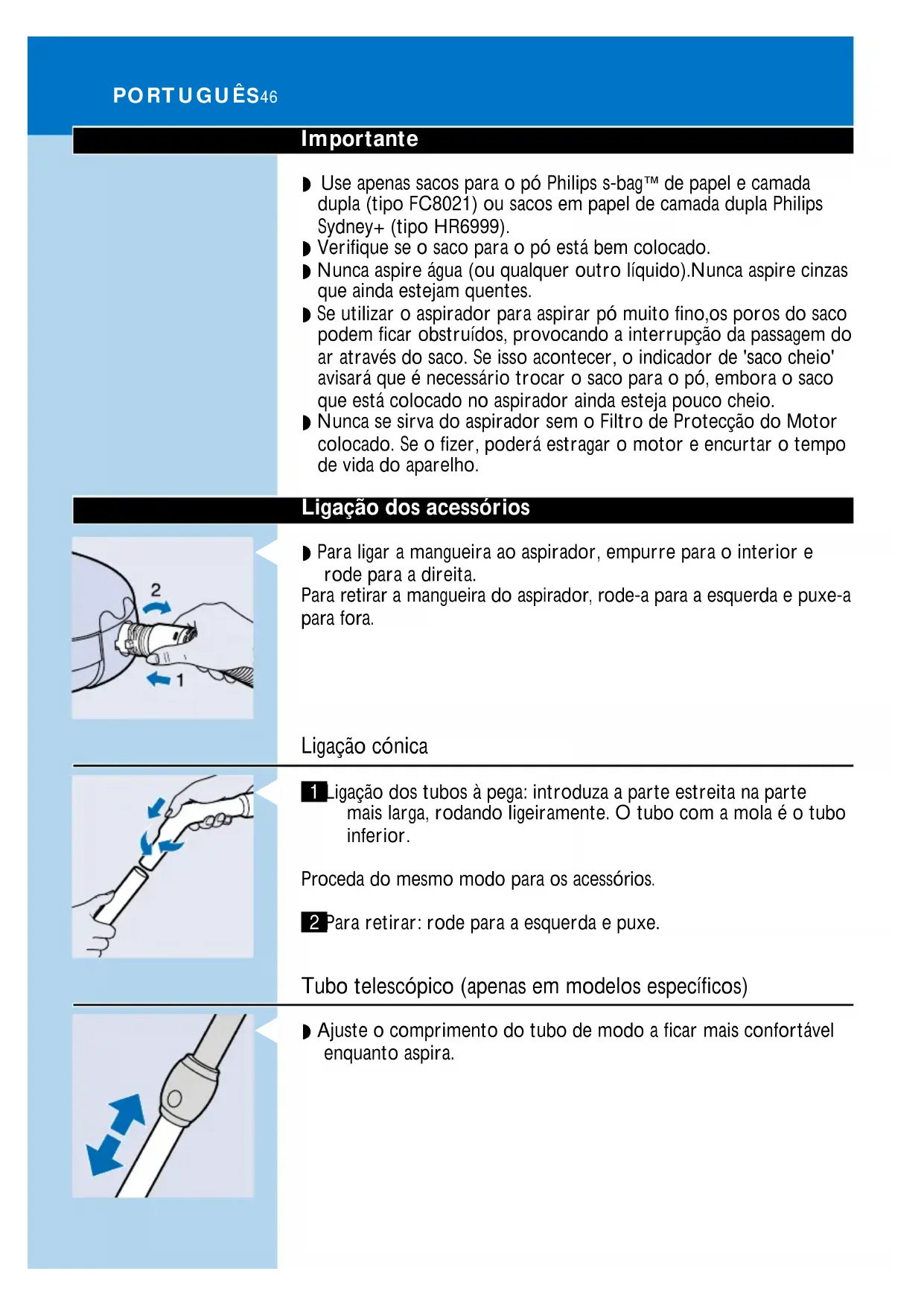 5 Controllate che la bocchetta,il tubo o il flessibile non siano ostruiti. 6 Per rimuovere le eventuali ostruzioni,smontate l'accessorio bloccato e rimontatelo (per quanto possibile) al contrario. Accendete quindi l'aspirapolvere e fate passare un getto d'aria attraverso l'accessorio ostruito,procedendo nella direzione opposta. ITALIANO 45Importante ◗ Use apenas sacos para o pó Philips s-bag` de papel e camada dupla (tipo FC8021) ou sacos em papel de camada dupla Philips Sydney+ (tipo HR6999). ◗ Verifique se o saco para o pó está bem colocado. ◗ Nunca aspire água (ou qualquer outro líquido).Nunca aspire cinzas que ainda estejam quentes. ◗ Se utilizar o aspirador para aspirar pó muito fino,os poros do saco podem ficar obstruídos, provocando a interrupção da passagem do ar através do saco. Se isso acontecer, o indicador de 'saco cheio' avisará que é necessário trocar o saco para o pó, embora o saco que está colocado no aspirador ainda esteja pouco cheio. ◗ Nunca se sirva do aspirador sem o Filtro de Protecção do Motor colocado. Se o fizer, poderá estragar o motor e encurtar o tempo de vida do aparelho. Ligação dos acessórios
