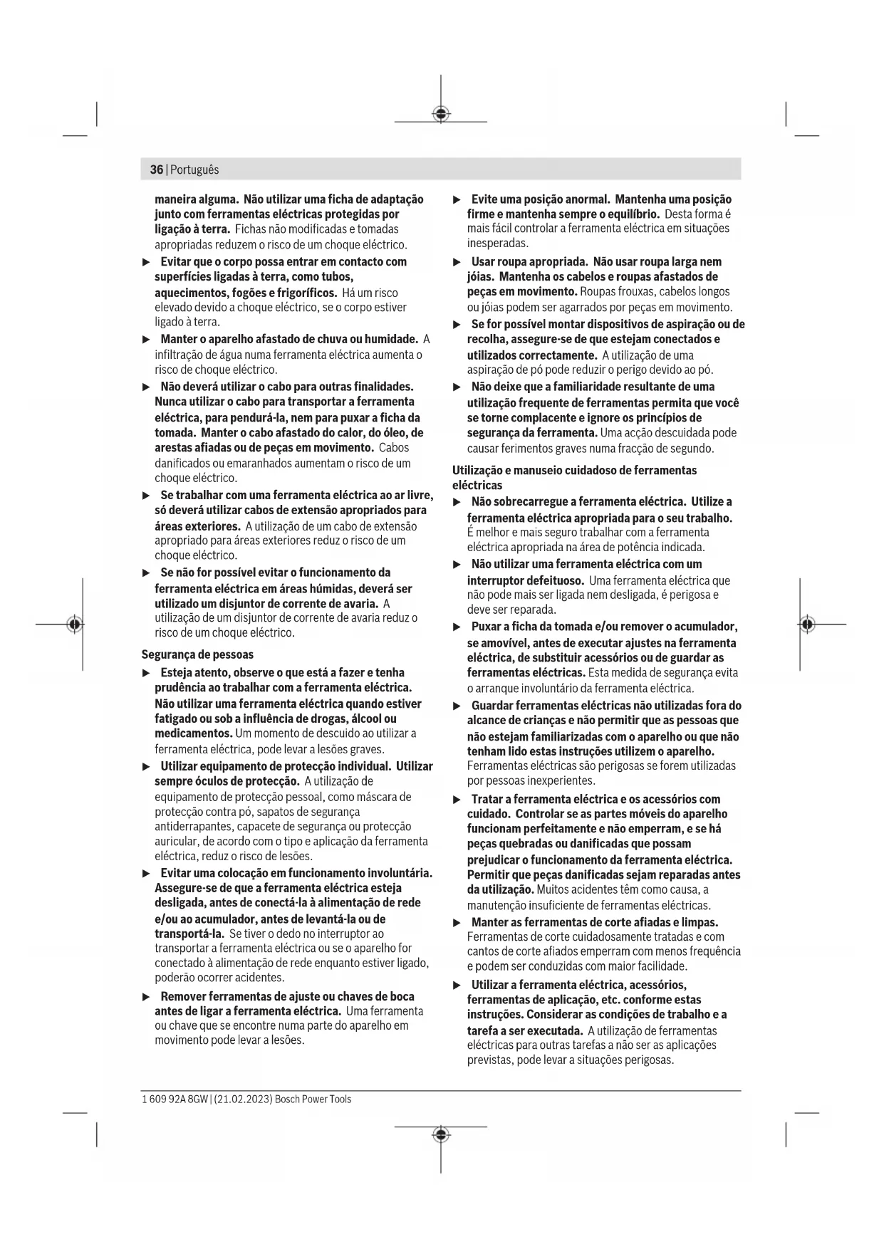 (2608000766) – Para a aplicação universal em superfícies planas e abauladas – O conjunto é composto por uma prato de lixar macio e um estofo intermédio (2608000765). O prato de lixar só pode ser utilizado com o estofo intermédio. Prato de lixar de dureza média (2608000764) – Elevada capacidade de desbaste, ideal para reboco duro e remoção de tintas de parede antigas – Para a utilização em superfícies planas – O apoio de aspiração ideal facilita o trabalho na utilização de um aspirador. A) Volume de fornecimento padrão Trocar o estofo intermédio (verfiguraA) Na utilização do prato de lixar macio (volume de fornecimento padrão) tem de ser sempre utilizado um estofo intermédio(14). Para remover o estofo intermédio(14) levante-o lateralmente e retire-o para fora do prato de lixar(16). Antes de colocar um estofo intermédio novo, remova a sujidade e o pó do prato de lixar(16), p. ex. com um pincel. 1 609 92A 8GW | (21.02.2023) Bosch Power ToolsPortuguês | 39 A superfície do prato de lixar(16) é feita de um tecido de velcro, para que possa fixar de forma rápida e fácil o estofo intermédio. Pressione bem o estofo intermédio(14) no lado de baixo do prato de lixar(16). Para garantir uma aspiração de pó ideal, certifique-se de que os furos do estofo intermédio(14) coincidem com os furos no prato de lixar(16). Substituir prato de lixar (verfiguraB) Nota: substitua de imediato um prato de lixar (16) danificado. Retire o disco de lixar(13) e o estofo intermédio(14). Desenrosque totalmente o parafuso (15) e retire o prato de lixar (16). Coloque o novo prato de lixar (16) e aperte novamente o parafuso. Nota: ao colocar o prato de lixar, certifique-se de que os dentes do arrastador encaixam nos entalhes do prato de lixar. Nota: um suporte do prato de lixar danificado só pode ser substituído por um posto de assistência técnica autorizado para ferramentas elétricas Bosch. Colocar/retirar o tubo de extensão (verfigurasC−D) Utilize os tubos de extensão(9) apenas se necessário: ao trabalhar sem tubo de extensão, o esforço necessário para o lixamento é claramente reduzido. Nota: só podem ser usados no máximo 2tubos de extensão. Soltar a ligação entre a cabeça de lixar/peça de agarrar/ tubo de extensão (verfiguraC): – ➊ Abra a alavanca tensora(8). – ➋ Abra o gancho de retenção(7). – ➌ Separe as peças ligadas até ao momento. Fechar a ligação entre a cabeça de lixar/peça de agarrar/ tubo de extensão (verfiguraD): – ➍ Consoante a ligação desejada, encaixe a cabeça de lixar(10), peça de agarrar(6) ou tubos de extensão(9). – ➎ Fecha o gancho de retenção(7). – ➏ Pressione a alavanca tensora(8), de modo a que fique em ângulo reto em relação à cabeça de lixar(10), peça de agarrar(6) ou tubo de extensão(9). – ➐ Aperte bem o parafuso excêntrico(20). – ➑ Feche a alavanca tensora(8). Verifique sempre se todas as peças de união estão seguras e bem unidas com o gancho de retenção(7) e as alavancas tensoras(8). Aspiração de pó/de aparas Os pós dos materiais podem ser prejudiciais para a saúde. O contacto ou a inalação de pós pode provocar reações alérgicas e/ou doenças nas vias respiratórias do utilizador ou das pessoas que se encontrem por perto. Determinados pós são considerados cancerígenos. – Se possível deverá usar uma aspiração de pó apropriada para o material. – Assegure uma boa ventilação do local de trabalho. – Use sempre uma máscara de proteção respiratória com classe de filtro P2. Ligar a aspiração de pó (verfiguraE) Selecione em função do aspirador usado uma das duas possibilidades de ligação: – Encaixe a mangueira de aspiração(21) no bocal de sopro(5) na peça de agarrar(6) e deixe-a engatar. Ligue a mangueira de aspiração(21) a um aspirador (acessório). – Encaixe o adaptador(22) no bocal de sopro(5) e deixe-o engatar. Encaixe o bico(23) do aspiradores no adaptador(22). O aspirador de pó deve ser apropriado para o material a ser trabalhado. Utilize um aspirador especial para aspirar pó que seja extremamente nocivo à saúde, cancerígeno ou seco. Para grandes superfícies use o aspirador GAS35L/MAFC ou GAS55MAFC, uma vez que estes garantem a potência de aspiração contínua necessária. Ao trabalhar em superfícies verticais, segure a ferramenta elétrica de modo a que a mangueira de aspiração aponte para baixo. Montar/desmontar o clipe da mangueira/cabo (verfiguraF) Vire o clipe da mangueira/cabo(24) sobre a mangueira de aspiração(21). Insira o cabo de rede na ranhura para cabos do clipe da mangueira/cabo. Para a desmontagem, retire o clipe da mangueira/cabo(24) da mangueira de aspiração(21) e retire o cabo de rede do clipe da mangueira/cabo. Funcionamento Colocação em funcionamento u Observar a tensão de rede! A tensão da fonte de corrente elétrica tem de coincidir com a que consta na chapa de identificação da ferramenta elétrica. Ferramentas elétricas marcadas para 230V também podem ser operadas com 220V. Pré-selecionar o número de rotações Com a roda para pré-seleção da velocidade de rotação(2) pode pré-selecionar o número de rotações necessário mesmo durante a operação. Números mais altos significam um número de rotações maior, números mais baixos um número de rotações menor. A Constant-Electronic mantém o número de rotações durante a marcha em vazio e sob carga quase que constante e assegura um desempenho de trabalho uniforme. O arranque suave eletrónico limita o binário ao ligar e aumenta a durabilidade do motor. Bosch Power Tools 1 609 92A 8GW | (21.02.2023)40 | Português Ligar/desligar u Certifique-se de que consegue acionar o interruptor de ligar/desligar sem ter de soltar o punho. Para ligar a ferramenta elétrica, empurre o interruptor de ligar/desligar(3) para a frente, para que apareça no interruptor "I". Para desligar a ferramenta elétrica, empurre o interruptor de liga