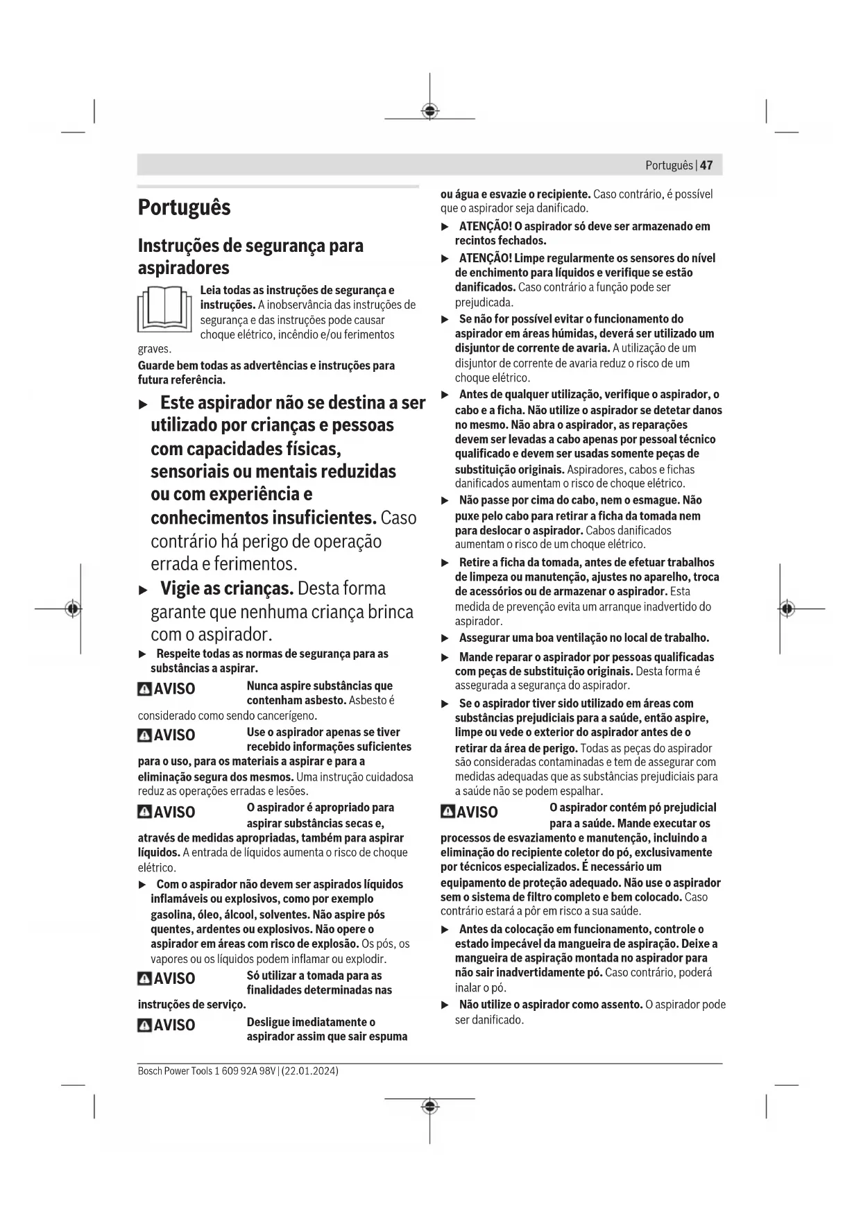 Servicio técnico y atención al cliente El servicio técnico le asesorará en las consultas que pueda Ud. tener sobre la reparación y mantenimiento de su produc- to, así como sobre piezas de recambio. Las representacio- nes gráficas tridimensionales e informaciones de repuestos se encuentran también bajo: www.bosch-pt.com El equipo asesor de aplicaciones de Bosch le ayuda gustosa- mente en caso de preguntas sobre nuestros productos y sus accesorios. Para cualquier consulta o pedido de piezas de repuesto es imprescindible indicar el nº de artículo de 10dígitos que fi- gura en la placa de características del producto. España Robert Bosch España S.L.U. Departamento de ventas Herramientas Eléctricas C/Hermanos García Noblejas, 19 28037 Madrid Para efectuar su pedido online de recambios o pedir la reco- gida para la reparación de su máquina, entre en la página www.herramientasbosch.net. Tel. Asesoramiento al cliente: 902 531 553 Fax: 902 531554 México Robert Bosch, S. de R.L. de C.V. Calle Robert Bosch No.405 C.P. 50071 Zona Industrial, Toluca– Estado de México Tel.: (52) 55 528430-62 Tel.: 800 6271286 www.boschherramientas.com.mx Direcciones de servicio adicionales se encuentran bajo: www.bosch-pt.com/serviceaddresses Eliminación El aspirador, los accesorios y los embalajes deberán some- terse a un proceso de recuperación que respete el medio ambiente. ¡No arroje el aspirador a la basura doméstica! Sólo para los países de laUE: Conforme a la Directiva Europea 2012/19/UE sobre apara- tos eléctricos y electrónicos inservibles y su realización en ley nacional, deberán acumularse por separado los aspirado- res para ser sometidos a un reciclaje ecológico. En el caso de una eliminación inadecuada, los aparatos eléc- tricos y electrónicos pueden tener efectos nocivos para el medio ambiente y la salud humana debido a la posible pre- sencia de sustancias peligrosas. El símbolo es solamente válido, si también se encuentra sobre la placa de características del producto/fabricado. 1 609 92A 98V | (22.01.2024) Bosch Power ToolsPortuguês | 47 Português Instruções de segurança para aspiradores Leia todas as instruções de segurança e instruções. A inobservância das instruções de segurança e das instruções pode causar choque elétrico, incêndio e/ou ferimentos graves. Guarde bem todas as advertências e instruções para futura referência. u Este aspirador não se destina a ser utilizado por crianças e pessoas com capacidades físicas, sensoriais ou mentais reduzidas ou com experiência e conhecimentos insuficientes. Caso contrário há perigo de operação errada e ferimentos. u Vigie as crianças. Desta forma garante que nenhuma criança brinca com o aspirador. u Respeite todas as normas de segurança para as substâncias a aspirar. AVISO Nunca aspire substâncias que contenham asbesto. Asbesto é considerado como sendo cancerígeno. AVISO Use o aspirador apenas se tiver recebido informações suficientes para o uso, para os materiais a aspirar e para a eliminação segura dos mesmos. Uma instrução cuidadosa reduz as operações erradas e lesões. AVISO O aspirador é apropriado para aspirar substâncias secas e, através de medidas apropriadas, também para aspirar líquidos. A entrada de líquidos aumenta o risco de choque elétrico. u Com o aspirador não devem ser aspirados líquidos inflamáveis ou explosivos, como por exemplo gasolina, óleo, álcool, solventes. Não aspire pós quentes, ardentes ou explosivos. Não opere o aspirador em áreas com risco de explosão. Os pós, os vapores ou os líquidos podem inflamar ou explodir. AVISO Só utilizar a tomada para as finalidades determinadas nas instruções de serviço. AVISO Desligue imediatamente o aspirador assim que sair espuma ou água e esvazie o recipiente. Caso contrário, é possível que o aspirador seja danificado. u ATENÇÃO! O aspirador só deve ser armazenado em recintos fechados. u ATENÇÃO! Limpe regularmente os sensores do nível de enchimento para líquidos e verifique se estão danificados. Caso contrário a função pode ser prejudicada. u Se não for possível evitar o funcionamento do aspirador em áreas húmidas, deverá ser utilizado um disjuntor de corrente de avaria. A utilização de um disjuntor de corrente de avaria reduz o risco de um choque elétrico. u Antes de qualquer utilização, verifique o aspirador, o cabo e a ficha. Não utilize o aspirador se detetar danos no mesmo. Não abra o aspirador, as reparações devem ser levadas a cabo apenas por pessoal técnico qualificado e devem ser usadas somente peças de substituição originais. Aspiradores, cabos e fichas danificados aumentam o risco de choque elétrico. u Não passe por cima do cabo, nem o esmague. Não puxe pelo cabo para retirar a ficha da tomada nem para deslocar o aspirador. Cabos danificados aumentam o risco de um choque elétrico. u Retire a ficha da tomada, antes de efetuar trabalhos de limpeza ou manutenção, ajustes no aparelho, troca de acessórios ou de armazenar o aspirador. Esta medida de prevenção evita um arranque inadvertido do aspirador. u Assegurar uma boa ventilação no local de trabalho.u Mande reparar o aspirador por pessoas qualificadas com peças de substituição originais. Desta forma é assegurada a segurança do aspirador. u Se o aspirador tiver sido utilizado em áreas com substâncias prejudiciais para a saúde, então aspire, limpe ou vede o exterior do aspirador antes de o retirar da área de perigo. Todas as peças do aspirador são consideradas contaminadas e tem de assegurar com medidas adequadas que as substâncias prejudiciais para a saúde não se podem espalhar. AVISO O aspirador contém pó prejudicial para a saúde. Mande executar os processos de esvaziamento e manutenção, incluindo a eliminação do recipiente coletor do pó, exclusivamente por técnicos especializados. É necessário um equipamento de proteção adequado. Não use o aspirador sem o s