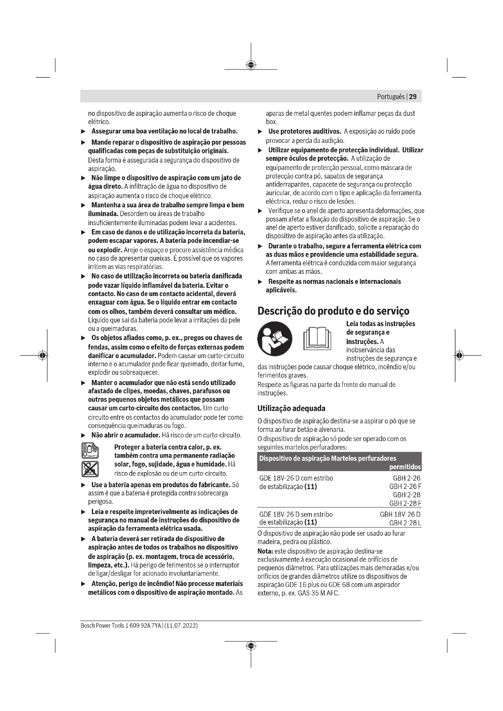 O dispositivo de aspiração não pode ser usado ao furar madeira, pedra ou plástico. Nota: este dispositivo de aspiração destina-se exclusivamente à execução ocasional de orifícios de pequenos diâmetros. Para utilizações mais demoradas e/ou orifícios de grandes diâmetros utilize os dispositivos de aspiração GDE16 plus ou GDE68 com um aspirador externo, p.ex. GAS35MAFC. Bosch Power Tools 1 609 92A 7YA | (11.07.2022)30 | Português Componentes ilustrados A numeração dos componentes ilustrados refere‑se à apresentação do dispositivo de aspiração na página de esquemas. (1) Visor do pó para bucha substituível SDS-plus até 16mm de diâmetro de perfuração (2) Visor do pó para bucha substituível SDS-plus até 26mm de diâmetro de perfuração (3) Visor do pó para bucha fixa SDS-plus até 16mm de diâmetro de perfuração (4) Visor do pó para bucha fixa SDS-plus até 26mm de diâmetro de perfuração (5) Lingueta de bloqueio (6) Encaixe de bloqueio (7) Punho adicional (8) Anel de aperto (9) Suporte de montagem (10) Pinos guia (11) Estribo de estabilização (12) Bateria