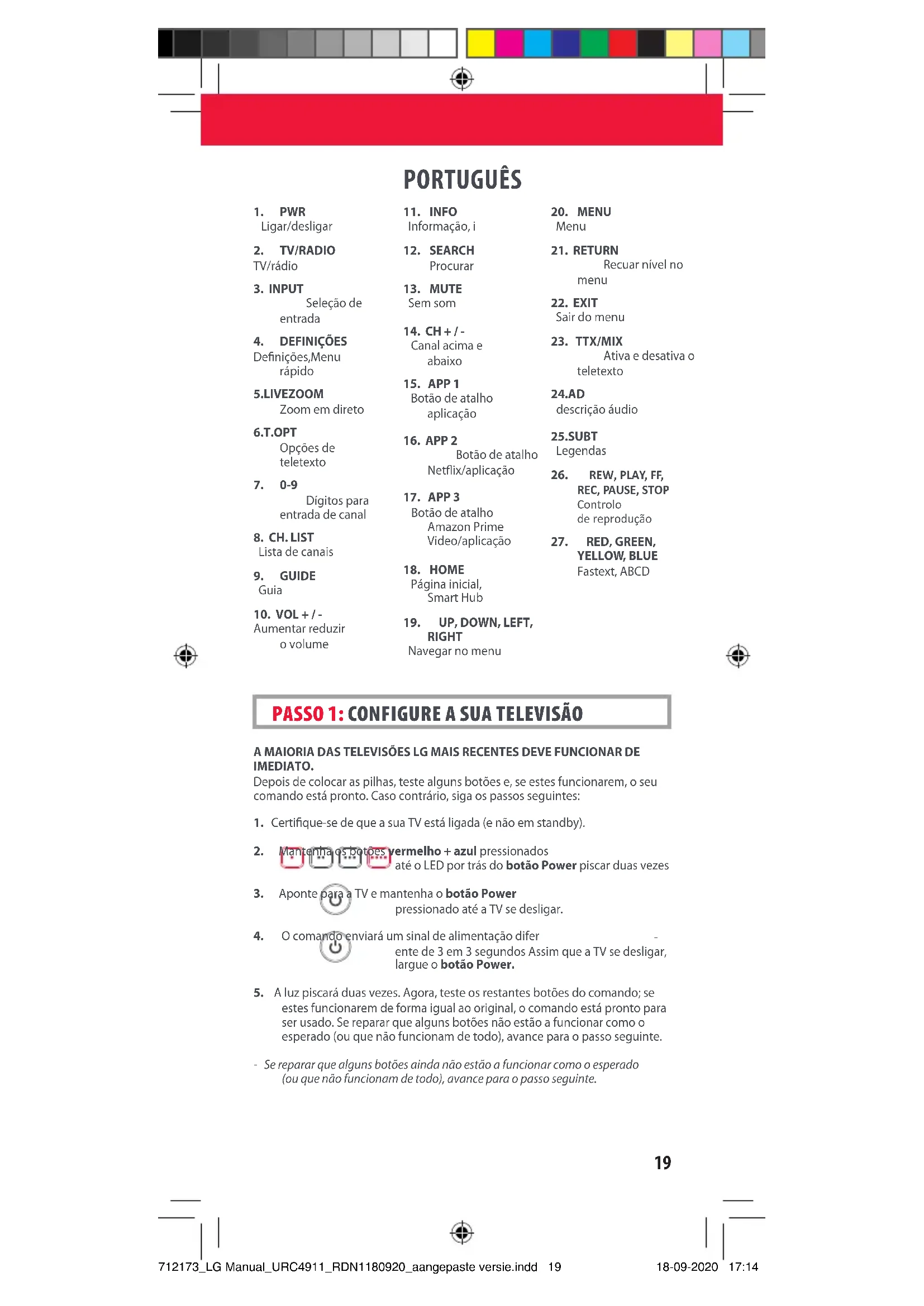 YELLOW, BLUE Fastext, ABCD 712173_LG Manual_URC4911_RDN1180920_aangepaste versie.indd 19712173_LG Manual_URC4911_RDN1180920_aangepaste versie.indd 19 18-09-2020 17:1418-09-2020 17:1420 PORTUGUÊS PROGRAME UMA NOVA FUNÇÃO NO SEU COMANDO Pode programar qualquer função do seu comando original (funcional) no seu comando One For All.1. Coloque o seu comando original e o comando One For All numa superfície plana, frente a frente.2. Para programar: Mantenha os botões VERDE + AMARELO pressionados até o LED piscar duas vezes.3. Pressione 975. O LED piscará duas vezes.4. Pressione o botão do comando One For All que pretende programar, por exemplo: o botão VOL +. O LED piscará rapida mente.5. Pressione o botão no comando original que pretende programar, por exemplo: o botão VOL + do seu dispositivo áudio6. Duas piscadelas: OK. Repita a partir do passo 4 para outros botões que queira programar. Piscadela longa: tente novamente a partir do passo 4.7. Quando tiver programado todos os botões de que precisa, mantenha o botão OK pressionado durante 3 segundos. O LED piscará duas vezes.COMO APAGAR UMA FUNÇÃO PROGRAMADA