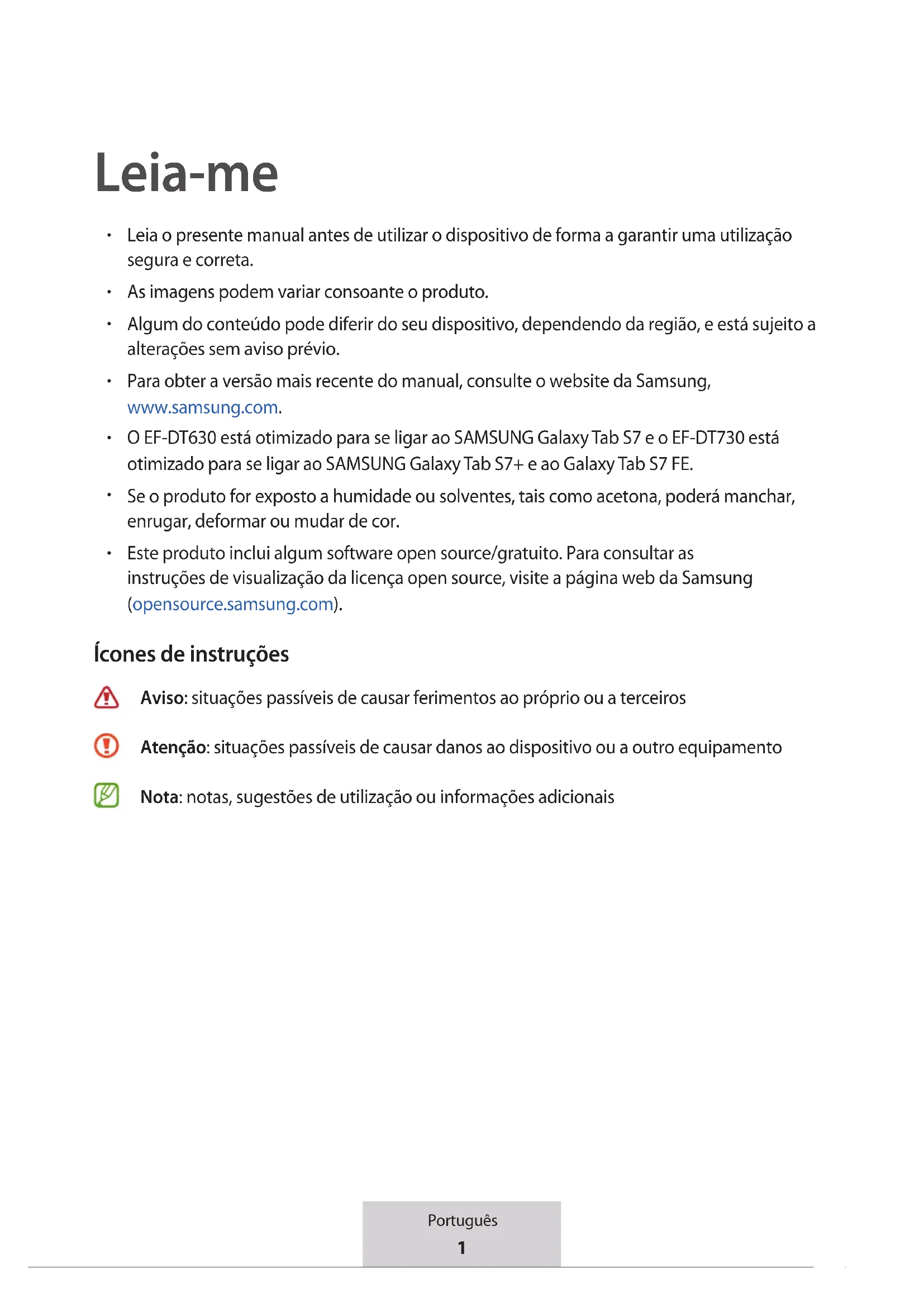 Este produto inclui algum software open source/gratuito. Para consultar as instruções de visualização da licença open source, visite a página web da Samsung (opensource.samsung.com). Ícones de instruções Aviso: situações passíveis de causar ferimentos ao próprio ou a terceiros Atenção: situações passíveis de causar danos ao dispositivo ou a outro equipamento Nota: notas, sugestões de utilização ou informações adicionais2 Português Como começar Conteúdo da embalagem