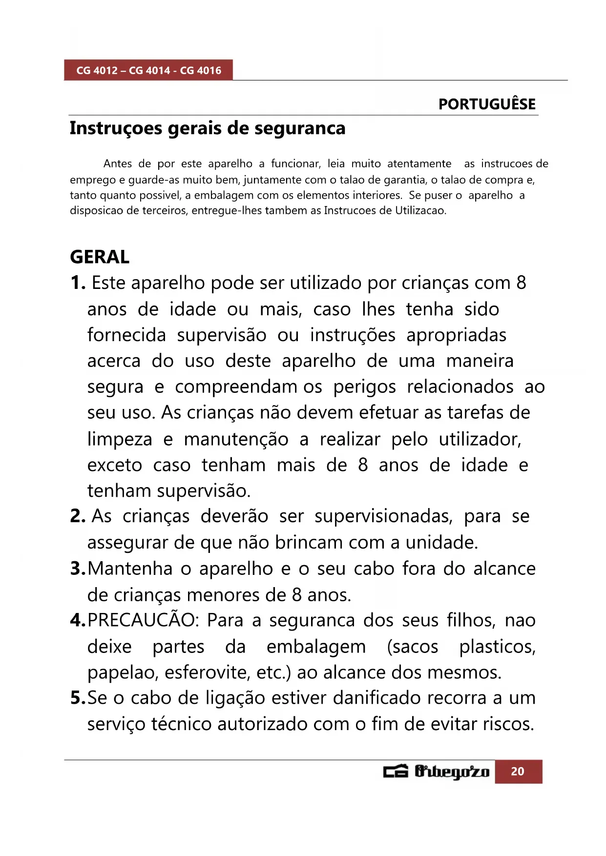 serviço técnico autorizado com o fim de evitar riscos.CG 4012 – CG 4014 - CG 4016