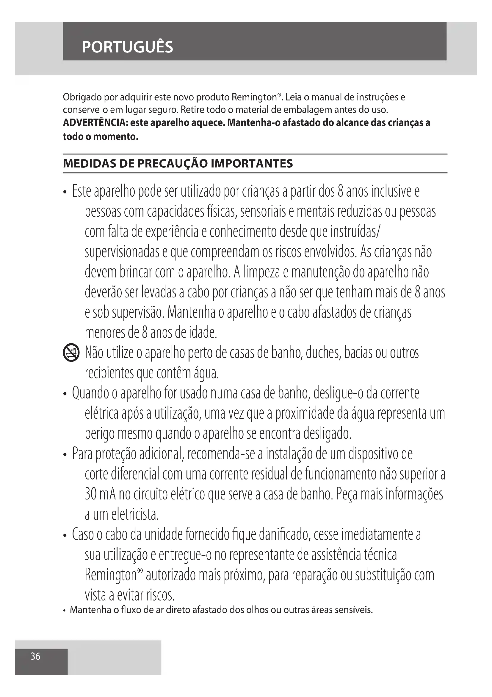 AE36 PORTUGUÊS Obrigado por adquirir este novo produto Remington®. Leia o manual de instruções e conserve-o em lugar seguro. Retire todo o material de embalagem antes do uso. ADVERTÊNCIA: este aparelho aquece. Mantenha-o afastado do alcance das crianças a todo o momento.