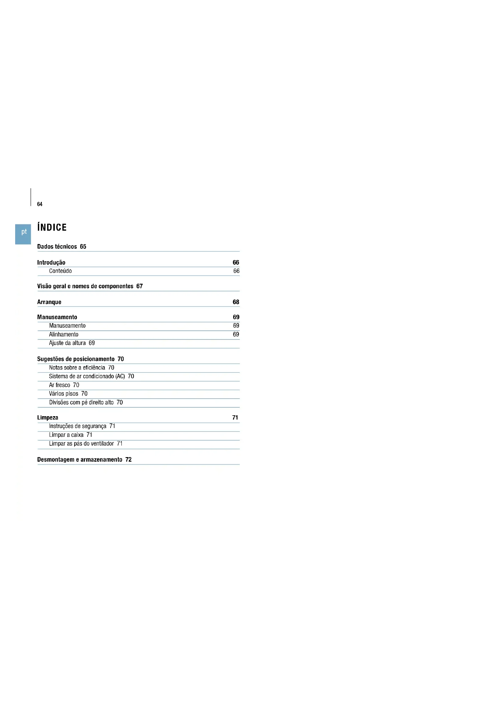 ÍNDICE Dados técnicos 65 Introdução 66 Conteúdo 66 Visão geral e nomes de componentes 67 Arranque 68 Manuseamento 69 Manuseamento 69 Alinhamento 69 Ajuste da altura 69 Sugestões de posicionamento 70 Notas sobre a eficiência 70 Sistema de ar condicionado (AC) 70 Ar fresco 70 Vários pisos 70 Divisões com pé direito alto 70 Limpeza 71 Instruções de segurança 71 Limpar a caixa 71 Limpar as pás do ventilador 71 Desmontagem e armazenamento 7265