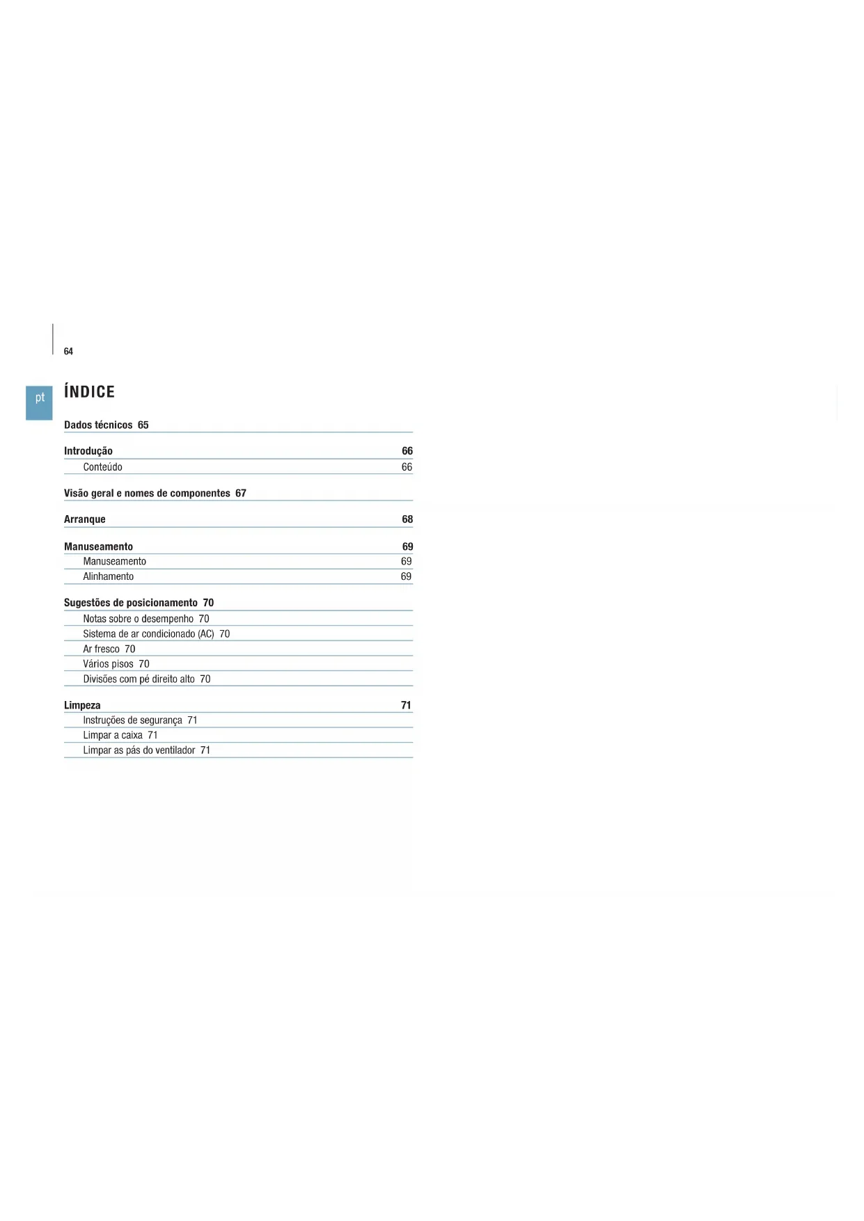 ÍNDICE Dados técnicos 65 Introdução 66 Conteúdo 66 Visão geral e nomes de componentes 67 Arranque 68 Manuseamento 69 Manuseamento 69 Alinhamento 69 Sugestões de posicionamento 70 Notas sobre o desempenho 70 Sistema de ar condicionado (AC) 70 Ar fresco 70 Vários pisos 70 Divisões com pé direito alto 70 Limpeza 71 Instruções de segurança 71 Limpar a caixa 71 Limpar as pás do ventilador 7165