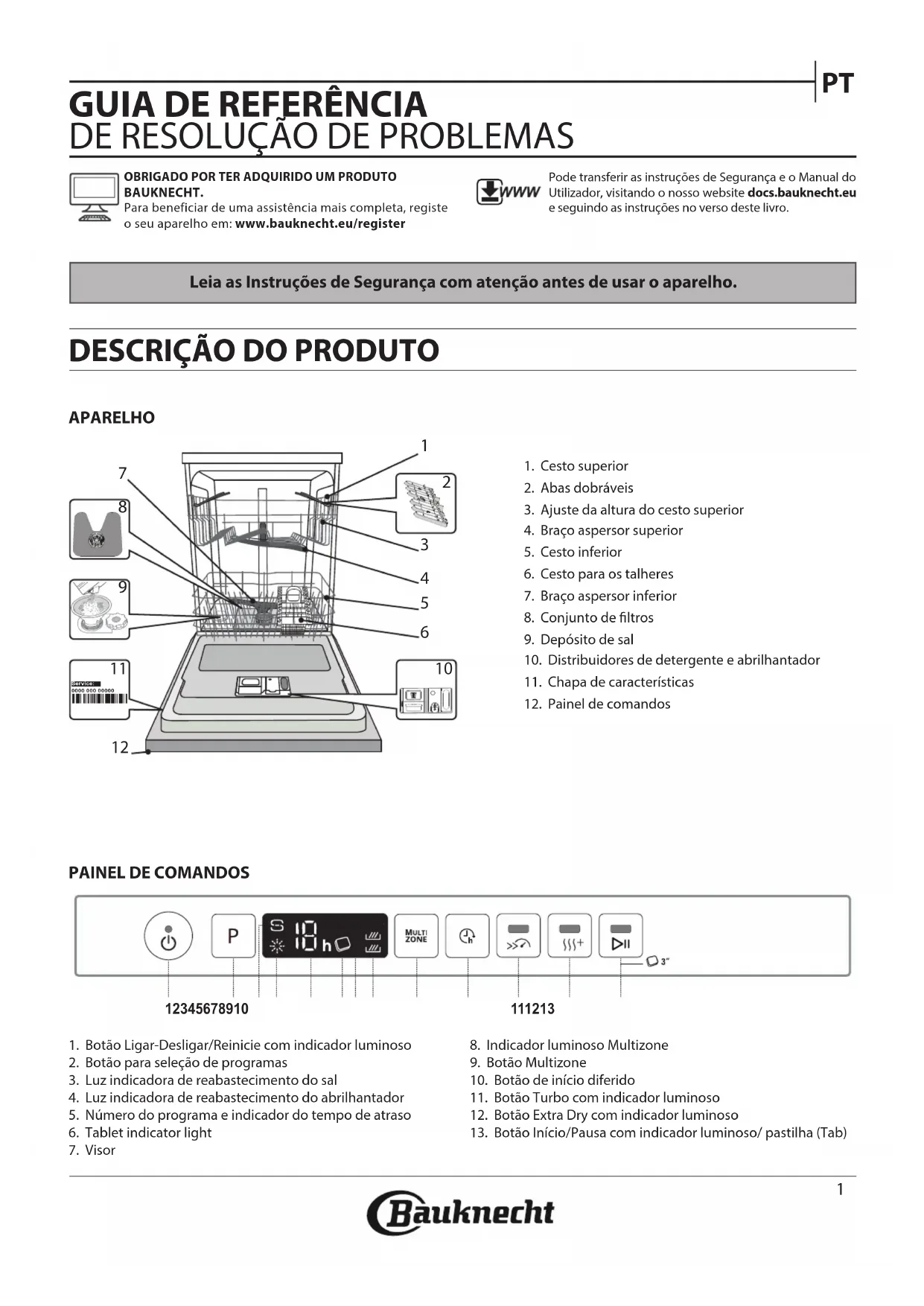 OBRIGADO POR TER ADQUIRIDO UM PRODUTO BAUKNECHT.Para beneficiar de uma assistência mais completa, registe o seu aparelho em: www.bauknecht.eu/registerPode transferir as instruções de Segurança e o Manual do Utilizador, visitando o nosso website docs.bauknecht.eu e seguindo as instruções no verso deste livro.1 2 3 4 5 6 7 8 9 1011 12 130000 000 00000 Service: