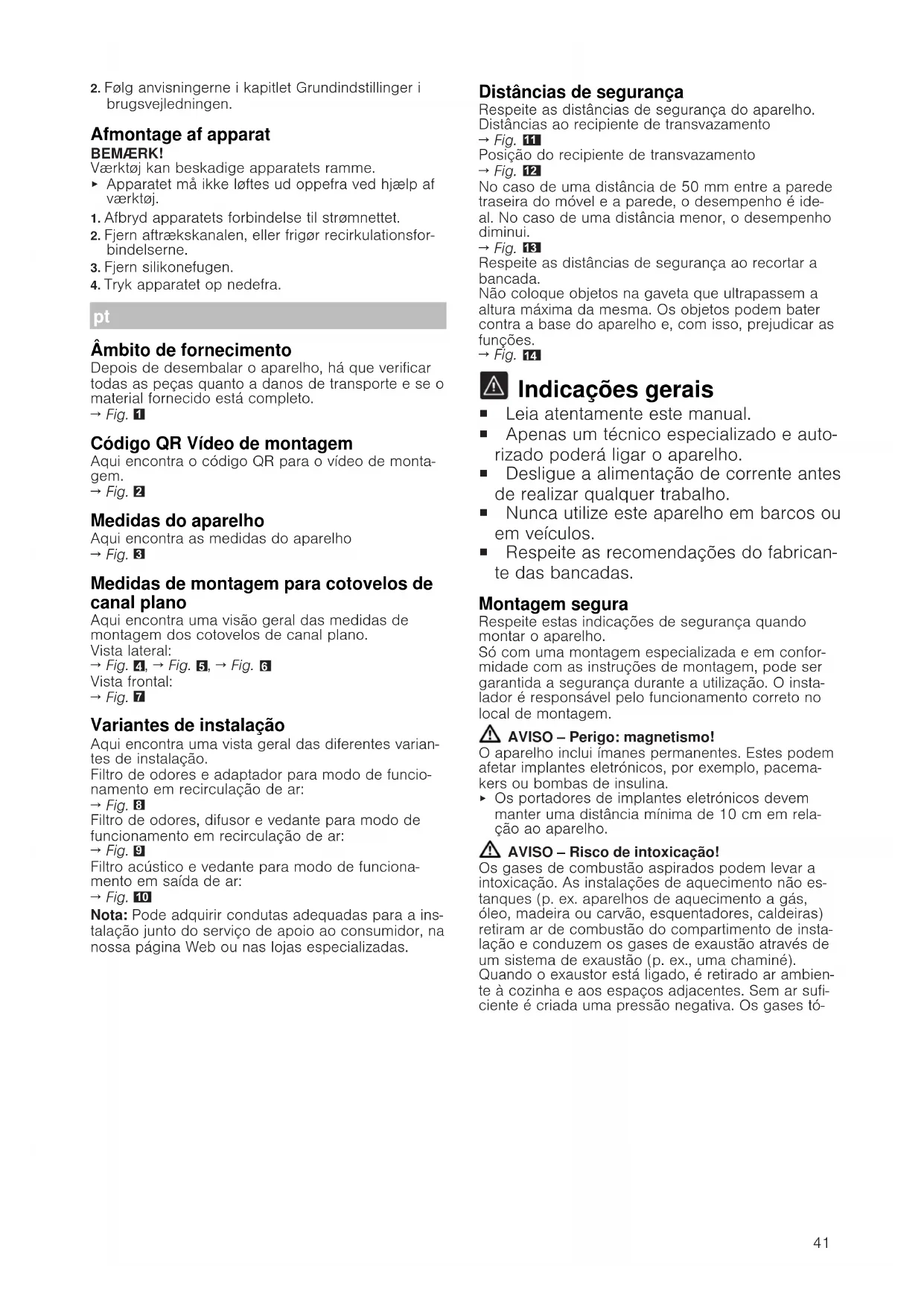Indicações gerais ¡ Leia atentamente este manual. ¡ Apenas um técnico especializado e auto- rizado poderá ligar o aparelho. ¡ Desligue a alimentação de corrente antes de realizar qualquer trabalho. ¡ Nunca utilize este aparelho em barcos ou em veículos. ¡ Respeite as recomendações do fabrican- te das bancadas. Montagem segura Respeite estas indicações de segurança quando montar o aparelho. Só com uma montagem especializada e em confor- midade com as instruções de montagem, pode ser garantida a segurança durante a utilização. O insta- lador é responsável pelo funcionamento correto no local de montagem. AVISO‒Perigo: magnetismo! O aparelho inclui ímanes permanentes. Estes podem afetar implantes eletrónicos, por exemplo, pacema- kers ou bombas de insulina.