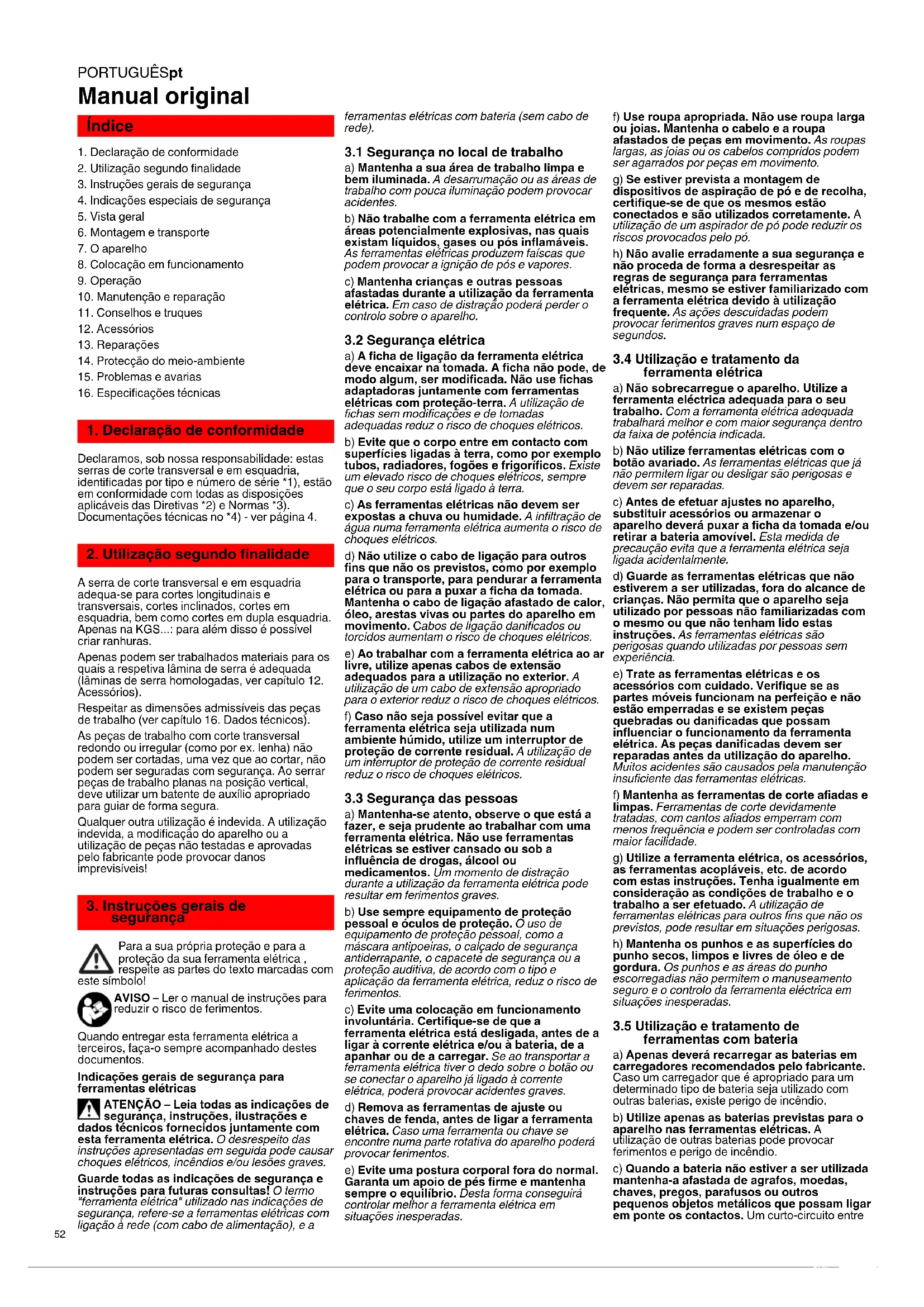 Declaramos, sob nossa responsabilidade: estas serras de corte transversal e em esquadria, identificadas por tipo e número de série *1), estão em conformidade com todas as disposições aplicáveis das Diretivas *2) e Normas *3). Documentações técnicas no *4) - ver página 4. A serra de corte transversal e em esquadria adequa-se para cortes longitudinais e transversais, cortes inclinados, cortes em esquadria, bem como cortes em dupla esquadria. Apenas na KGS...: para além disso é possível criar ranhuras. Apenas podem ser trabalhados materiais para os quais a respetiva lâmina de serra é adequada (lâminas de serra homologadas, ver capítulo 12. Acessórios). Respeitar as dimensões admissíveis das peças de trabalho (ver capítulo 16. Dados técnicos). As peças de trabalho com corte transversal redondo ou irregular (como por ex. lenha) não podem ser cortadas, uma vez que ao cortar, não podem ser seguradas com segurança. Ao serrar peças de trabalho planas na posição vertical, deve utilizar um batente de auxílio apropriado para guiar de forma segura. Qualquer outra utilização é indevida. A utilização indevida, a modificação do aparelho ou a utilização de peças não testadas e aprovadas pelo fabricante pode provocar danos imprevisíveis! Para a sua própria proteção e para a proteção da sua ferramenta elétrica , respeite as partes do texto marcadas com este símbolo! AVISO – Ler o manual de instruções para reduzir o risco de ferimentos. Quando entregar esta ferramenta elétrica a terceiros, faça-o sempre acompanhado destes documentos. Indicações gerais de segurança para ferramentas elétricas ATENÇÃO – Leia todas as indicações de segurança, instruções, ilustrações e dados técnicos fornecidos juntamente com esta ferramenta elétrica. O desrespeito das instruções apresentadas em seguida pode causar choques elétricos, incêndios e/ou lesões graves. Guarde todas as indicações de segurança e instruções para futuras consultas! O termo "ferramenta elétrica" utilizado nas indicações de segurança, refere-se a ferramentas elétricas com ligação à rede (com cabo de alimentação), e a ferramentas elétricas com bateria (sem cabo de rede).