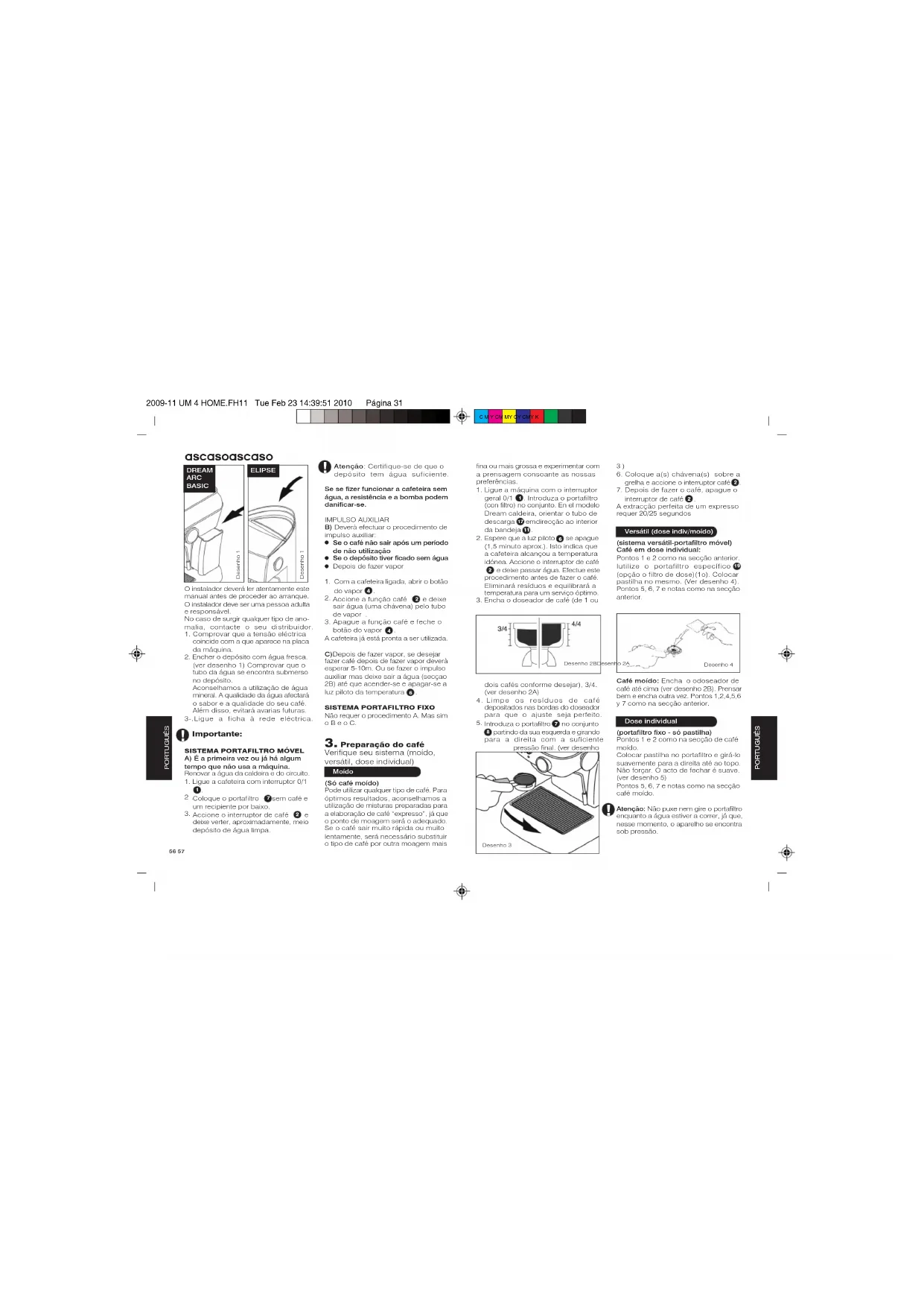 32009-11 UM 4 HOME.FH11 Tue Feb 23 14:39:51 2010 Página 31 C M Y CM MY CY CMY KO instalador deverá ler atentamente estemanual antes de proceder ao arranque.O instalador deve ser uma pessoa adultae responsável.No caso de surgir qualquer tipo de anomalia, contacte o seu distribuidor.1. Comprovar que a tensão eléctricacoincide com a que aparece na placada máquina.2. Encher o depósito com água fresca.(ver desenho 1) Comprovar que otubo da água se encontra submersono depósito.Aconselhamos a utilização de águamineral. A qualidade da água afectaráo sabor e a qualidade do seu café.Além disso, evitará avarias futuras.3-.Ligue a ficha à rede eléctrica. Importante: SISTEMA PORTAFILTRO MÓVELA) É a primeira vez ou já há algumtempo que não usa a máquina.Renovar a água da caldeira e do circuito.1. Ligue a cafeteira com interruptor 0/1